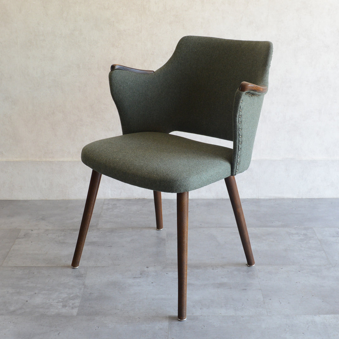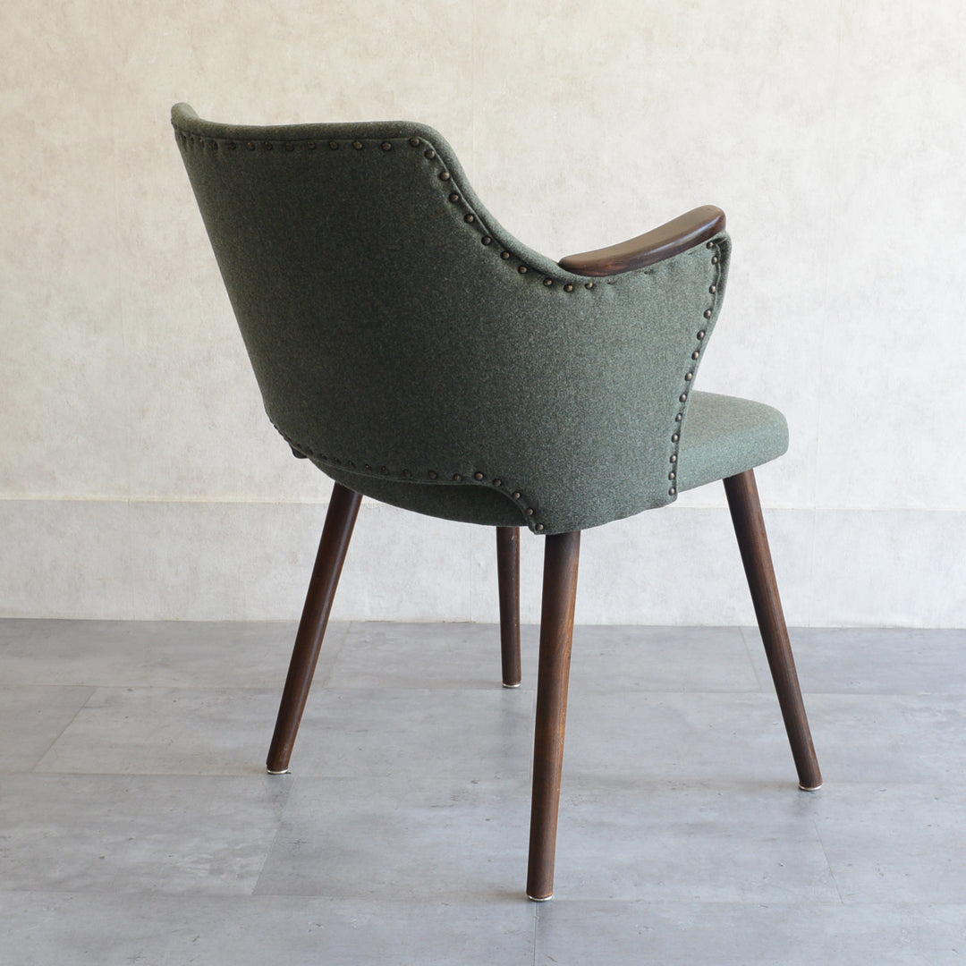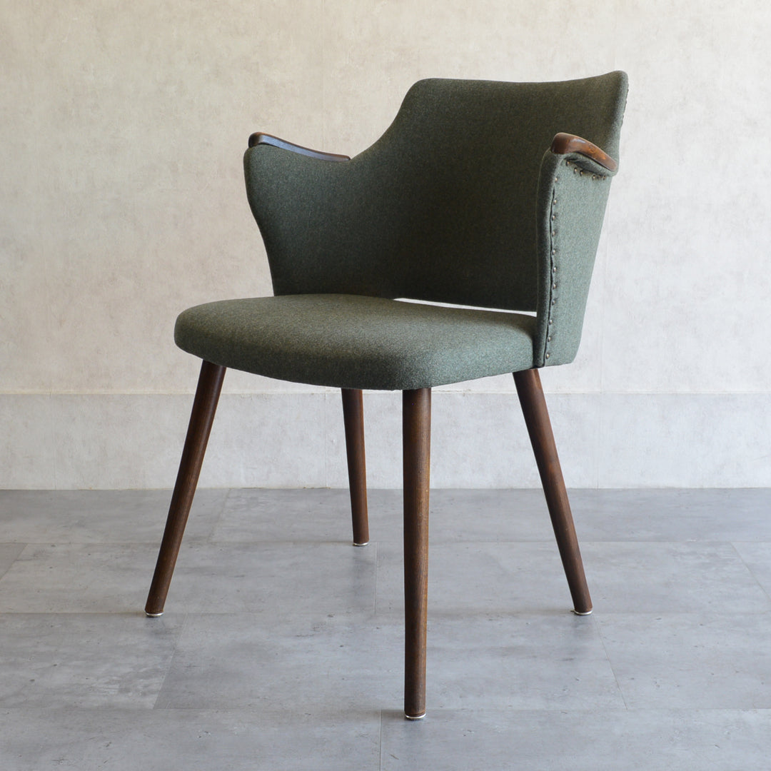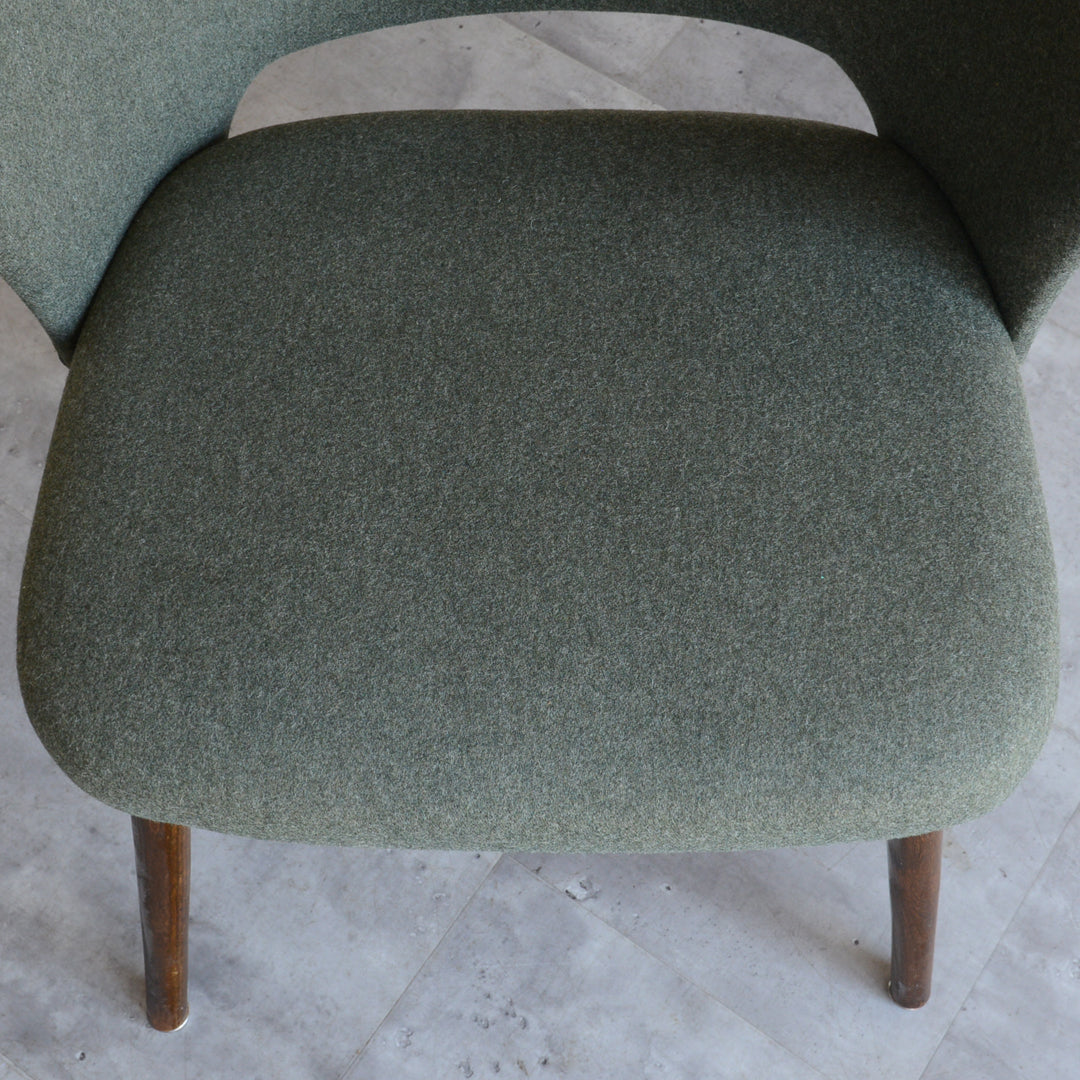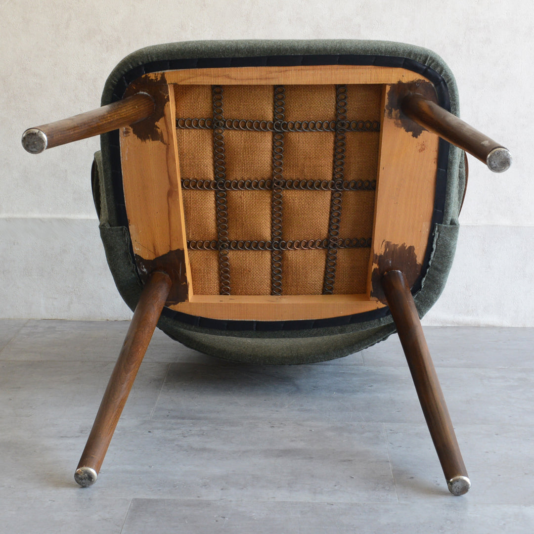 座面は落ち着いたモスグリーンのファブリックで新たに張替済です。