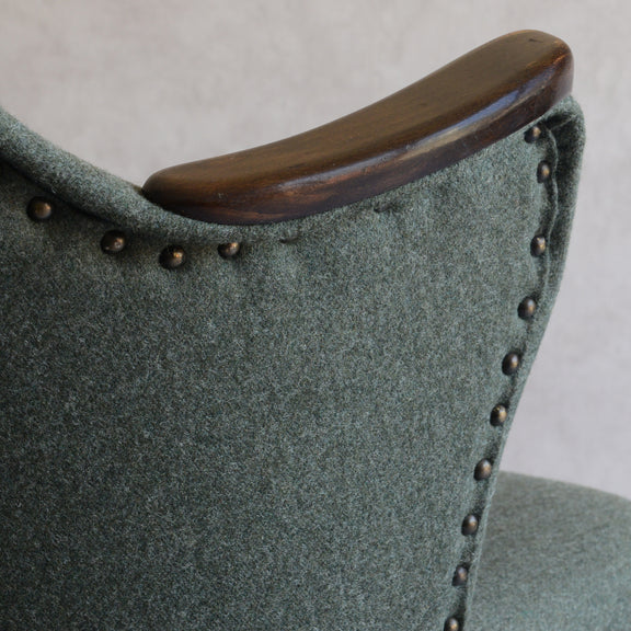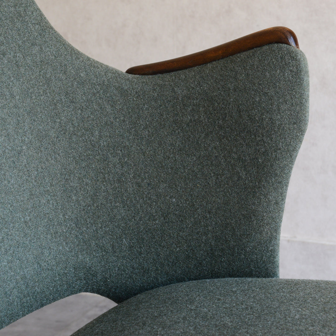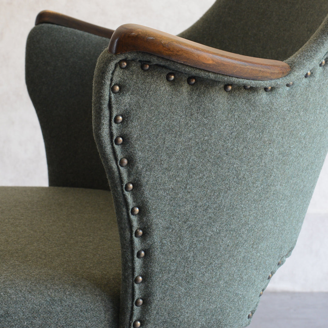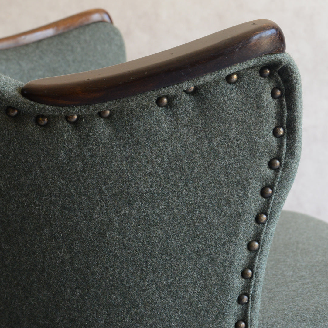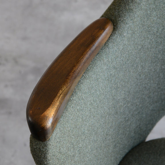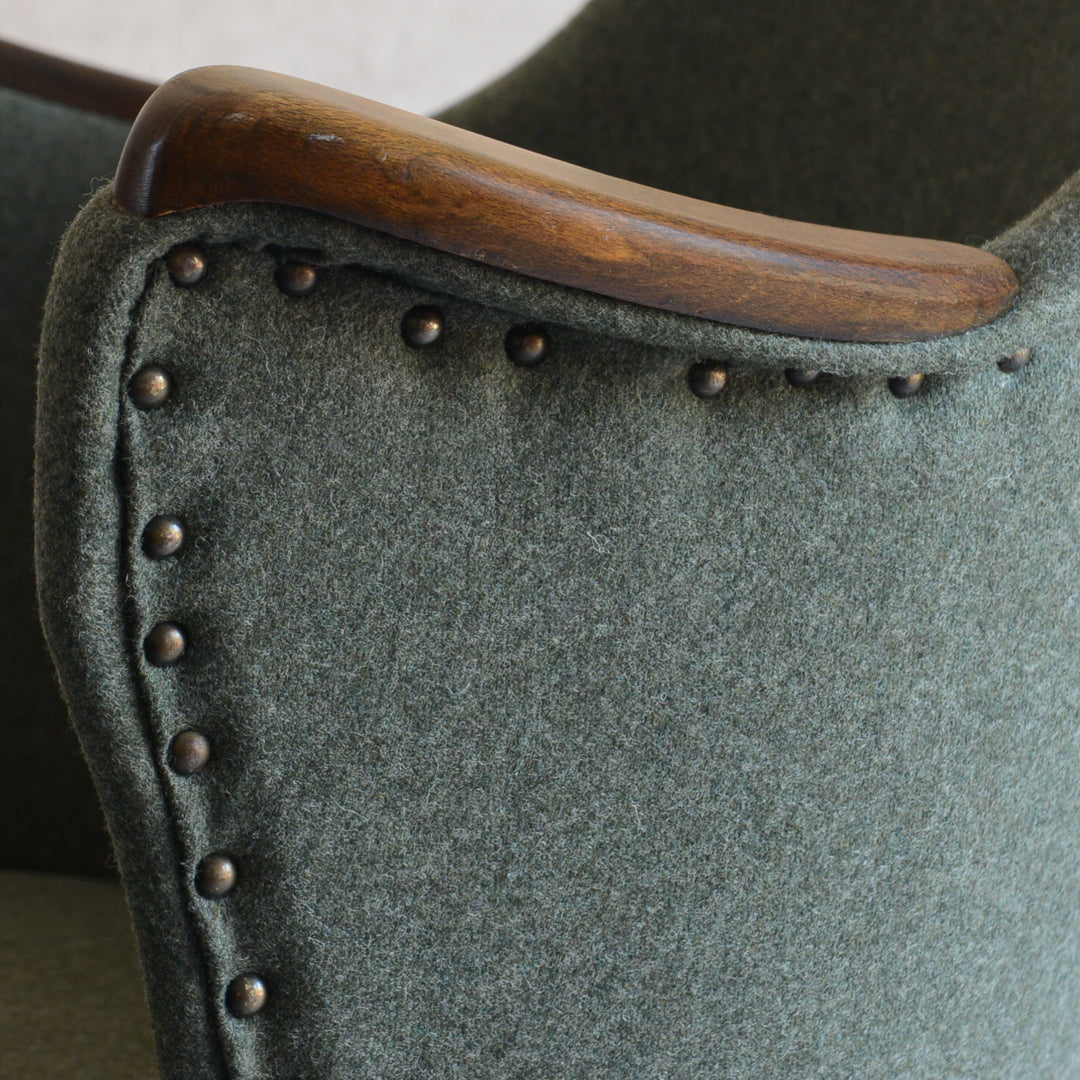 座面は落ち着いたモスグリーンのファブリックで新たに張替済です。