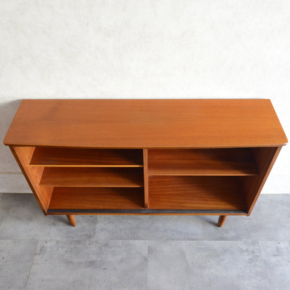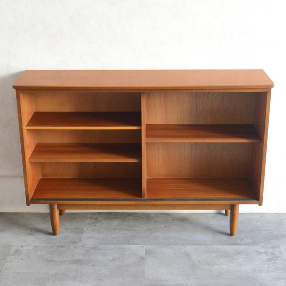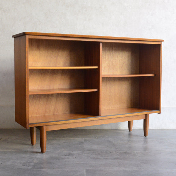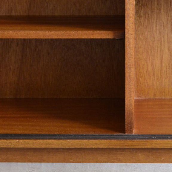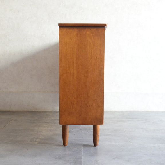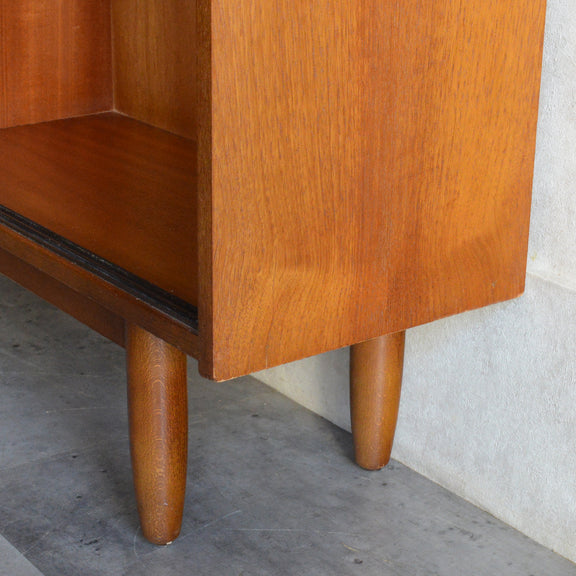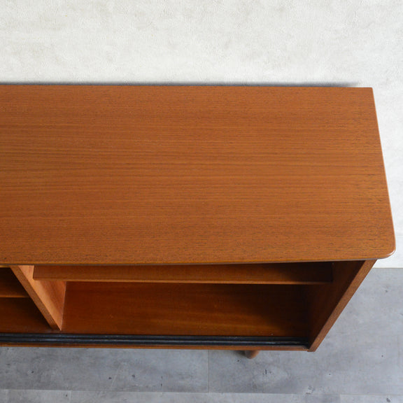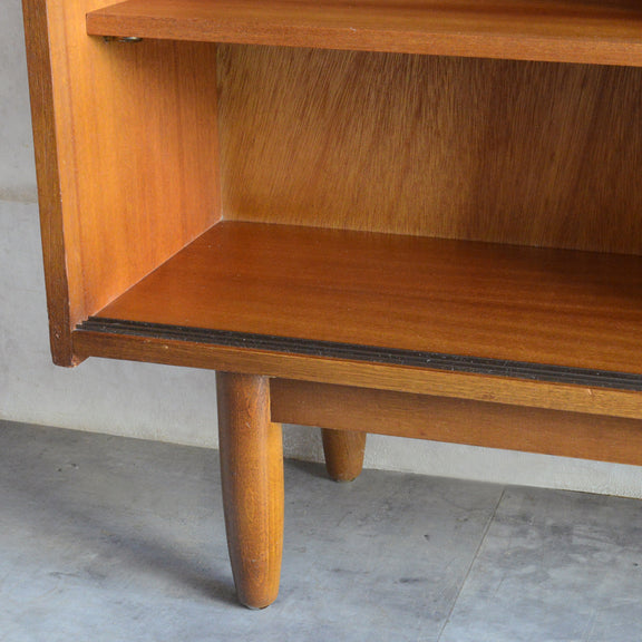 ミッドセンチュリーデザインらしい丸脚が印象的なガラスキャビネット。