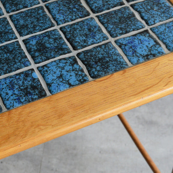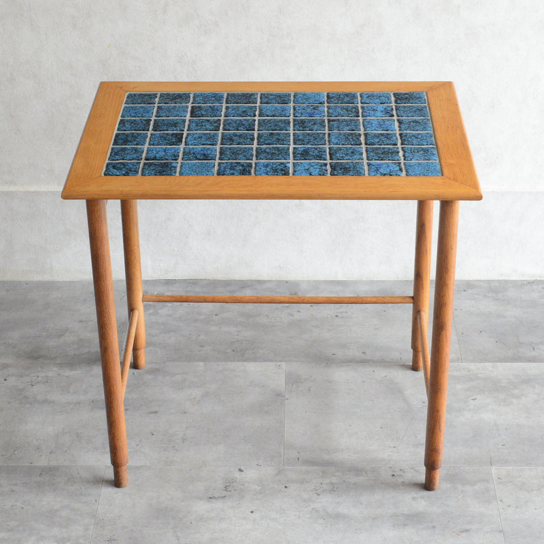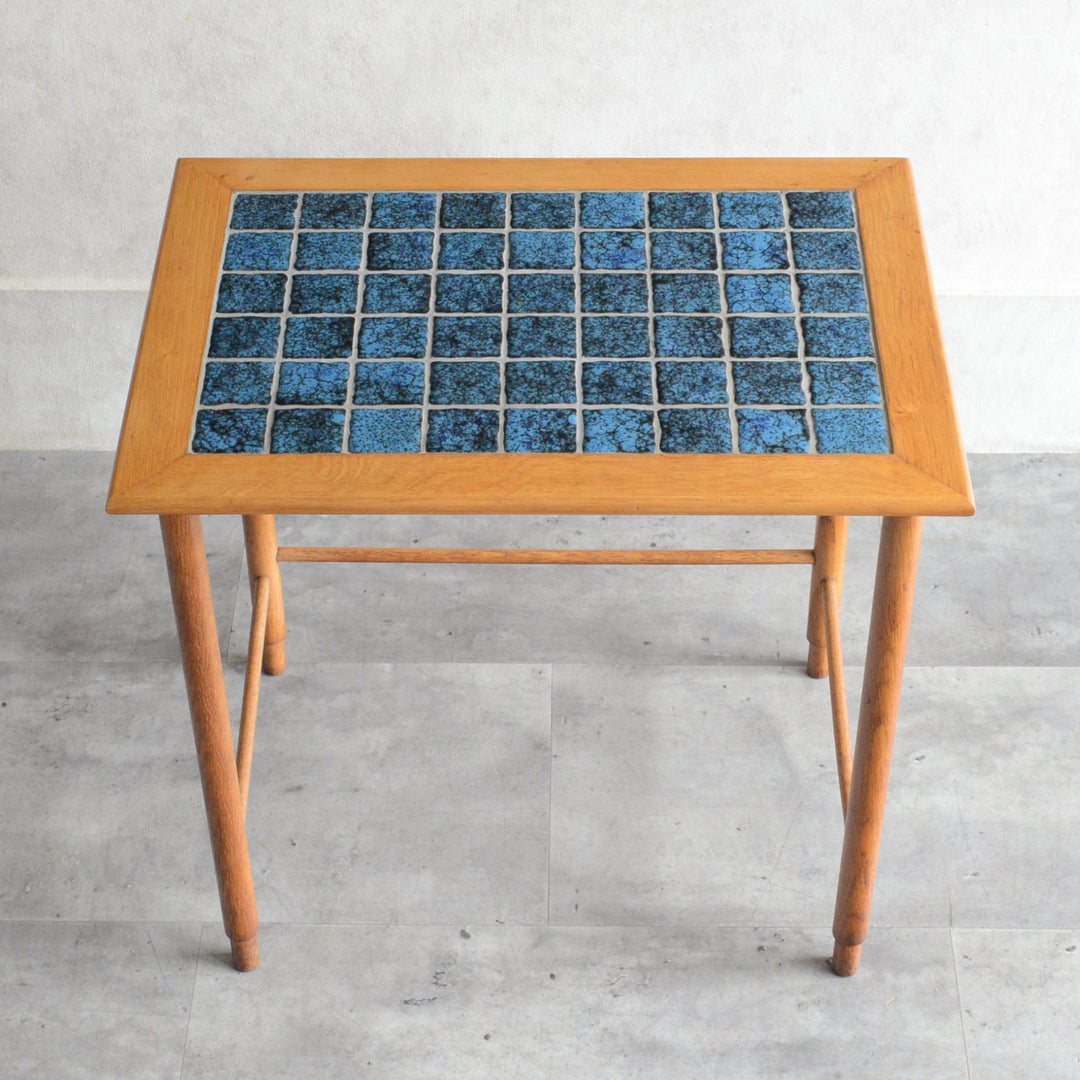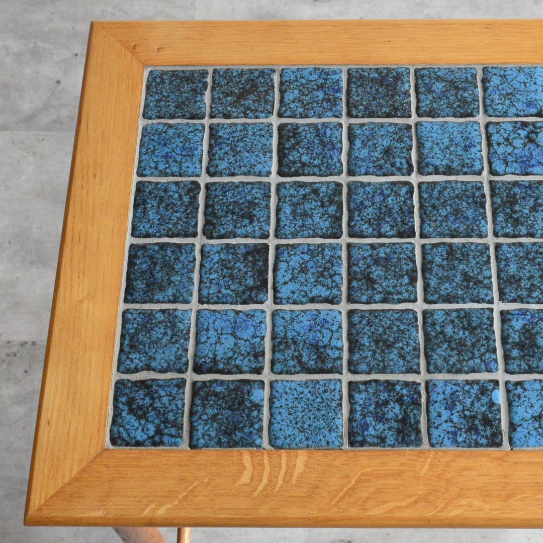 ヴィンテージオークのフレームにブルーグラデーションのタイルが印象的。