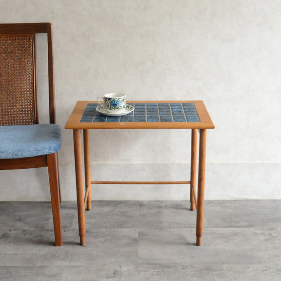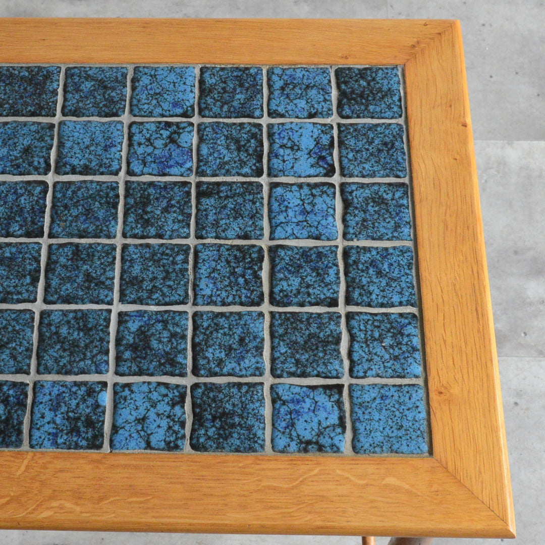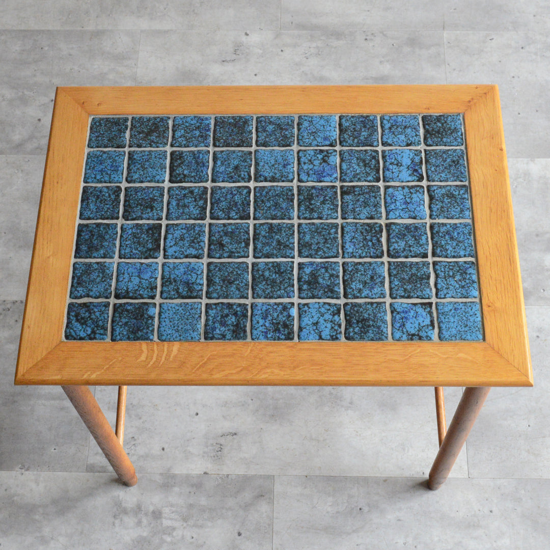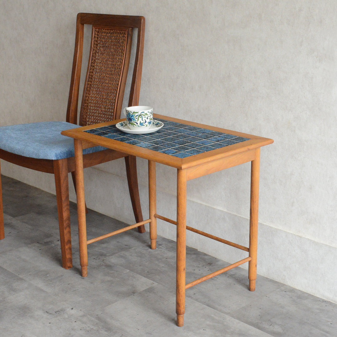 ヴィンテージオークのフレームにブルーグラデーションのタイルが印象的。