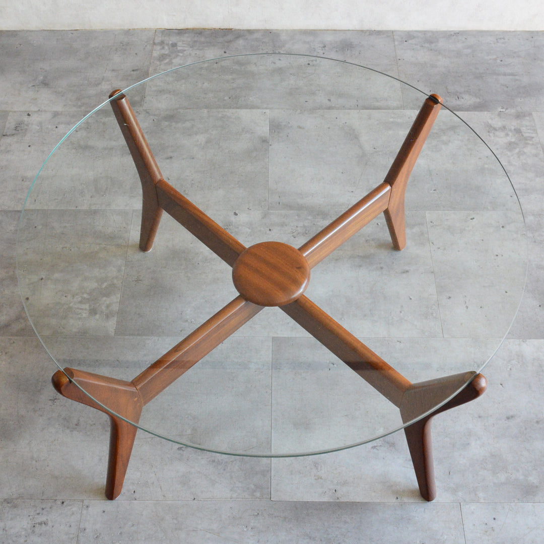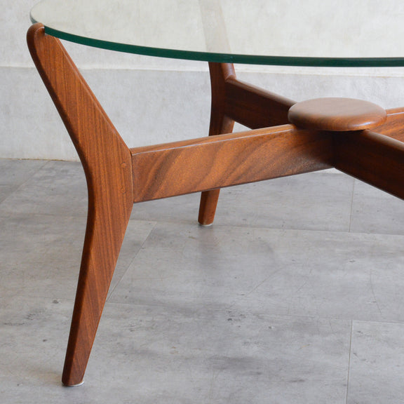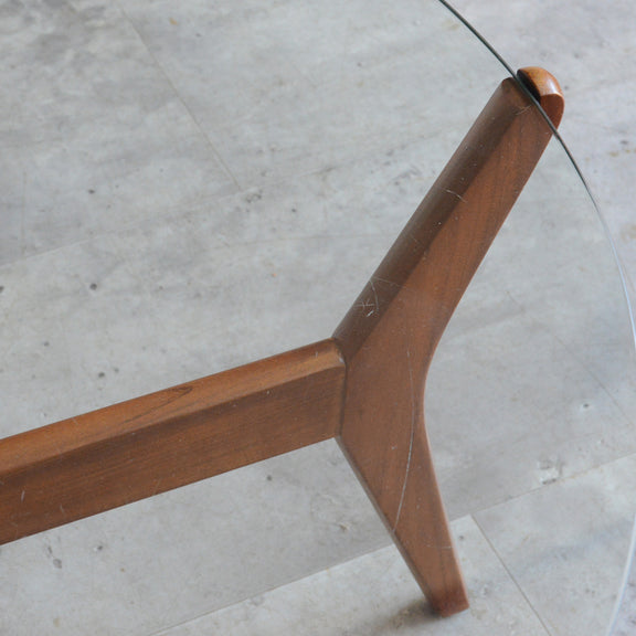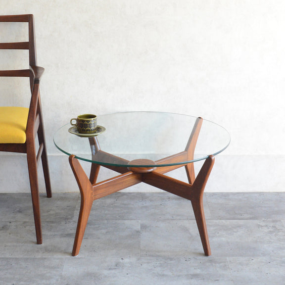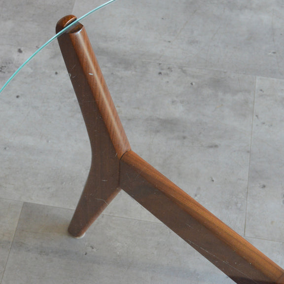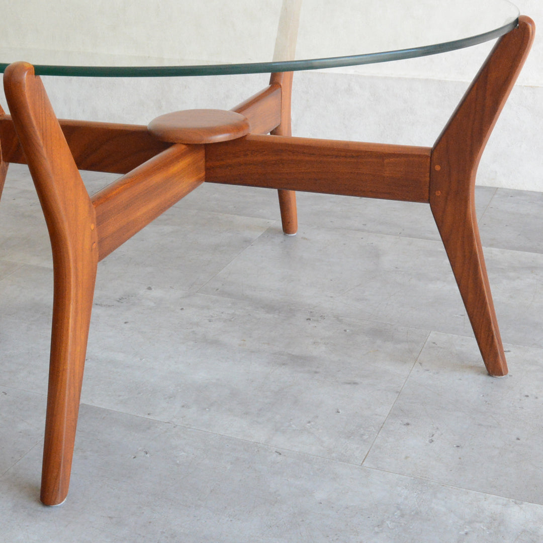 ガラス天板下のチーク材脚部のデザインが秀逸で、随所に造りの良さが感じられるセンターテーブル