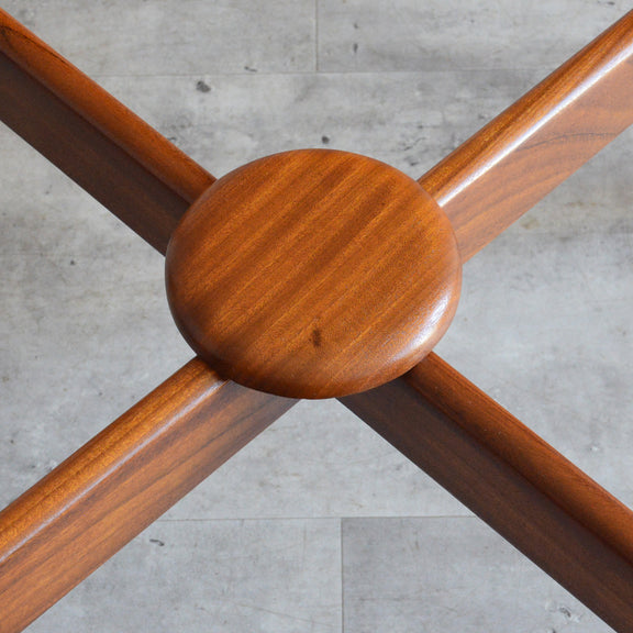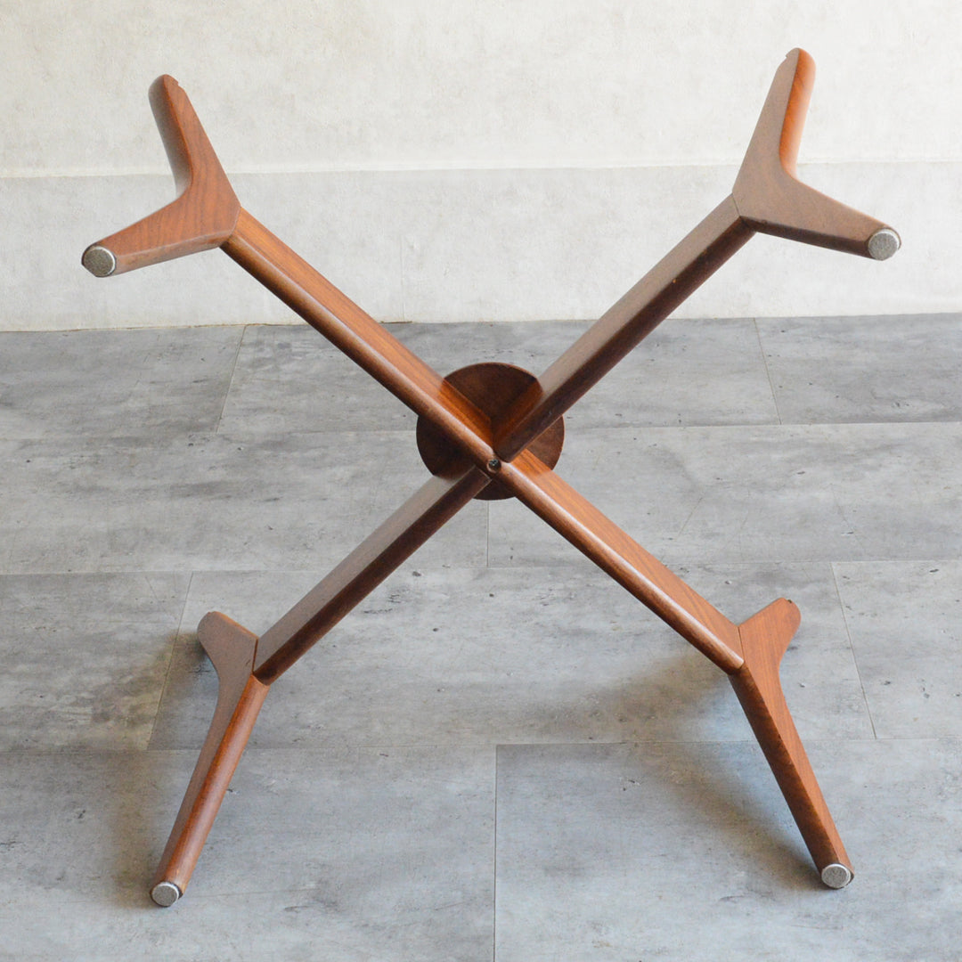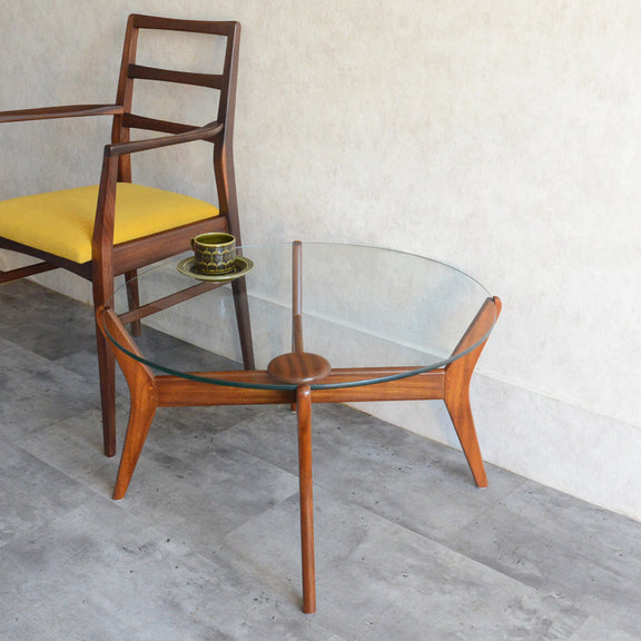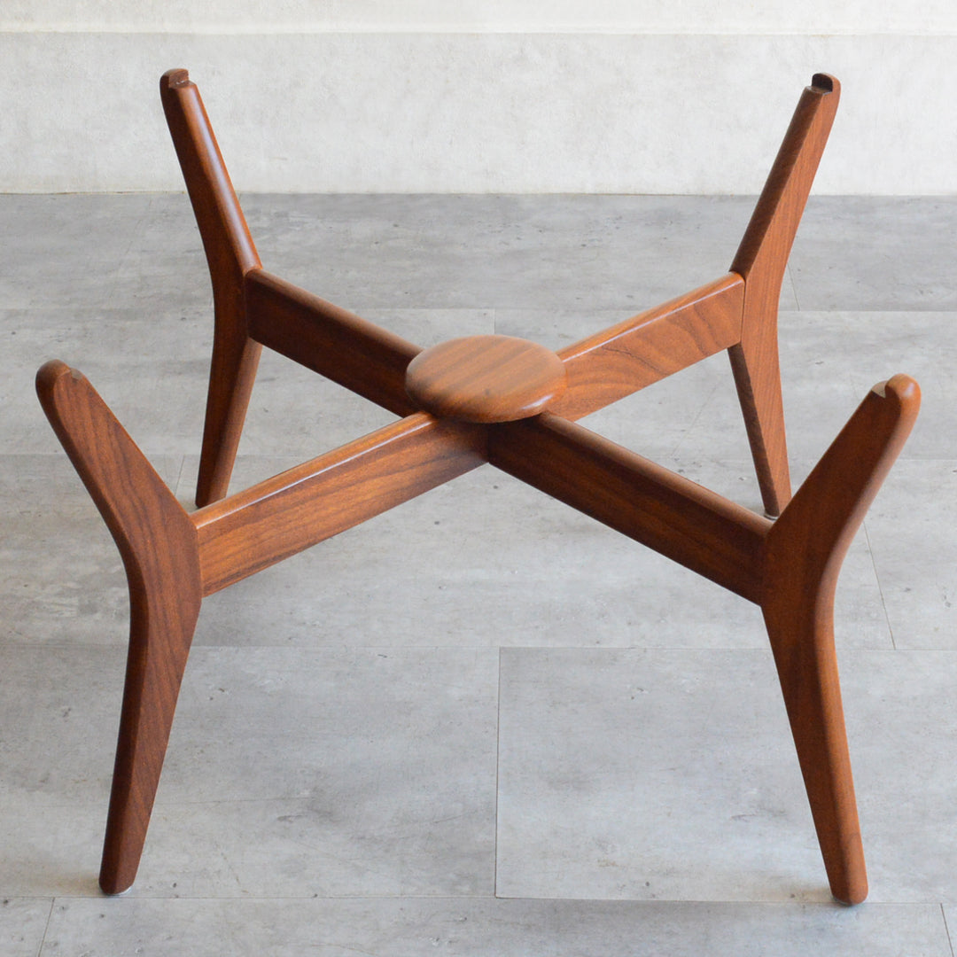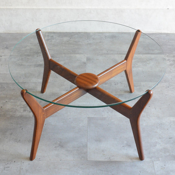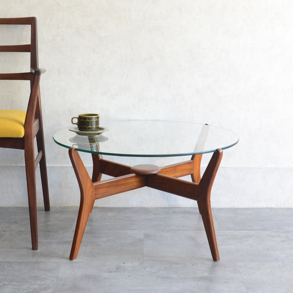 ガラス天板下のチーク材脚部のデザインが秀逸で、随所に造りの良さが感じられるセンターテーブル