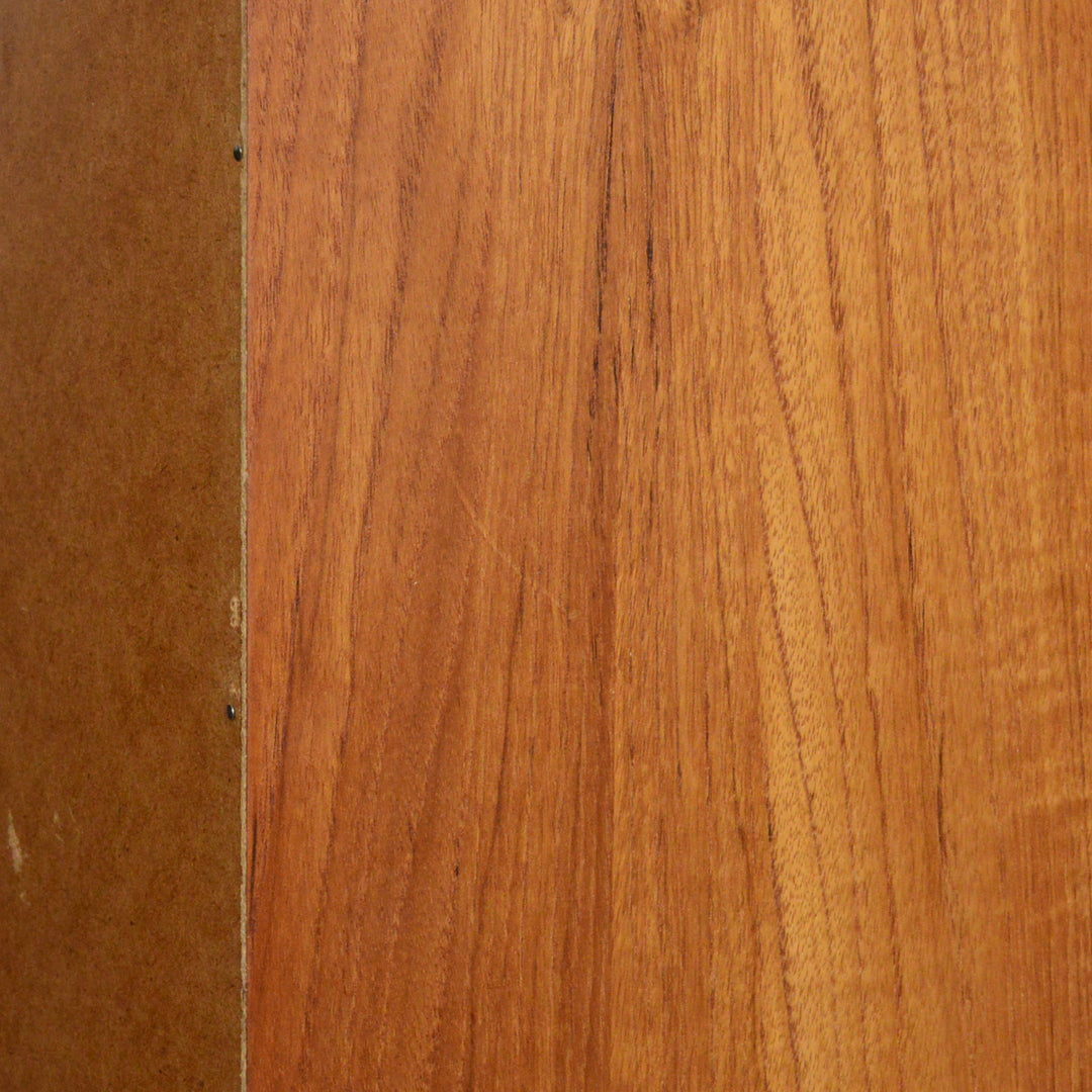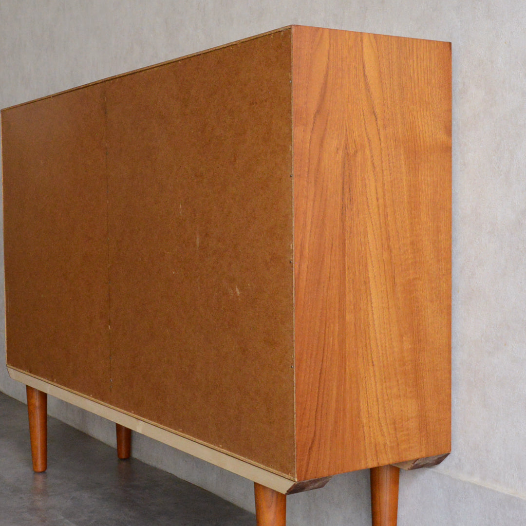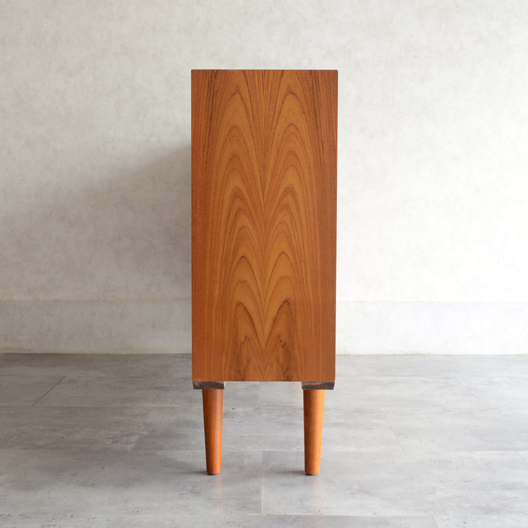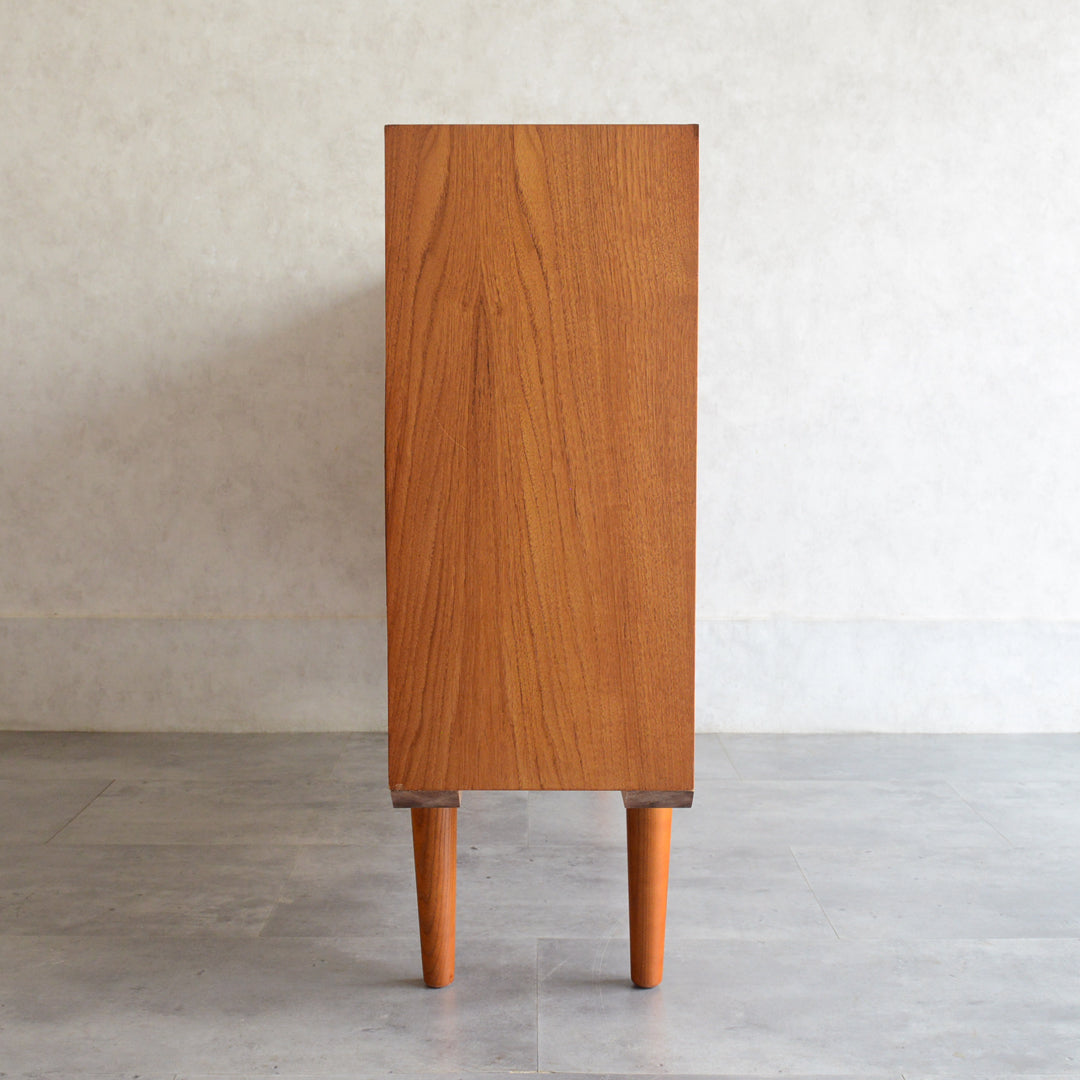 テーパーの丸脚とチークの杢目が落ち着いた佇まいの北欧デザインのオープンシェルフ