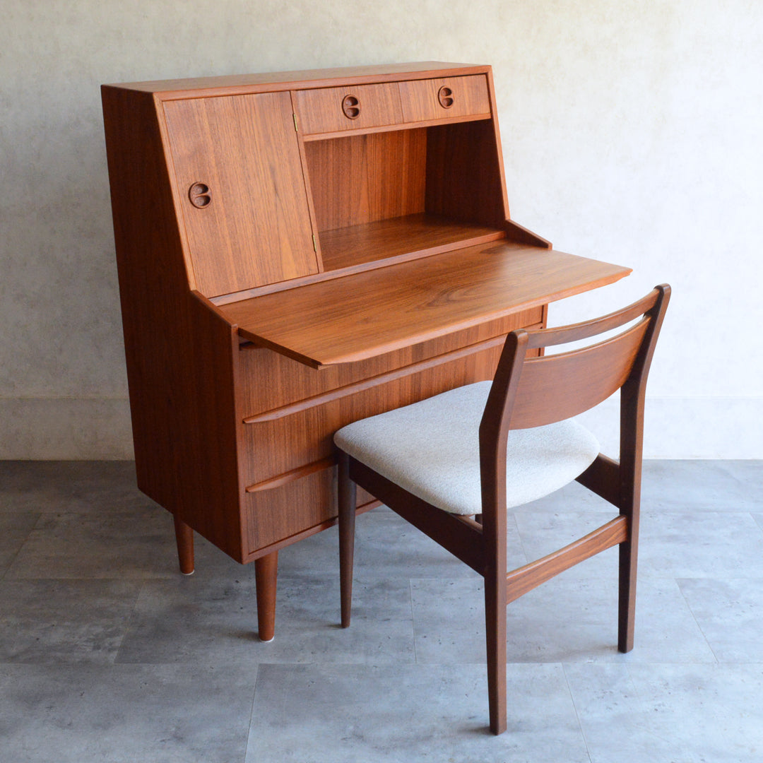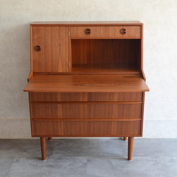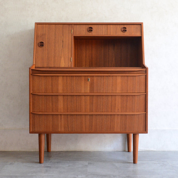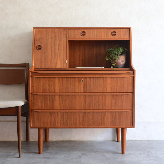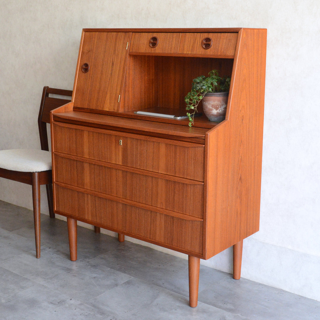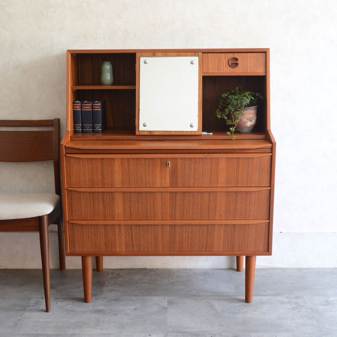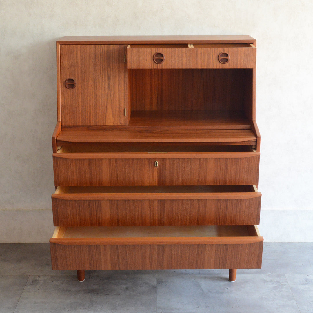 北欧のビューローは机の天板を開くのでは無く、スライド式に手前に引くタイプが大半です。 机として使用しない場合には天板を押し込むだけで棚付きのチェストとしてリビングの美観を損ないません。