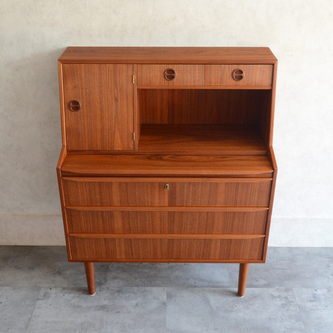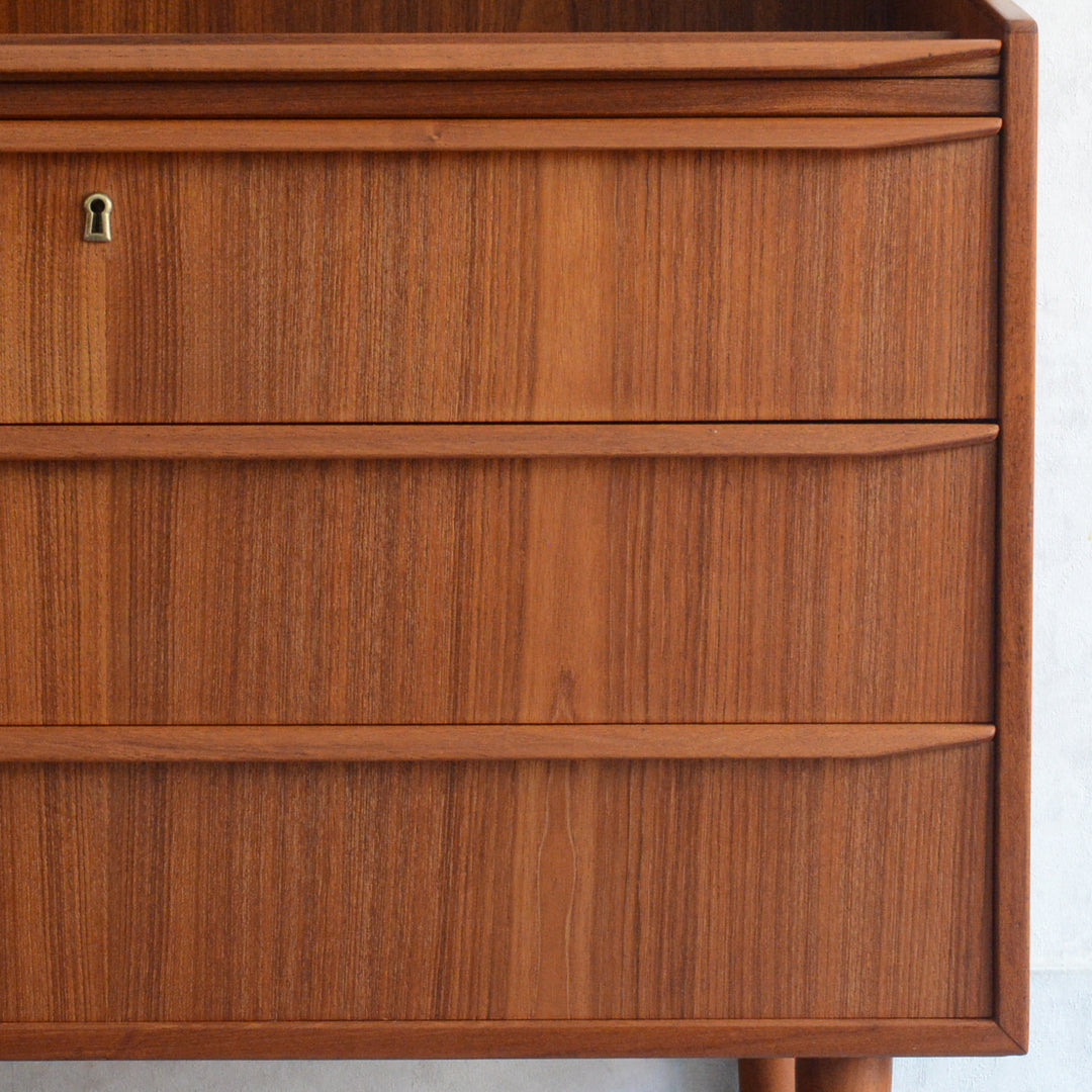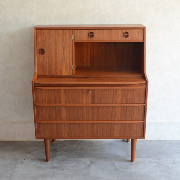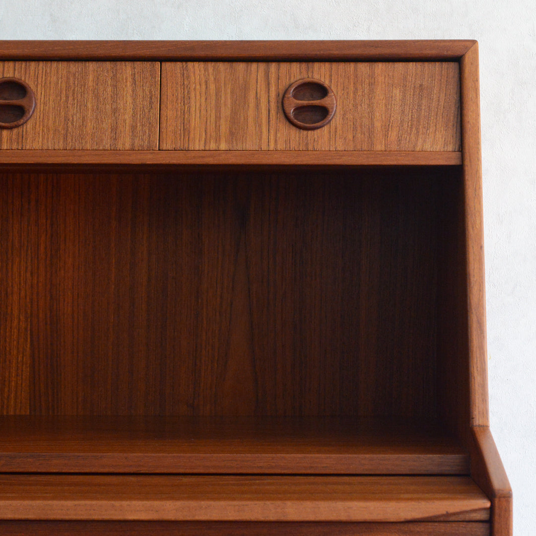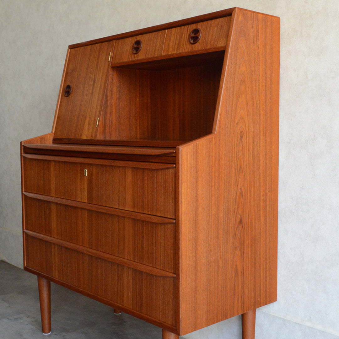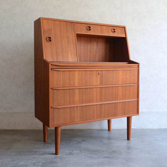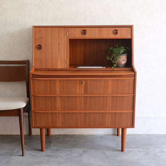 北欧のビューローは机の天板を開くのでは無く、スライド式に手前に引くタイプが大半です。 机として使用しない場合には天板を押し込むだけで棚付きのチェストとしてリビングの美観を損ないません。