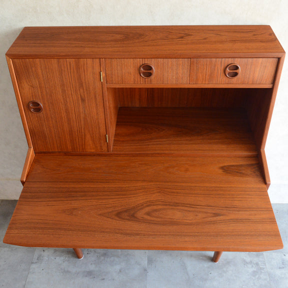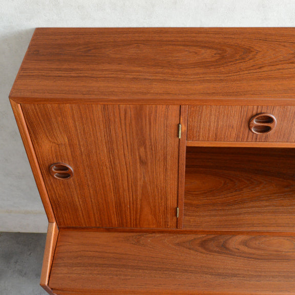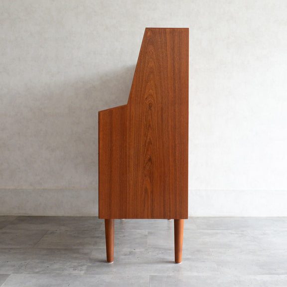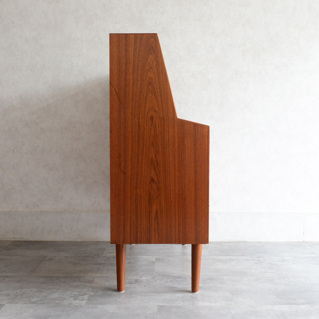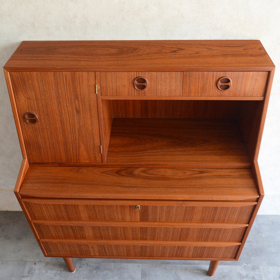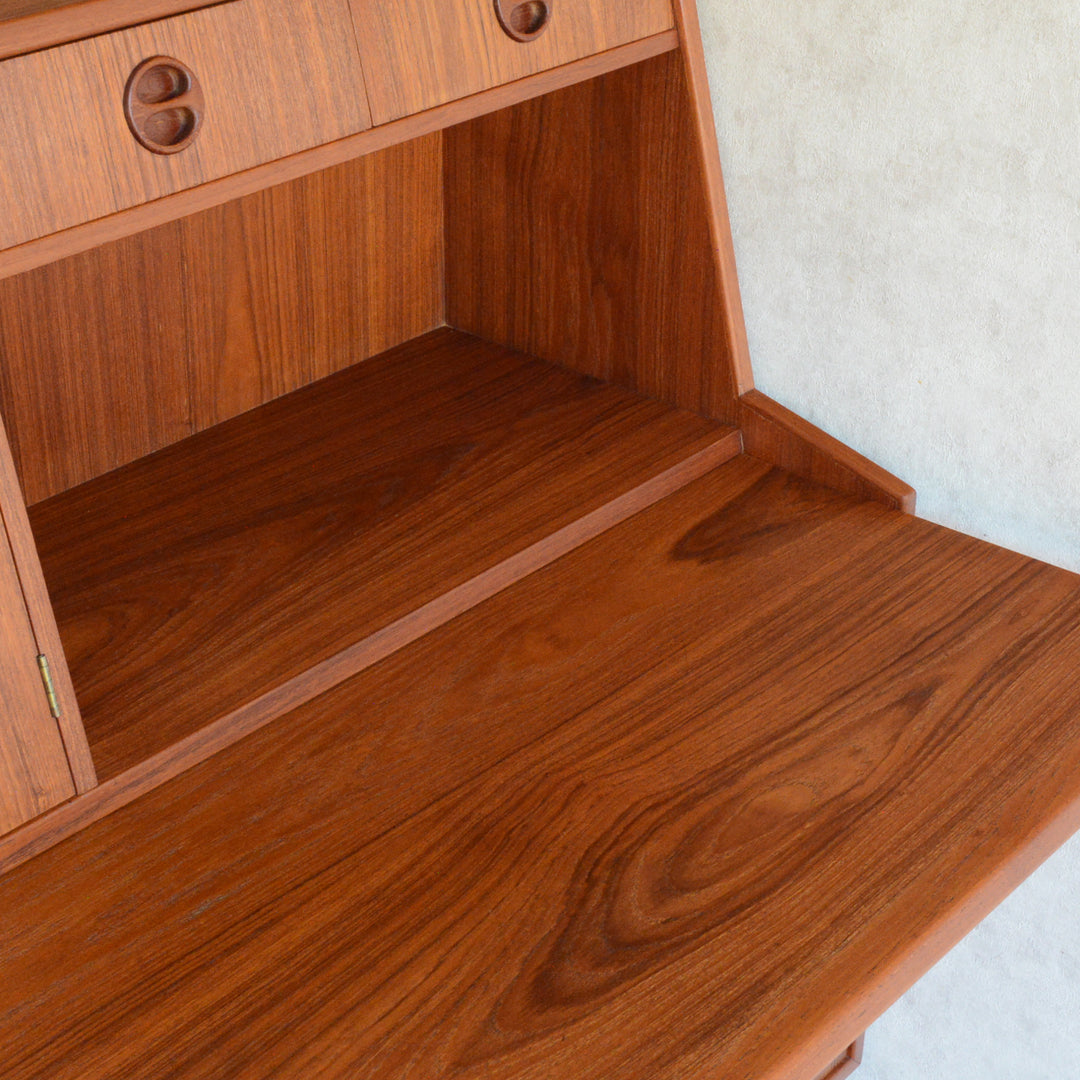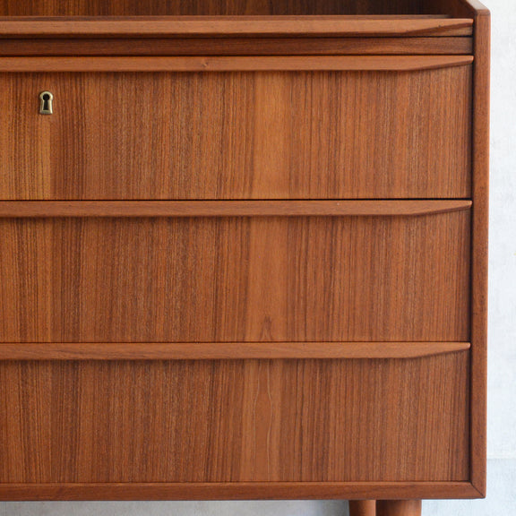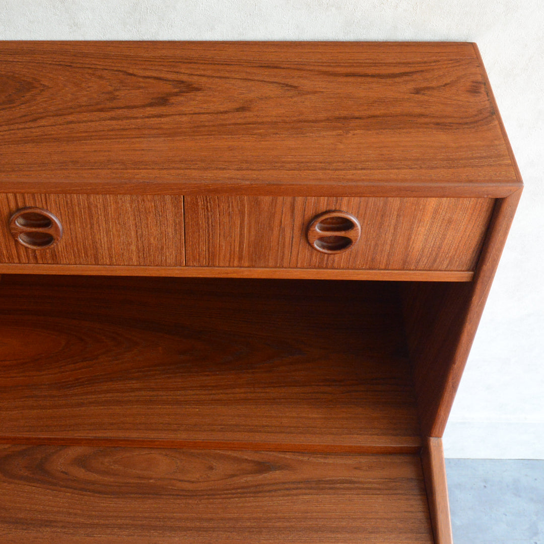 北欧のビューローは机の天板を開くのでは無く、スライド式に手前に引くタイプが大半です。 机として使用しない場合には天板を押し込むだけで棚付きのチェストとしてリビングの美観を損ないません。