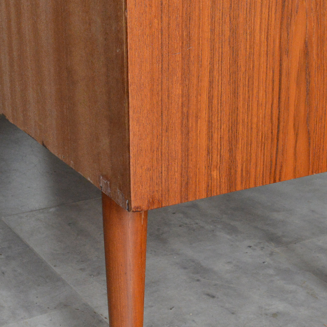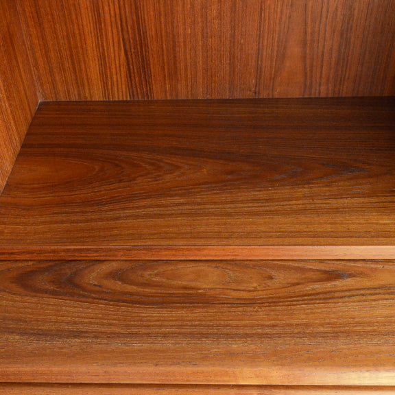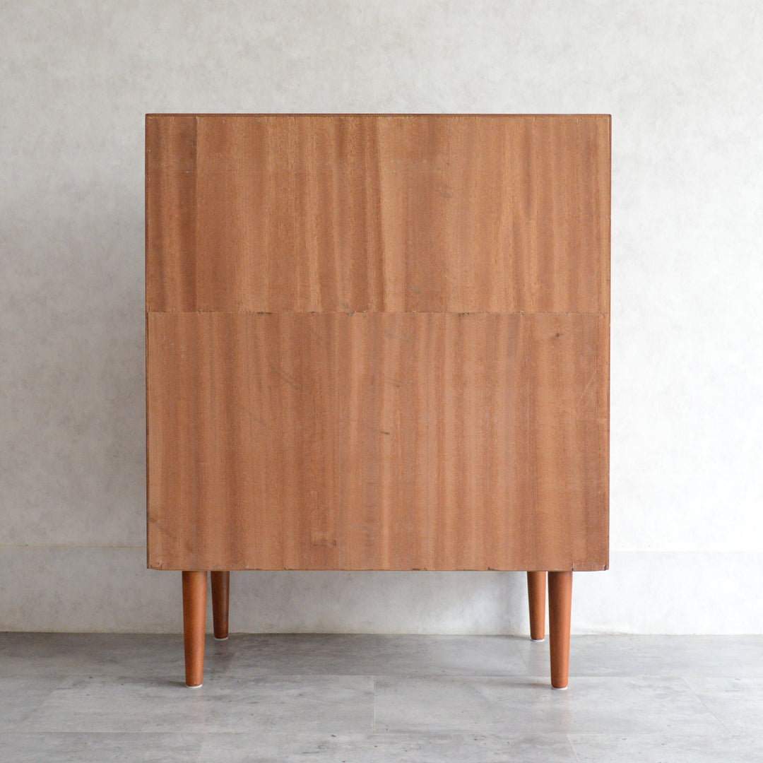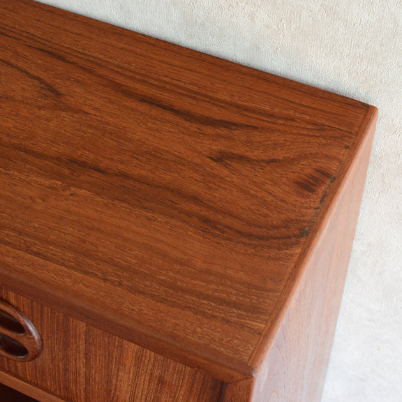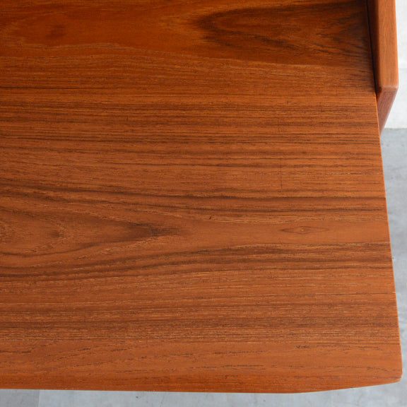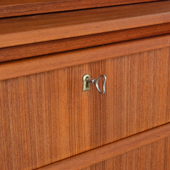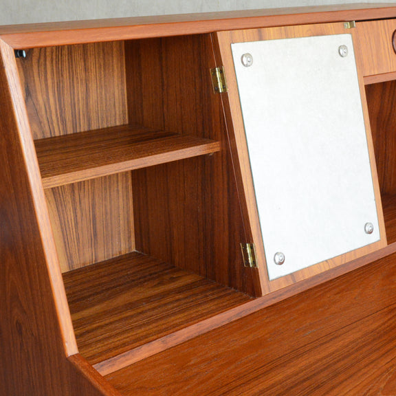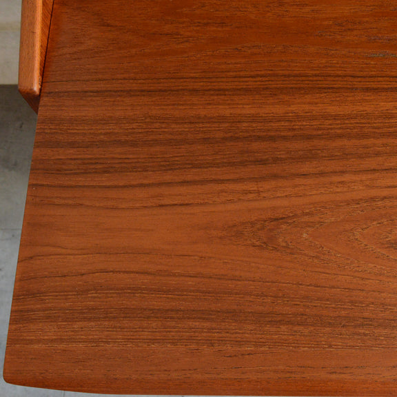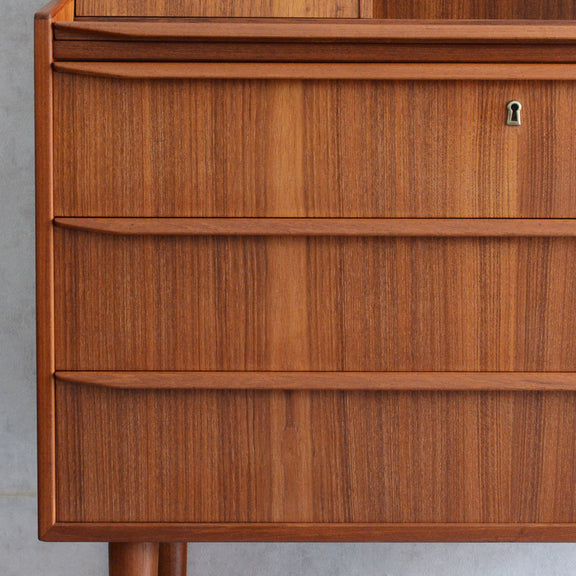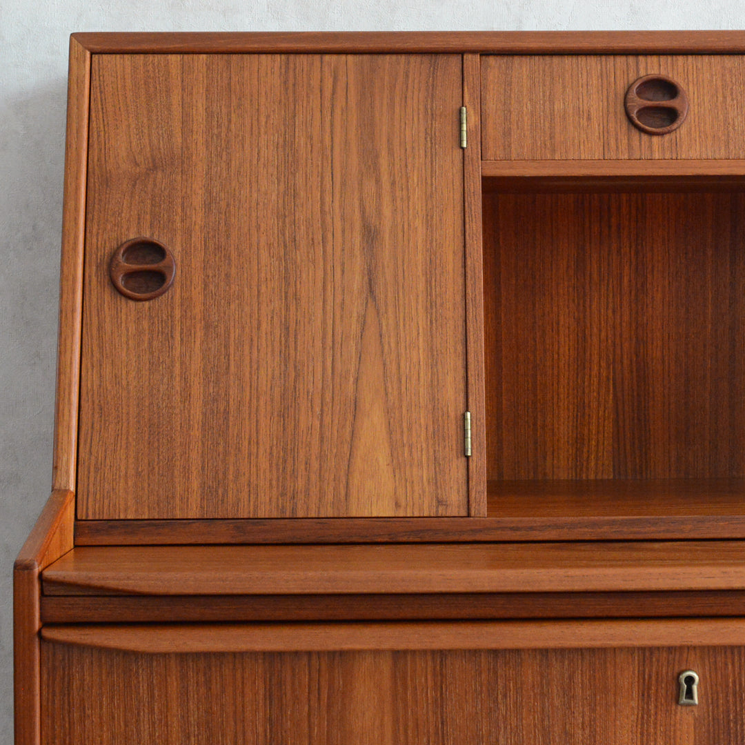 北欧のビューローは机の天板を開くのでは無く、スライド式に手前に引くタイプが大半です。 机として使用しない場合には天板を押し込むだけで棚付きのチェストとしてリビングの美観を損ないません。