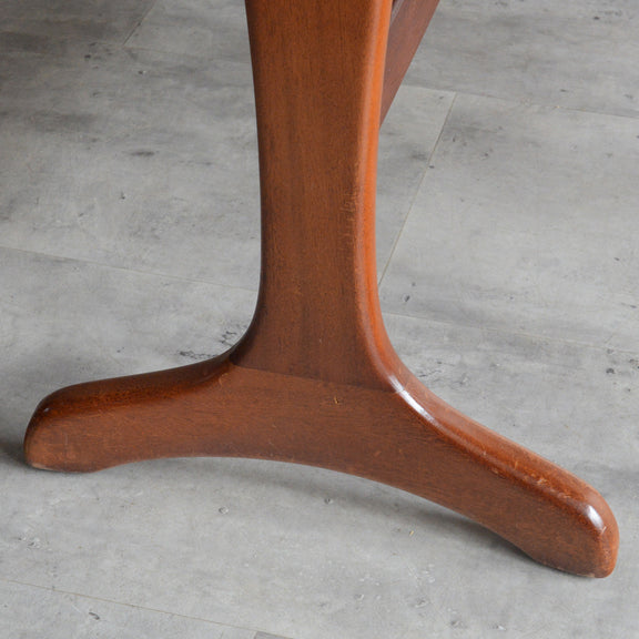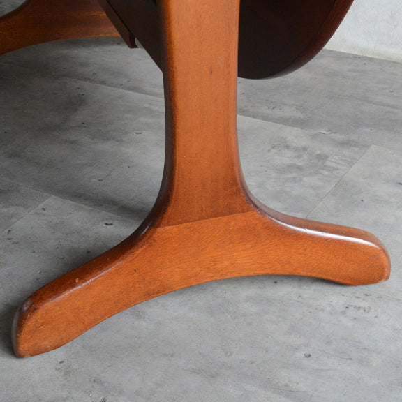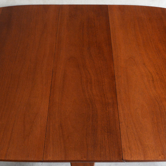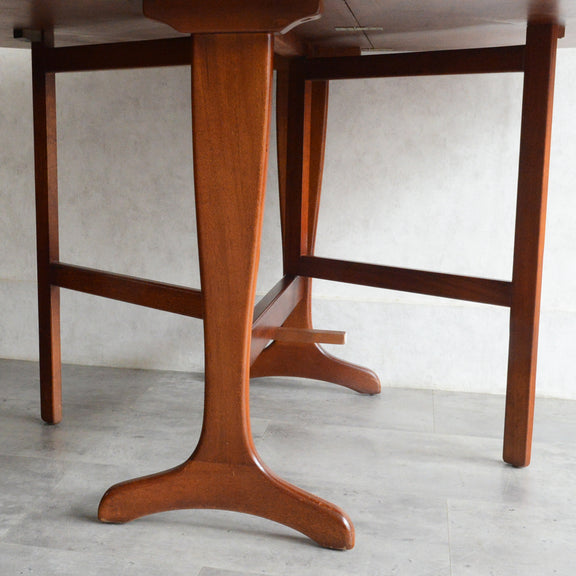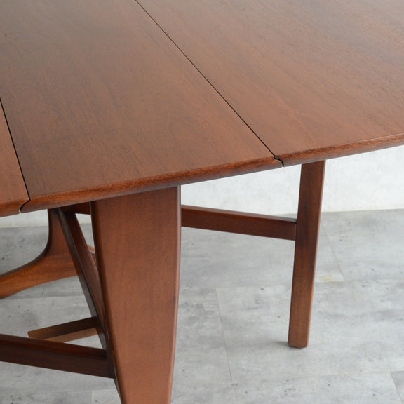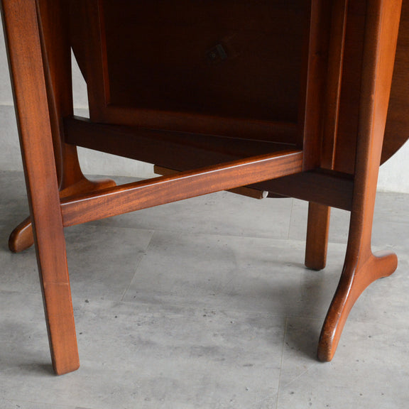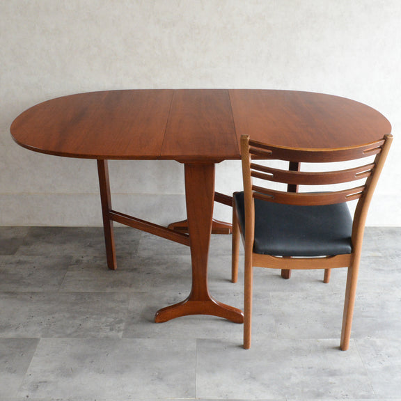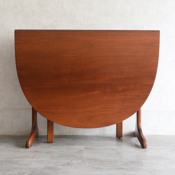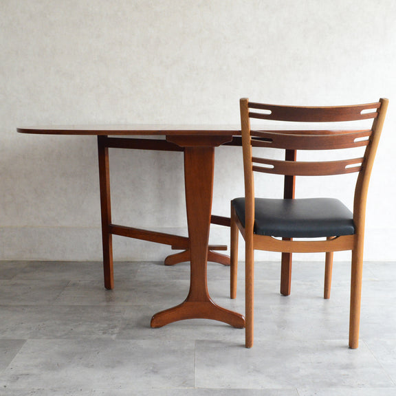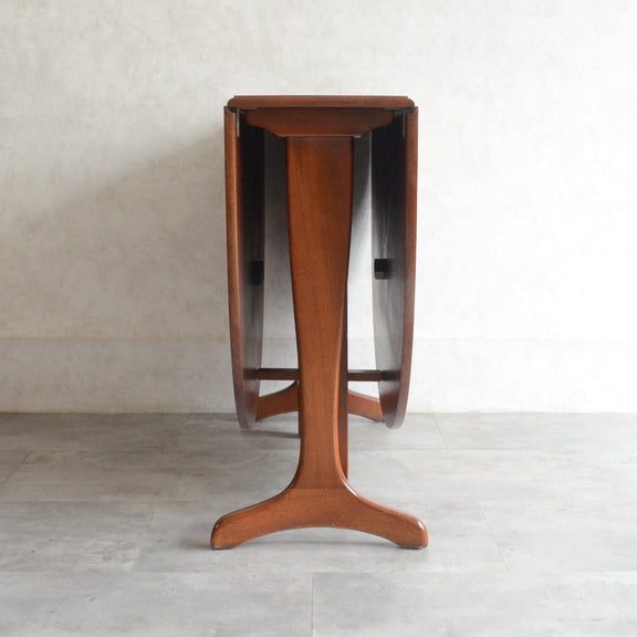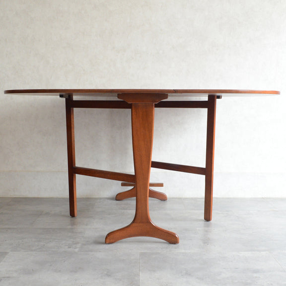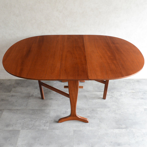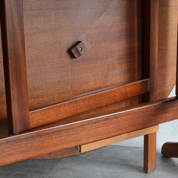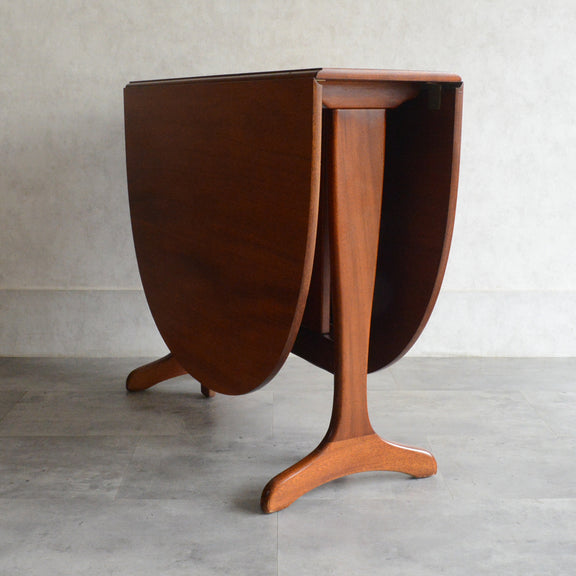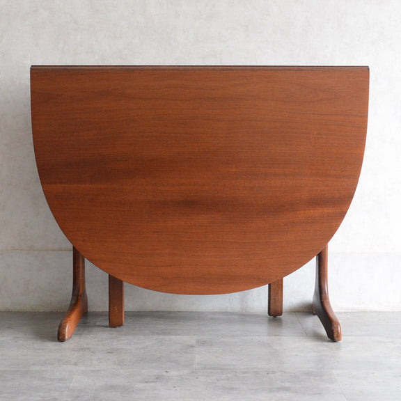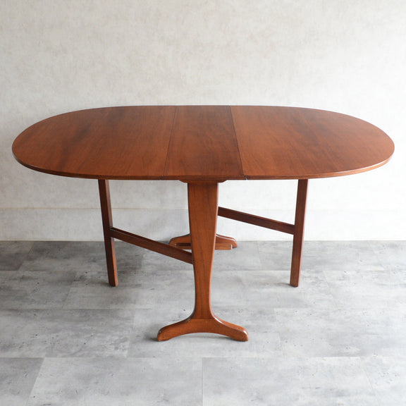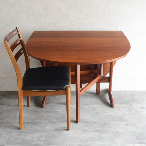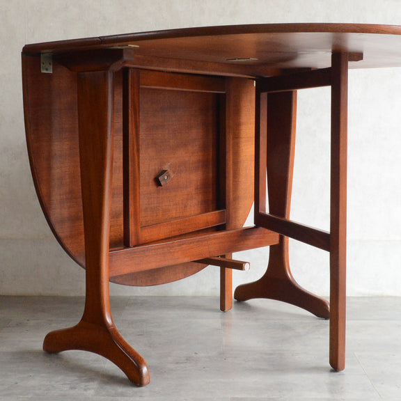 こちらはドロップリーフやバタフライとも呼ばれるゲートレッグテーブルで、脚部を動かすことによって、広々とした幅148.5cmの天板を、移動時や使用しない時には幅約29cmまでコンパクトに畳む事ができます。