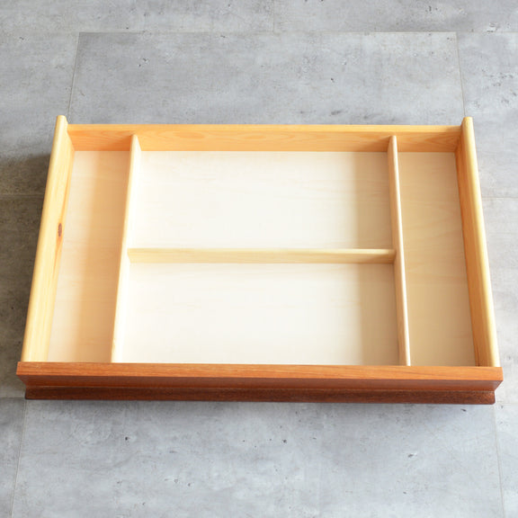 上段抽斗の中の仕切りのサイズも細か過ぎず、色々な収納に対応します。また、抽斗の底板は新品に交換しておりますので気持ちよくお使い頂けます。