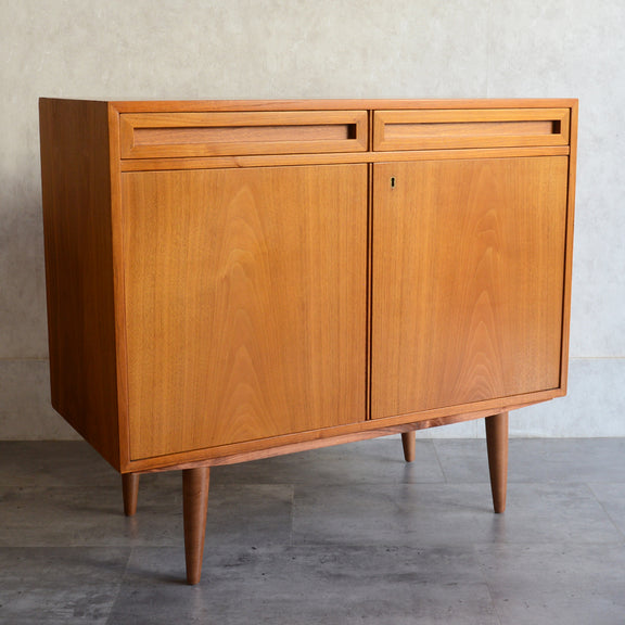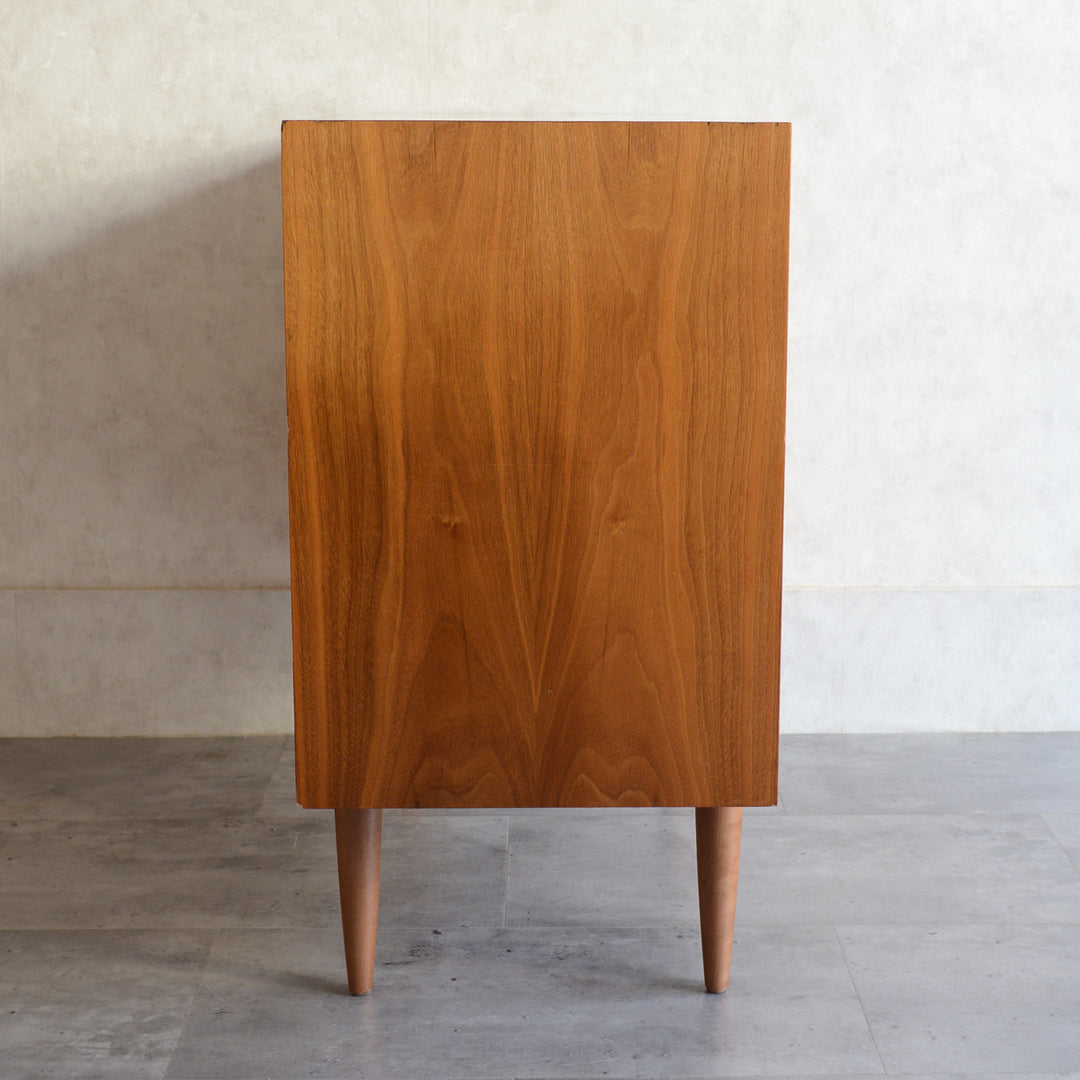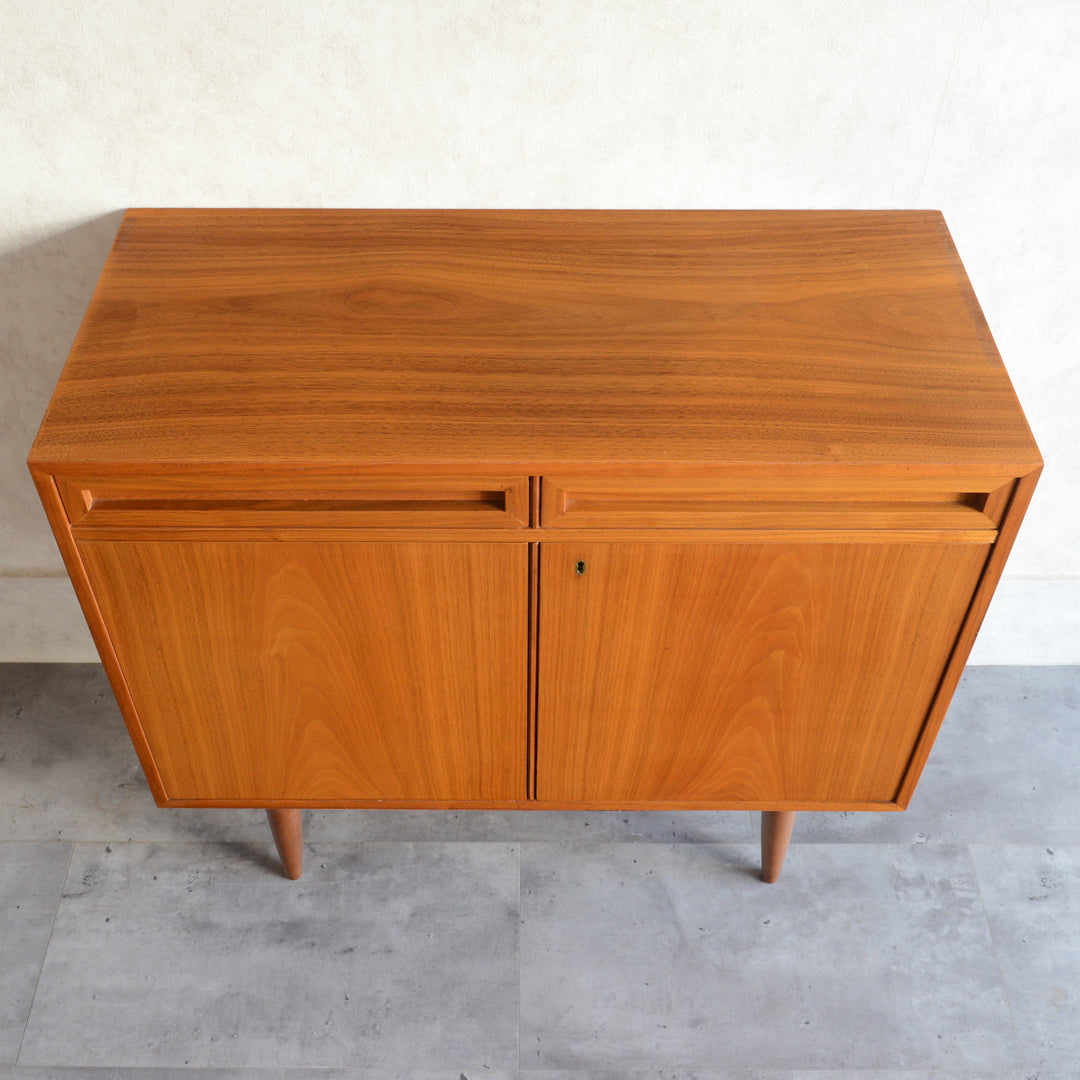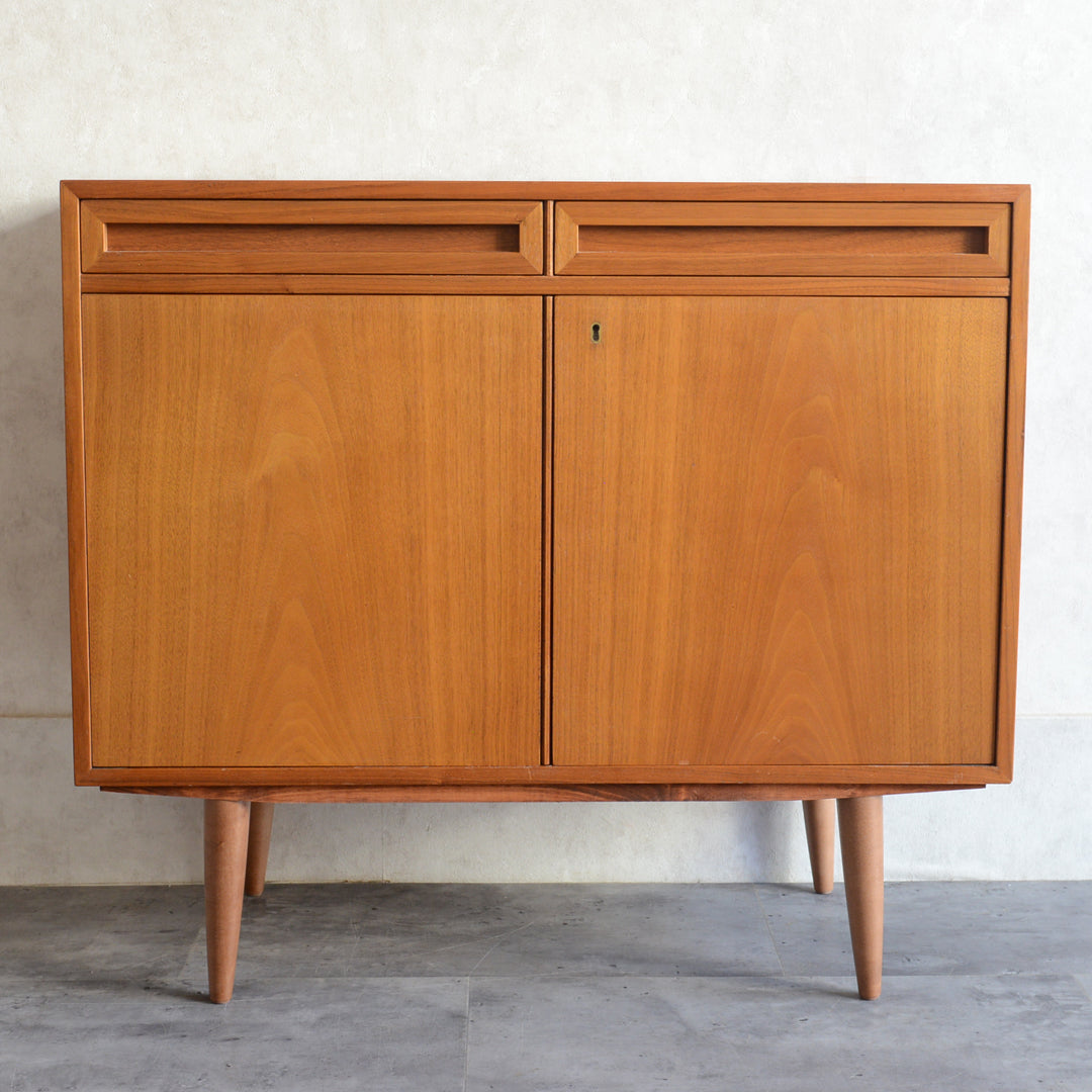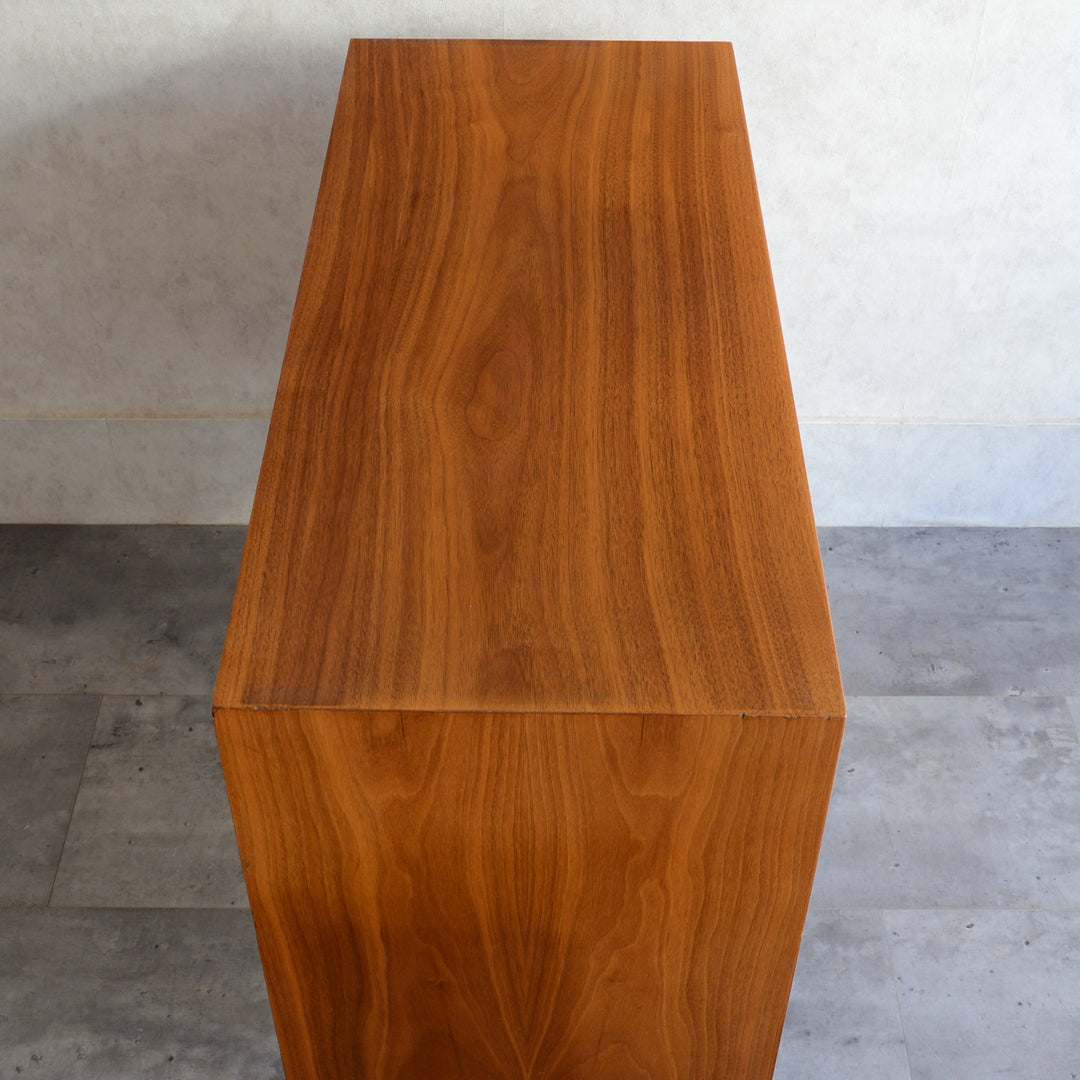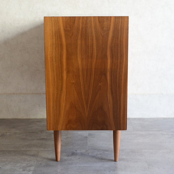 上部の抽斗は機能的に便利なだけでは無く、高度な職人技を感じる秀逸なデザインアクセントとなっています。下部の扉内とあわせてリビングの日用品等もすっきりと収納する事ができそうです。