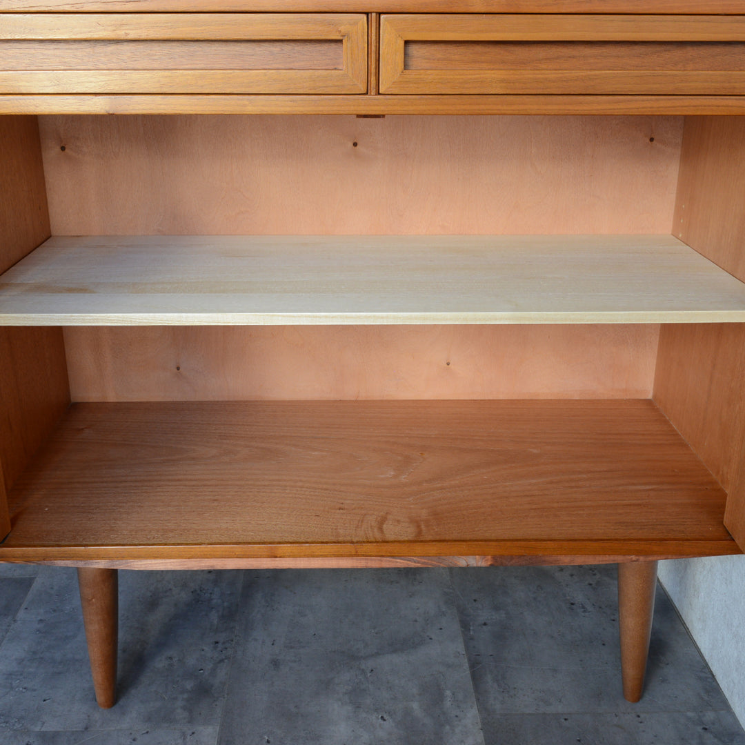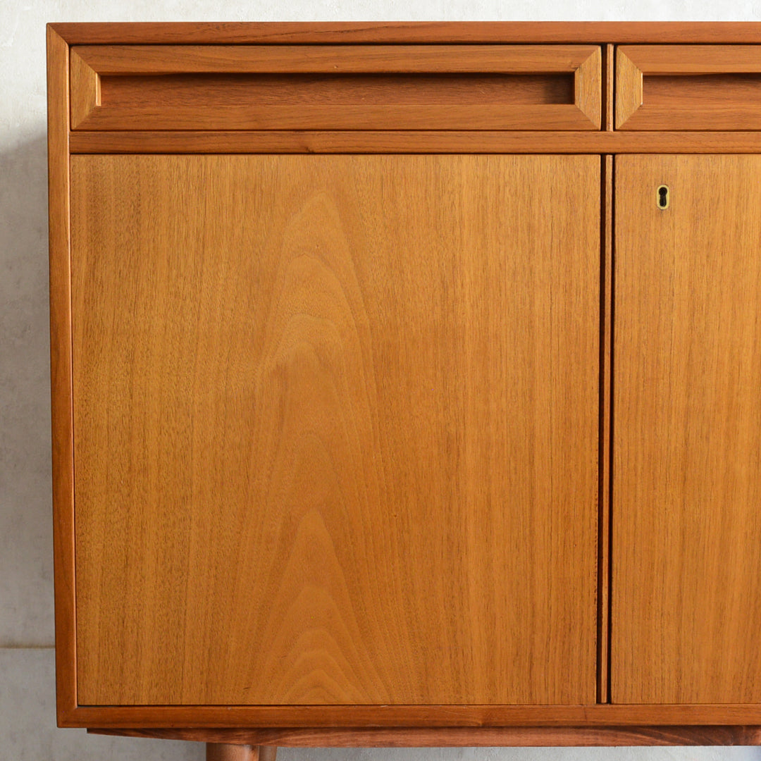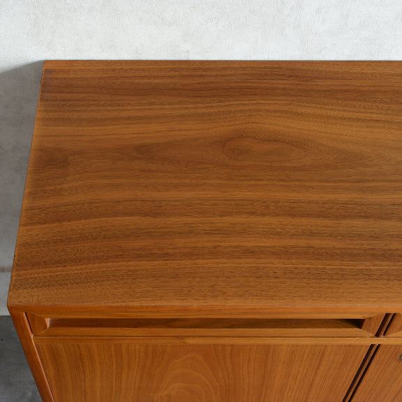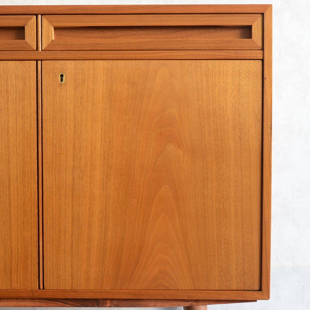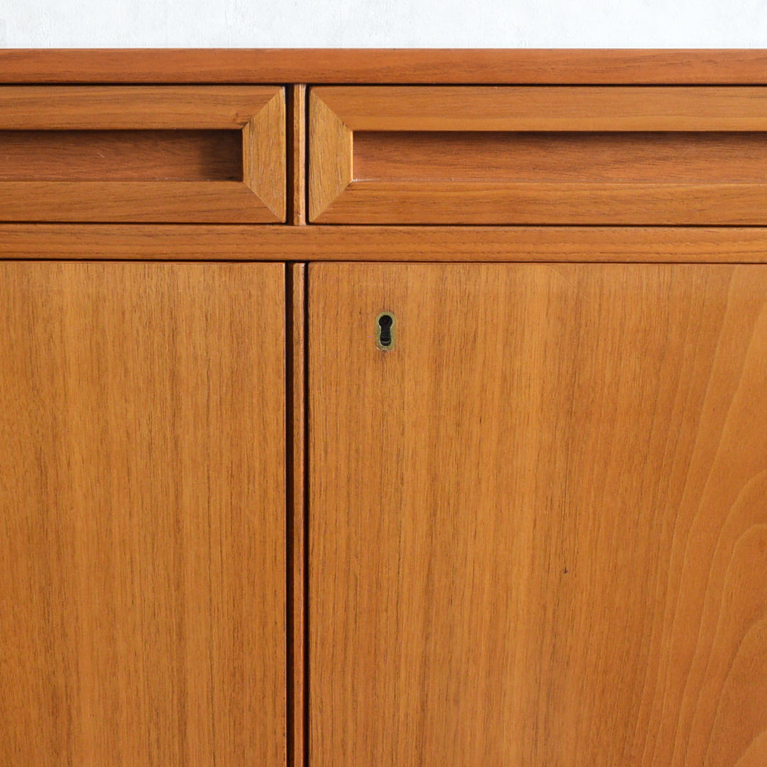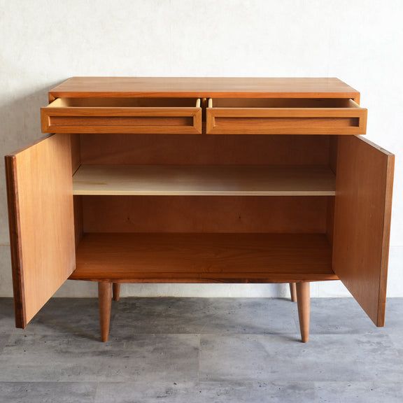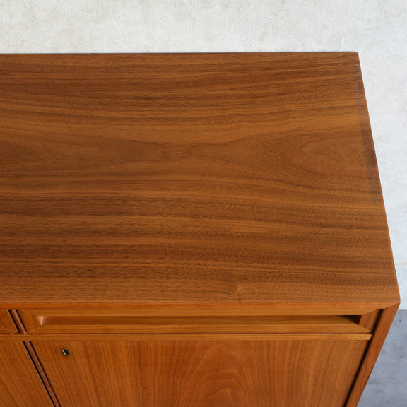 上部の抽斗は機能的に便利なだけでは無く、高度な職人技を感じる秀逸なデザインアクセントとなっています。下部の扉内とあわせてリビングの日用品等もすっきりと収納する事ができそうです。