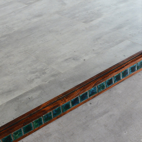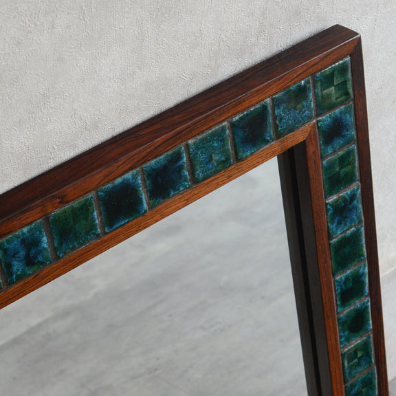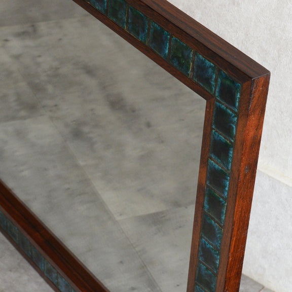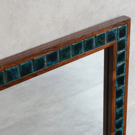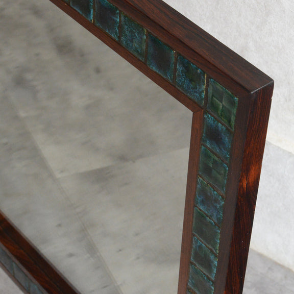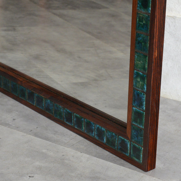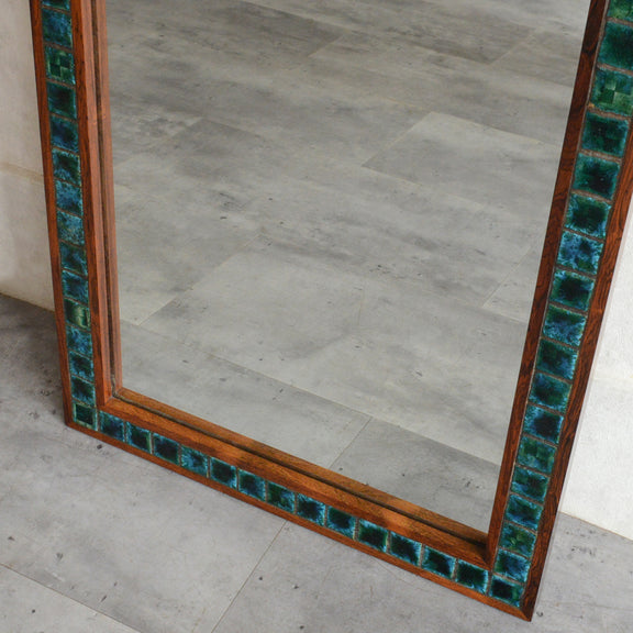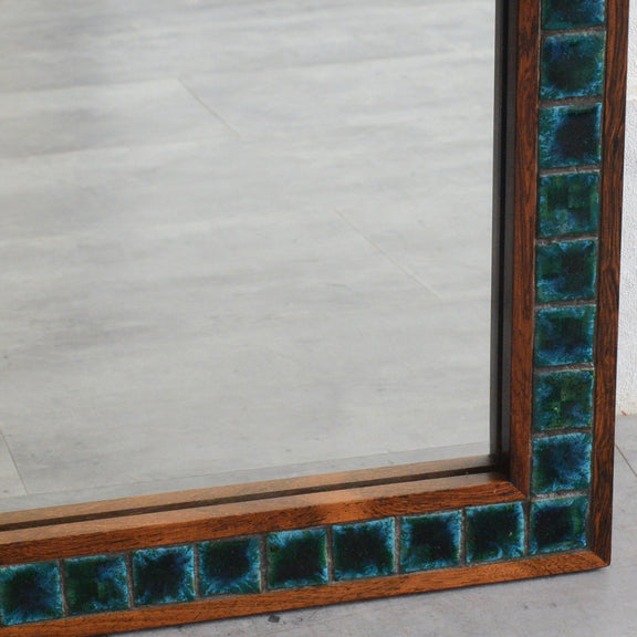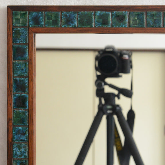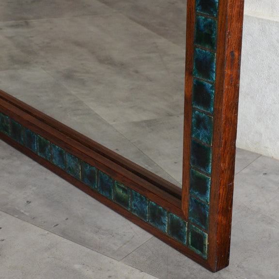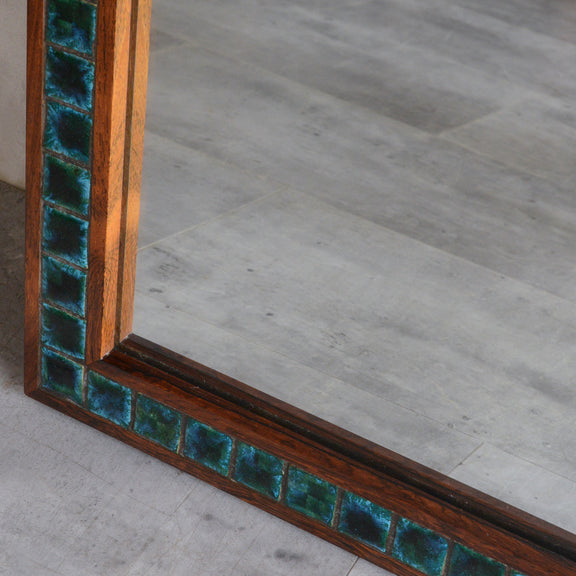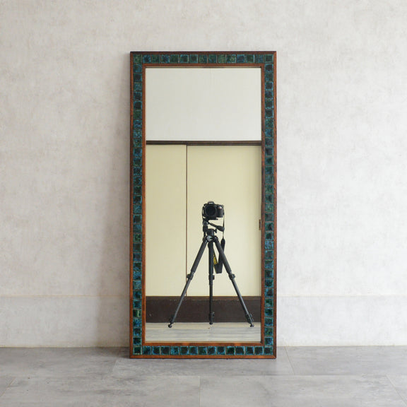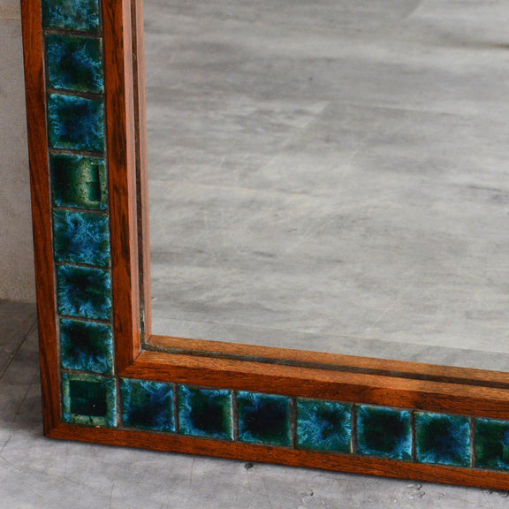 グラデーションのブルーグリーンのタイルが魅力的なヴィンテージミラー。
