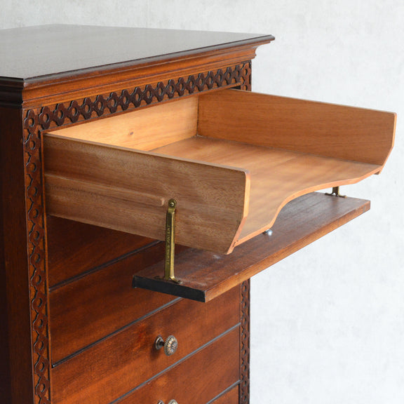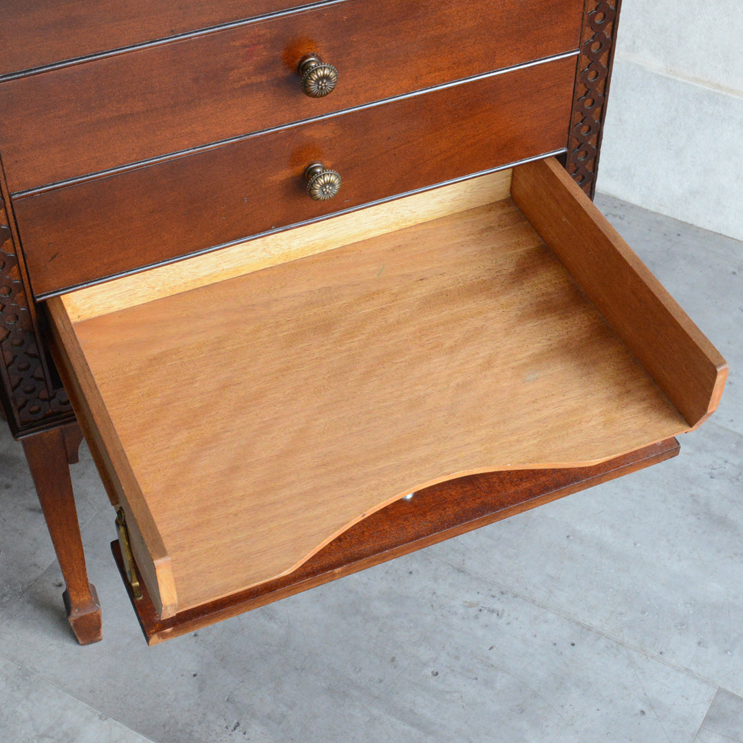 楽譜等の書類が取り出しやすい様、抽斗を引き出すと前板が下に移動するスペシャルな仕様となっています。(画像をご参照ください)