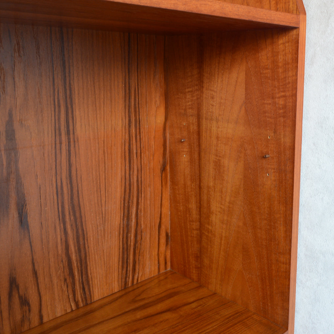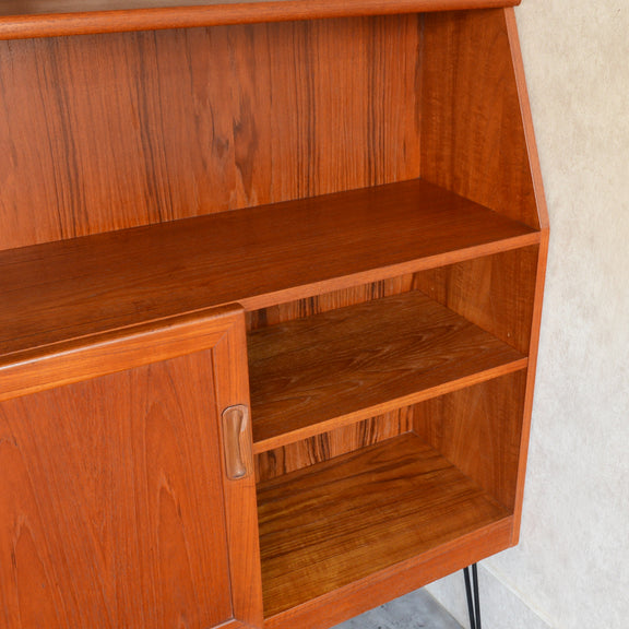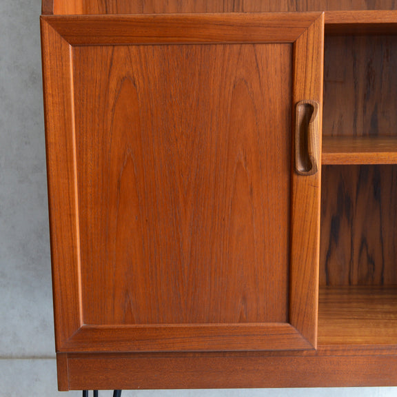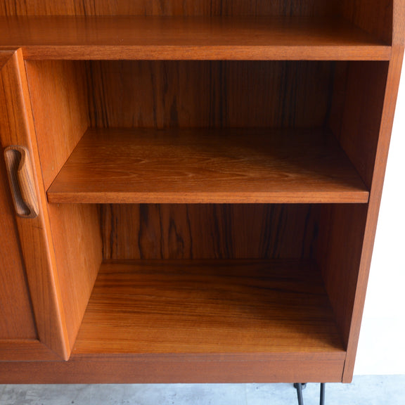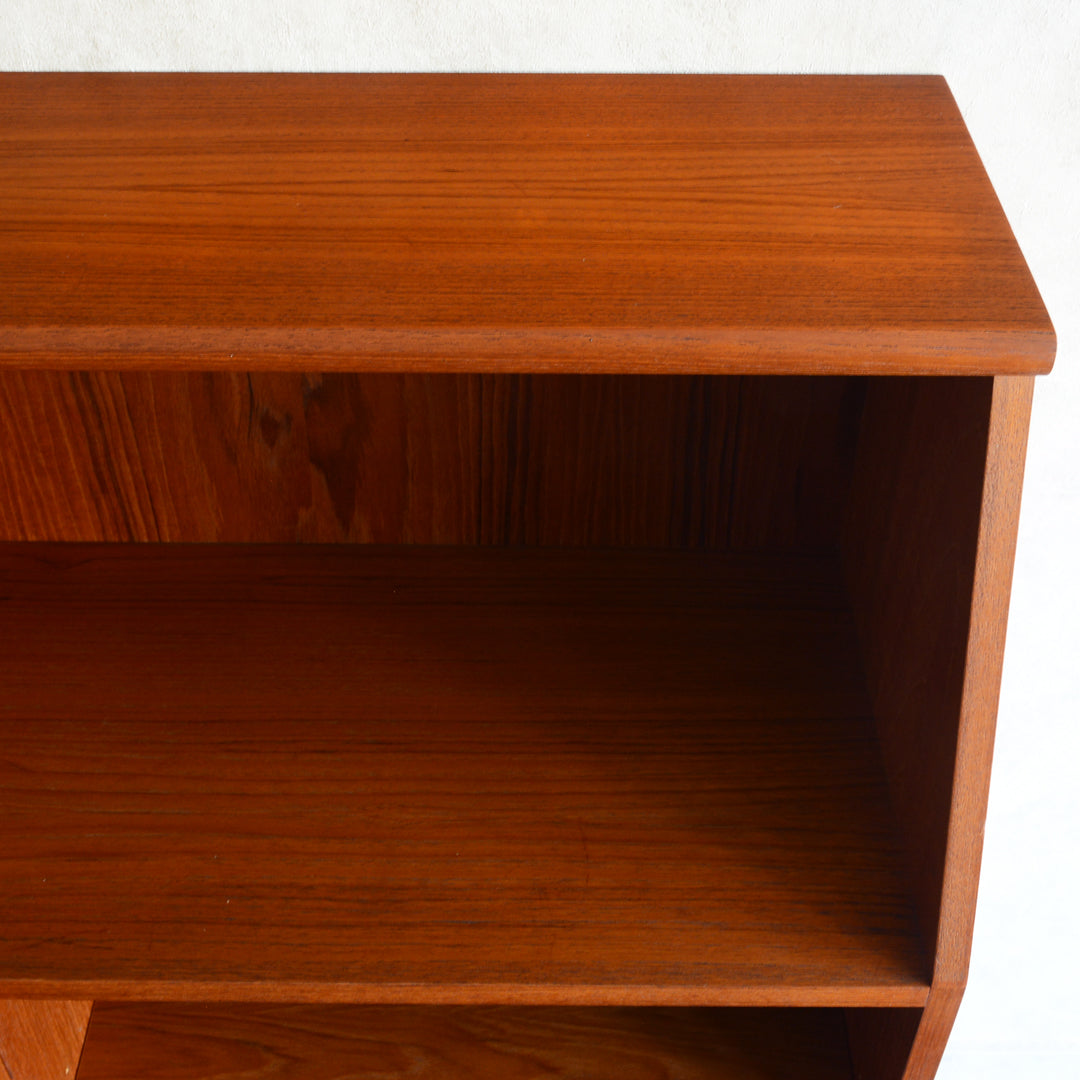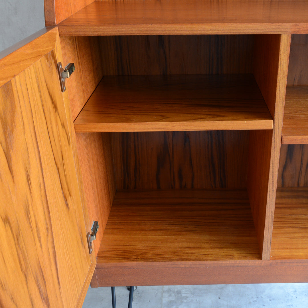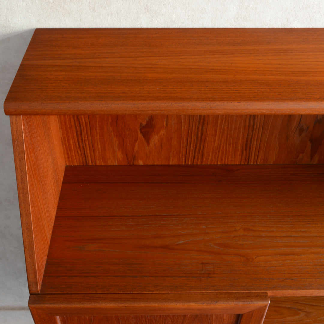 ヴィンテージチークの木目と巻貝の様な把手が美しいFrescoシリーズ。扉付収納とオープン棚を備え、フレキシブルな用途に対応するキャビネットです。