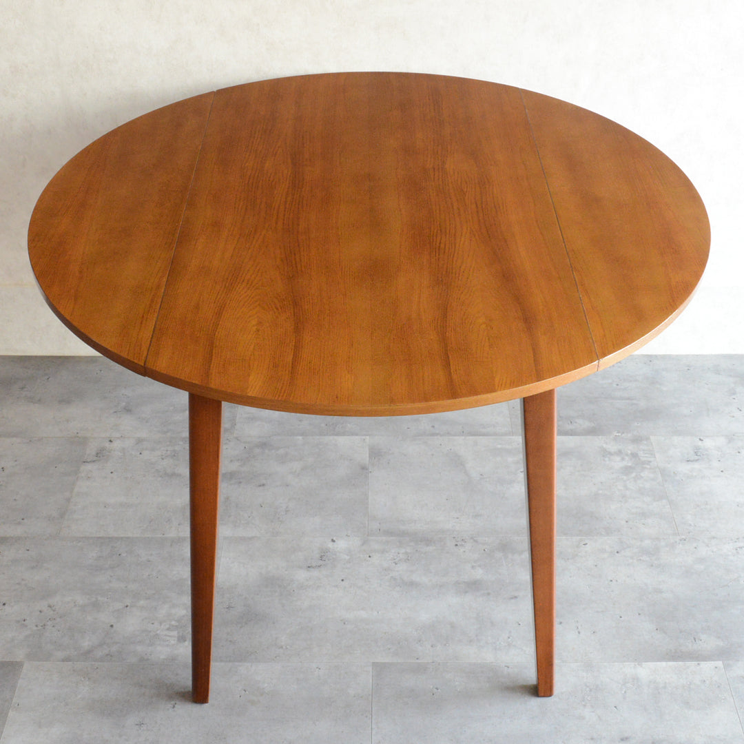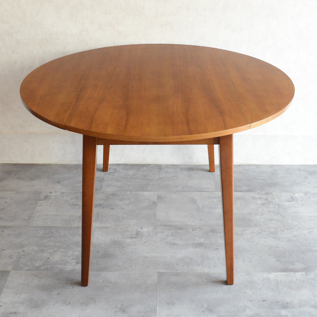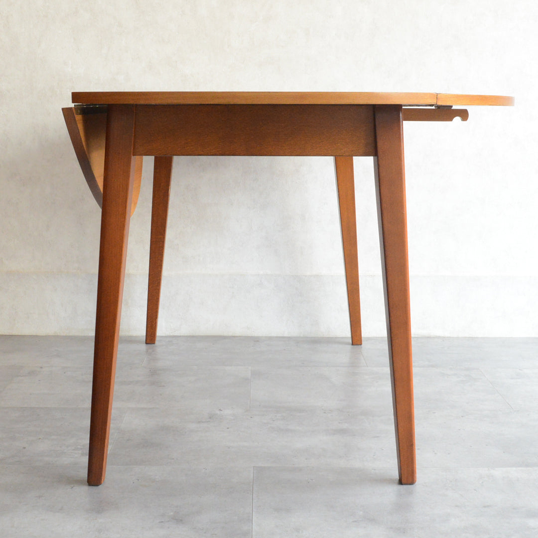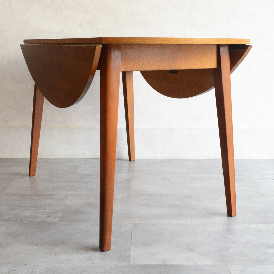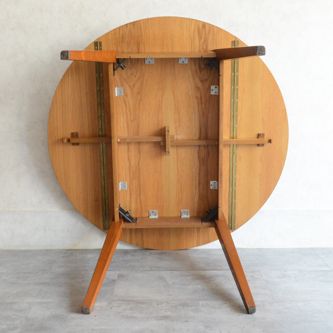 バタフライテーブルは、天板下の把手を操作することにより天板の左右部分を開閉することができます。幅が最小65cmとなりますので、設置スペースや搬入事情によりコンパクトなミッドセンチュリーのラウンドテーブルをお探しの方にお勧めです。