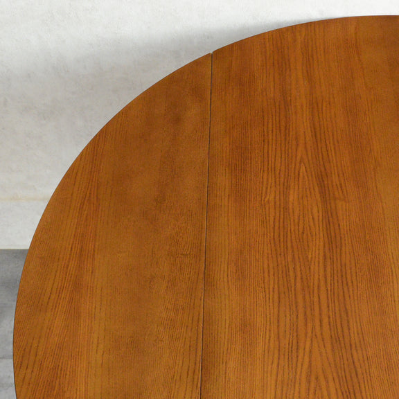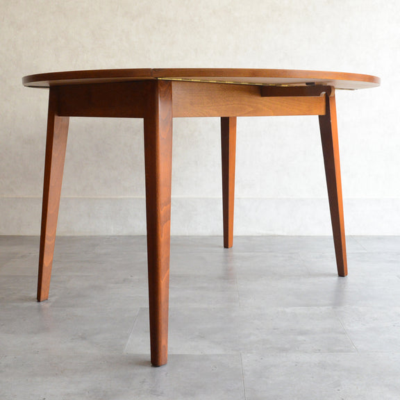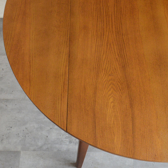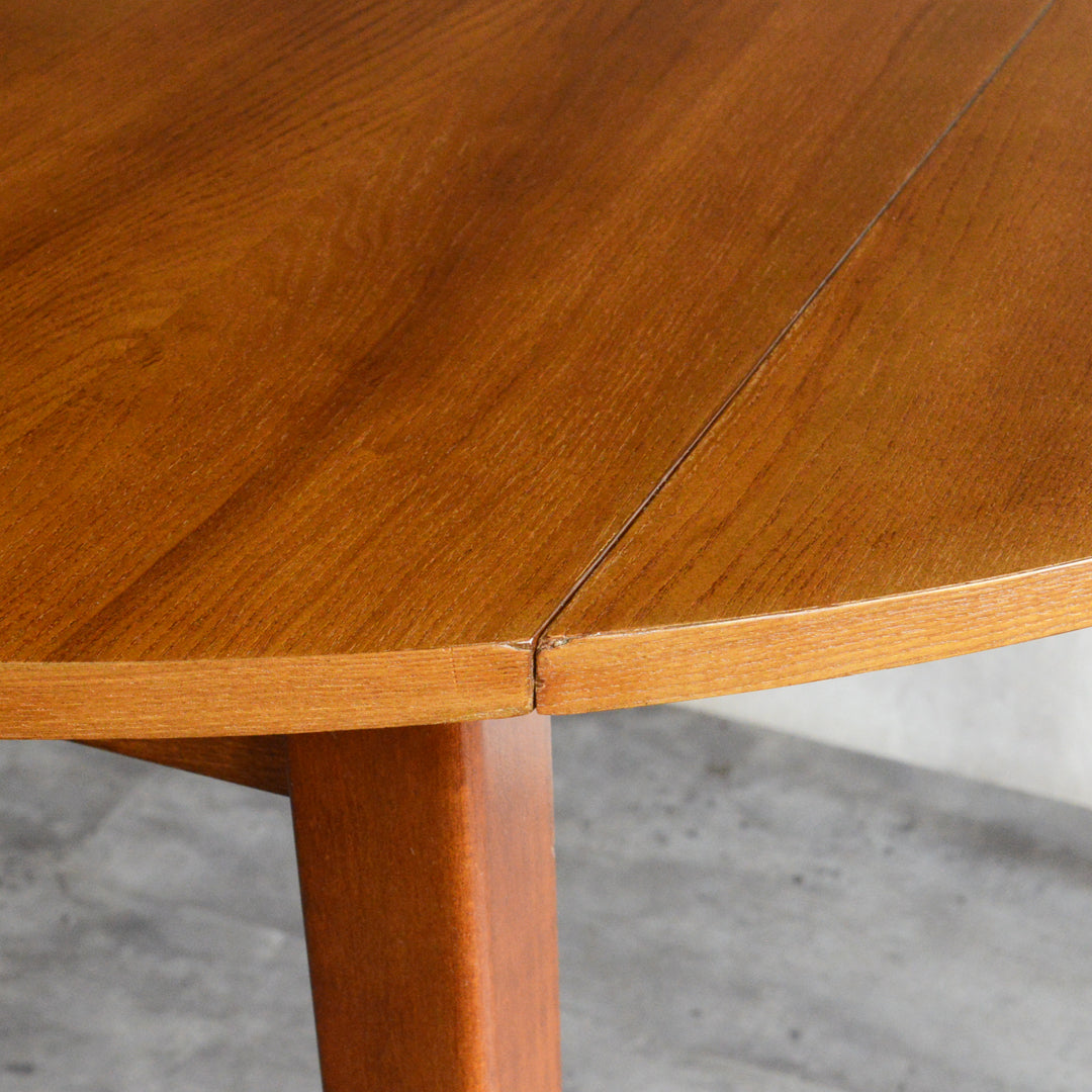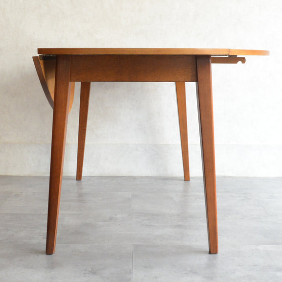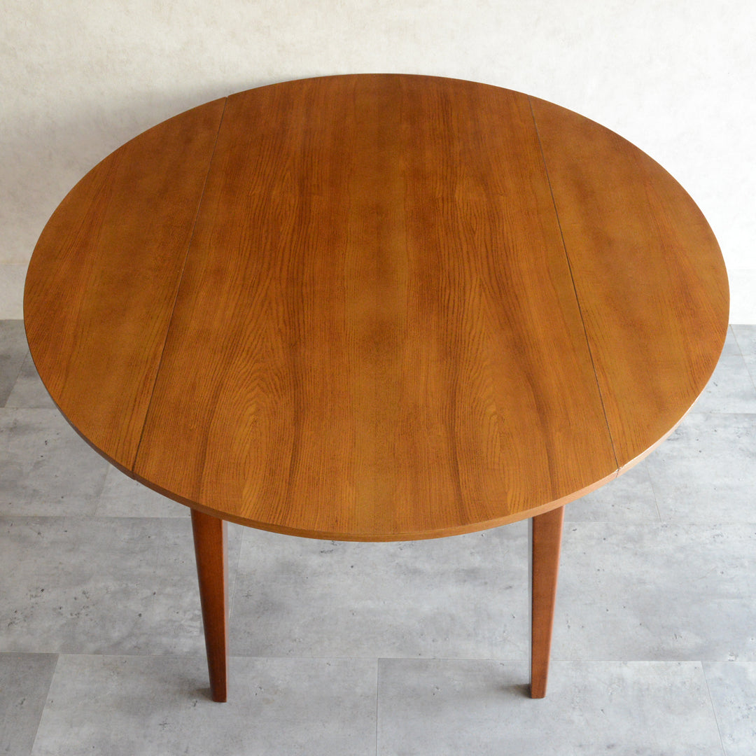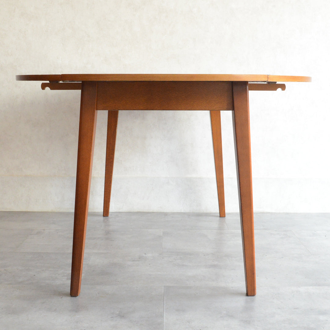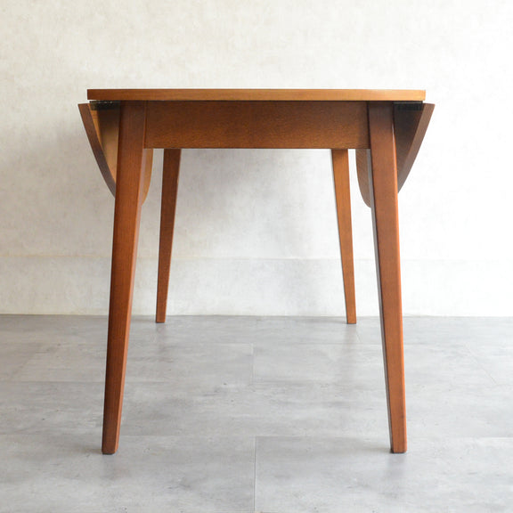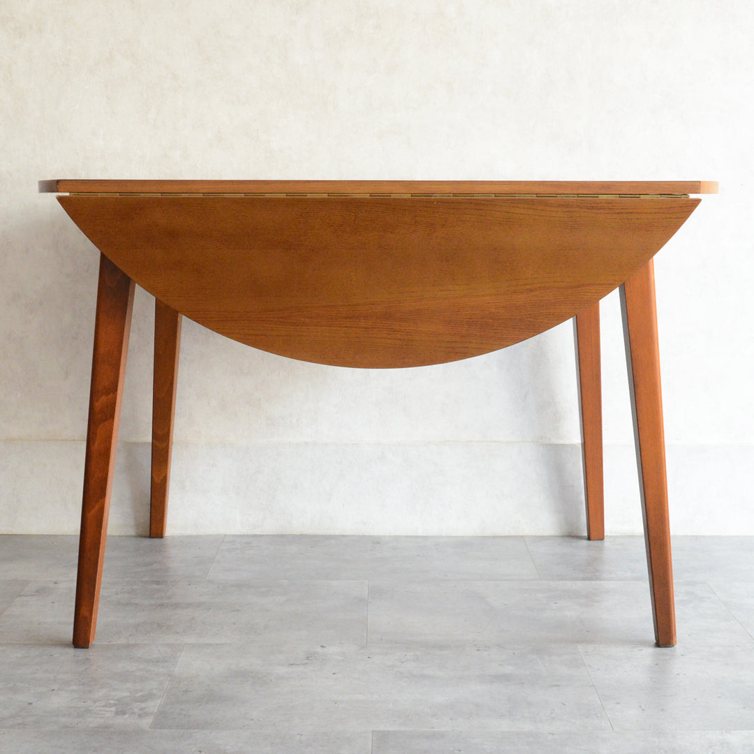 バタフライテーブルは、天板下の把手を操作することにより天板の左右部分を開閉することができます。幅が最小65cmとなりますので、設置スペースや搬入事情によりコンパクトなミッドセンチュリーのラウンドテーブルをお探しの方にお勧めです。