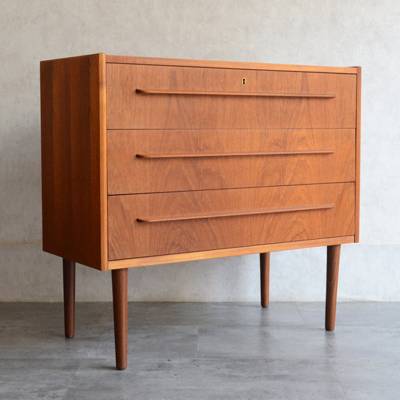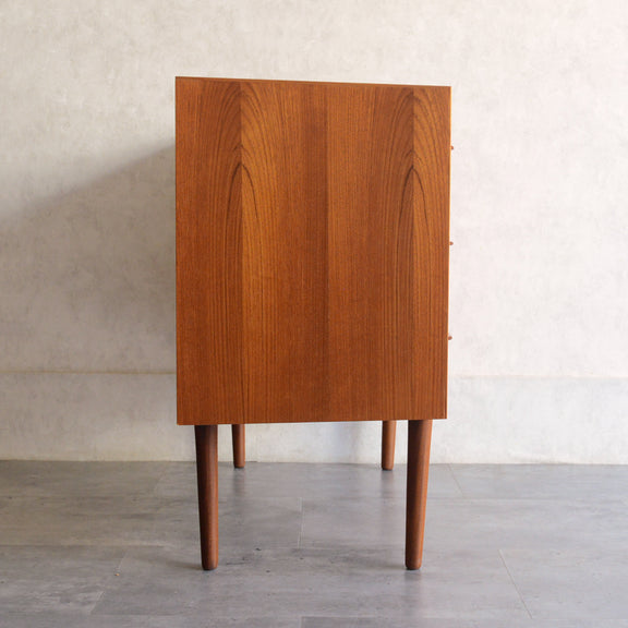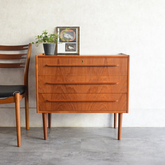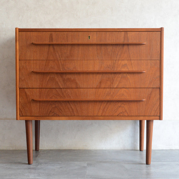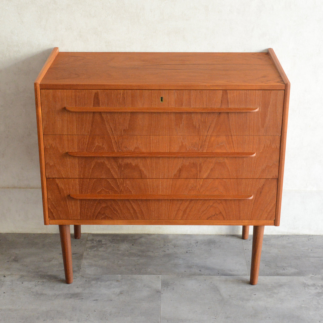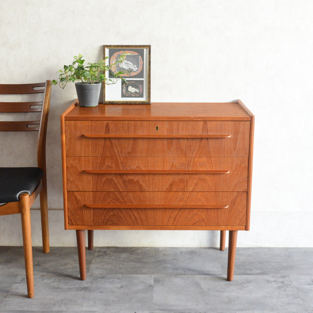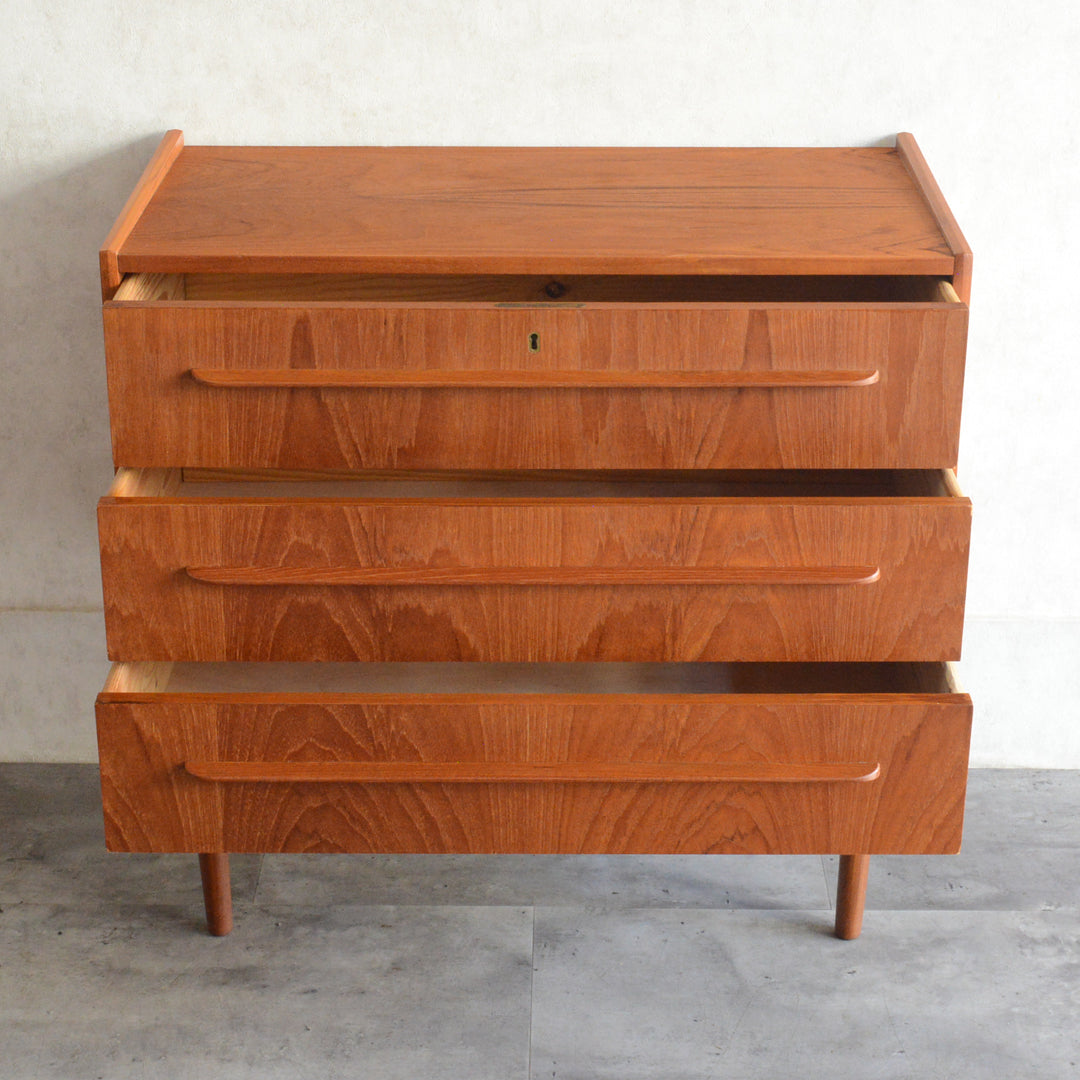 デンマークにて買い付けたヴィンテージチークの木目が美しい3段チェスト。