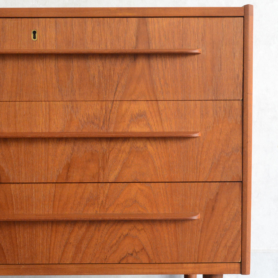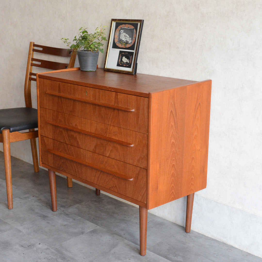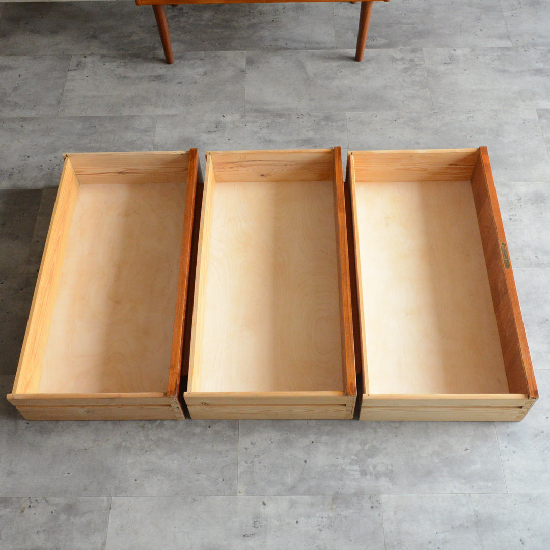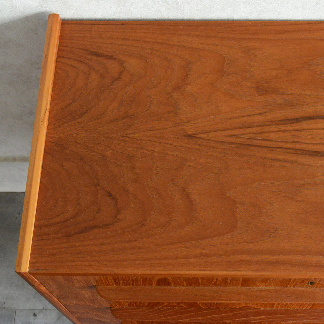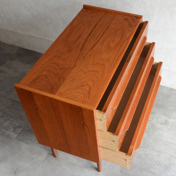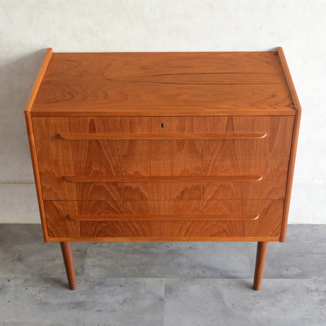 デンマークにて買い付けたヴィンテージチークの木目が美しい3段チェスト。
