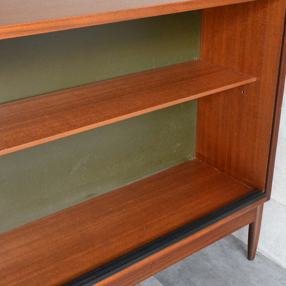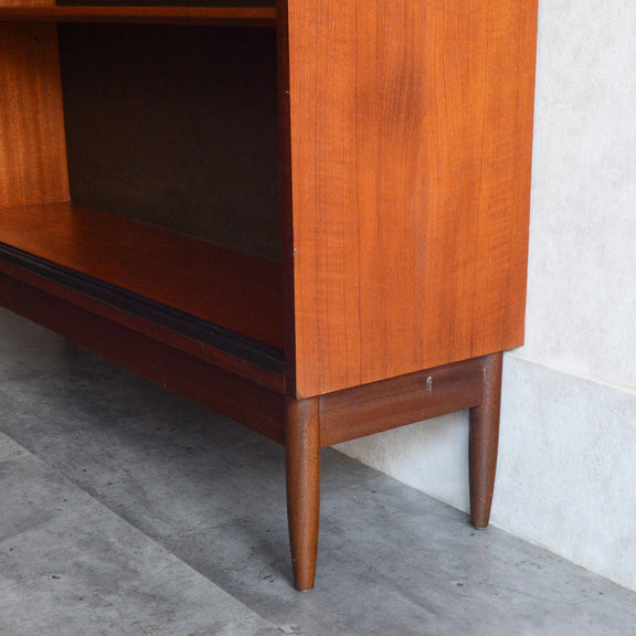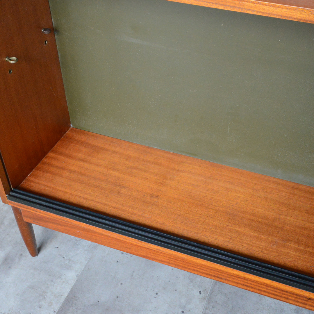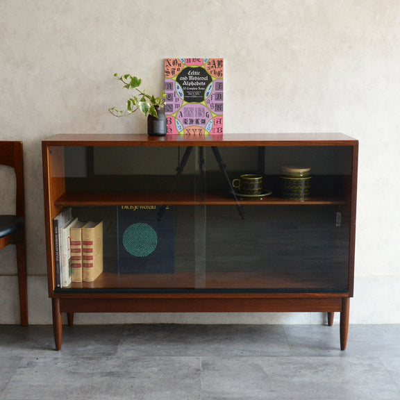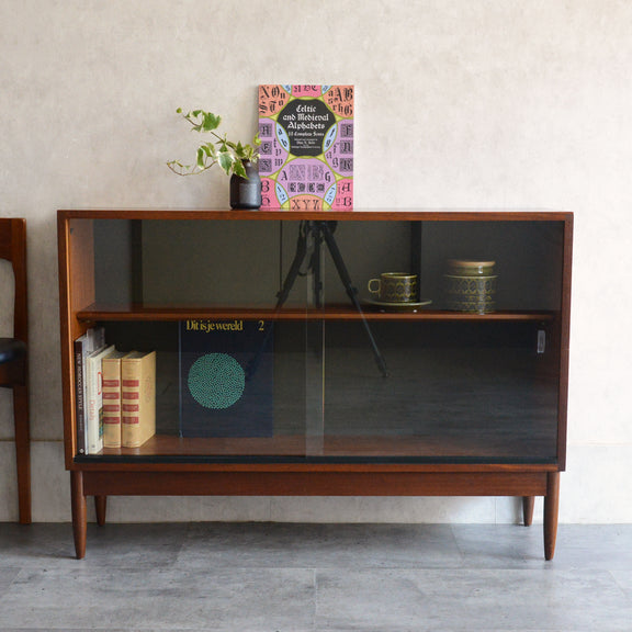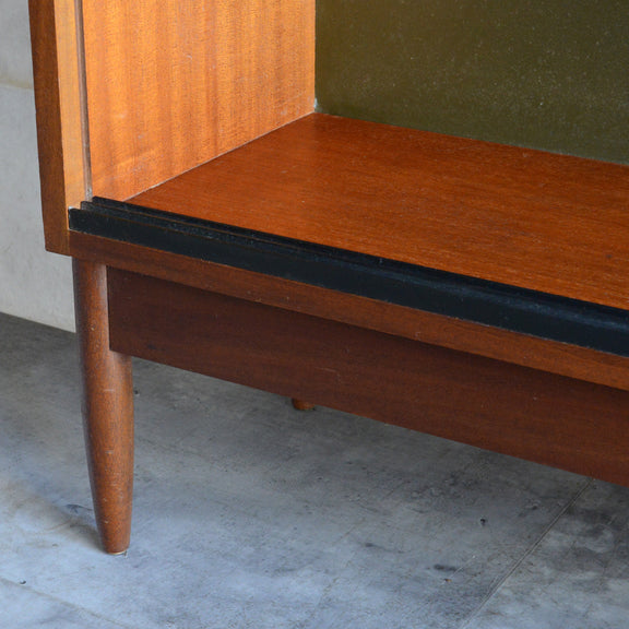 美しいテーパーの脚が付いたシンプルなガラスキャビネット。ガラスは欠損していたので、新規作成しました。
