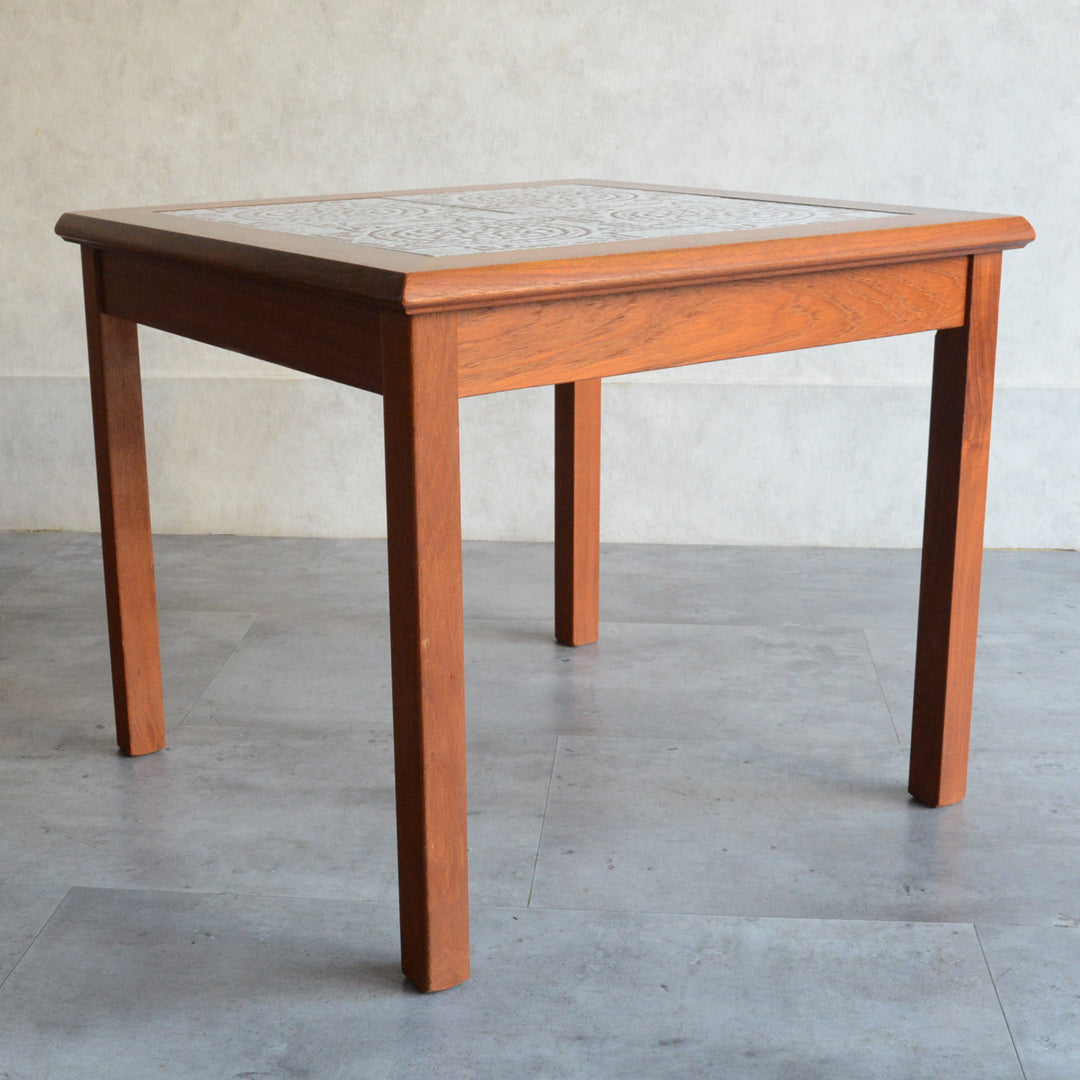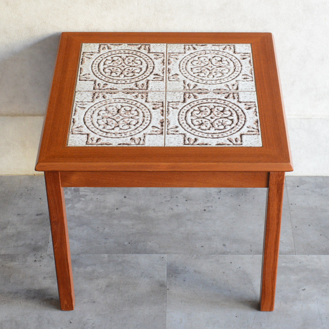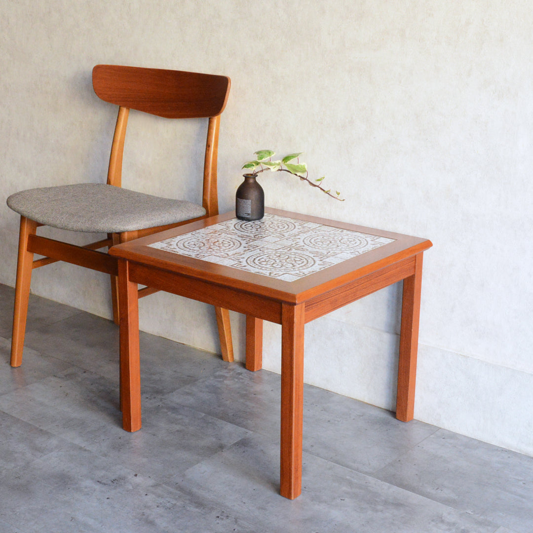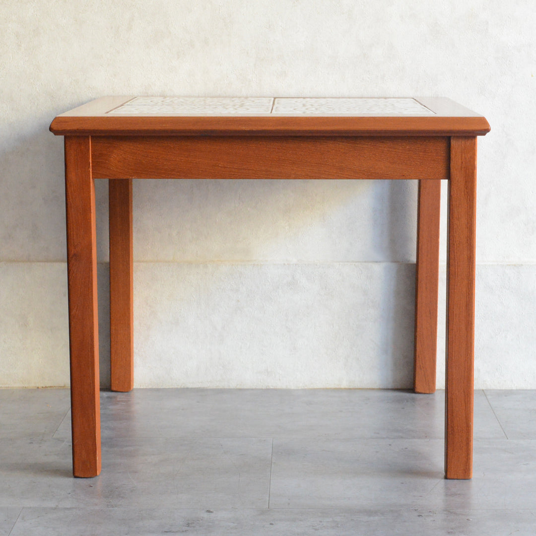 北欧らしいシンプルなタイルトップが印象的なデザイン。木部も経年のチークが美しく、凹凸ある肌触りのタイルは落ち着いた佇まいです。