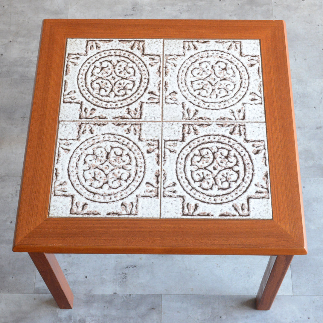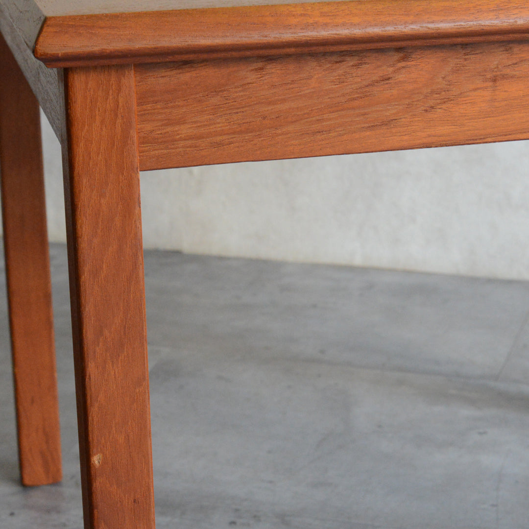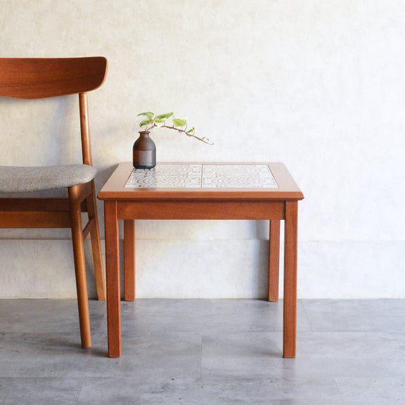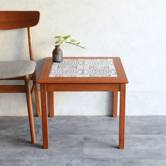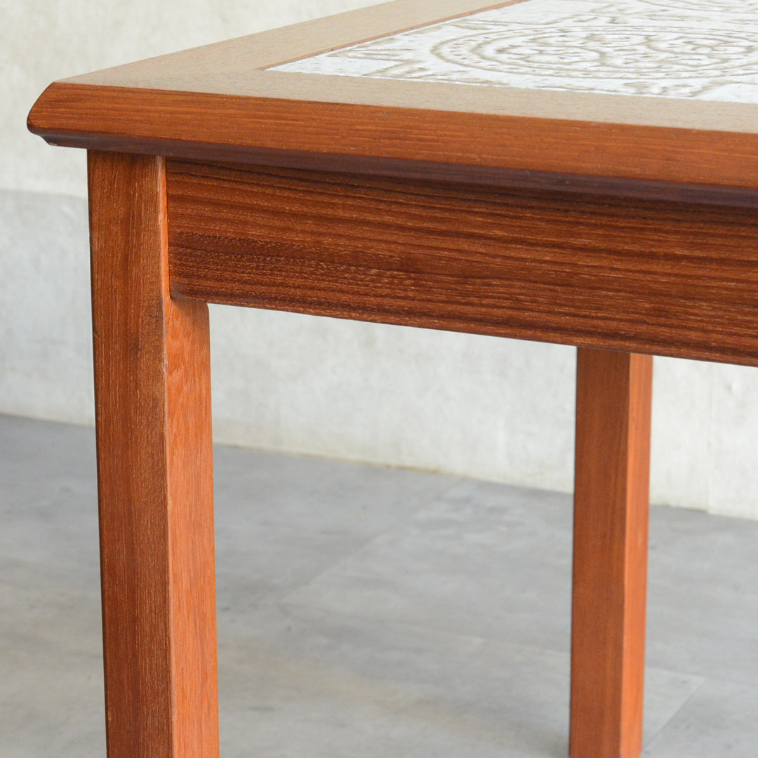 北欧らしいシンプルなタイルトップが印象的なデザイン。木部も経年のチークが美しく、凹凸ある肌触りのタイルは落ち着いた佇まいです。