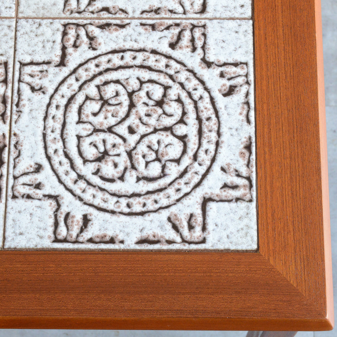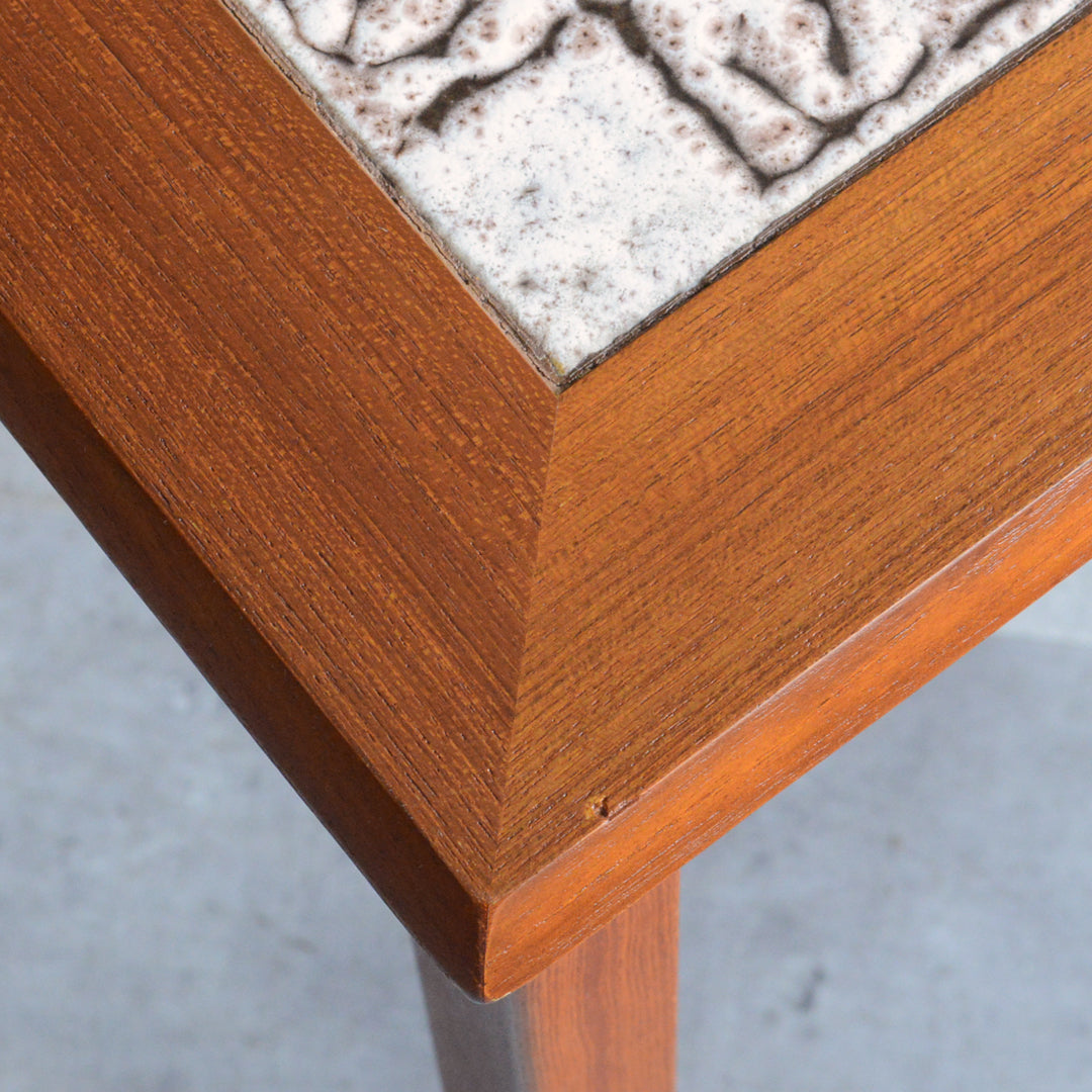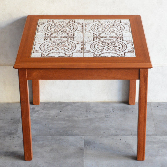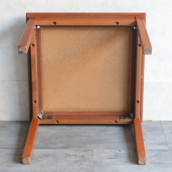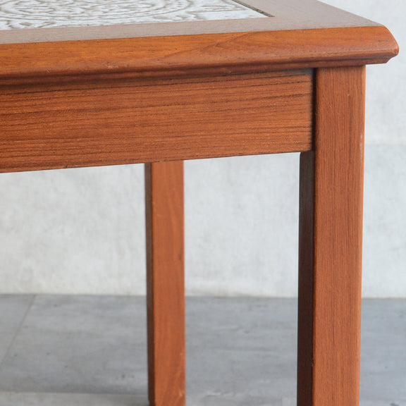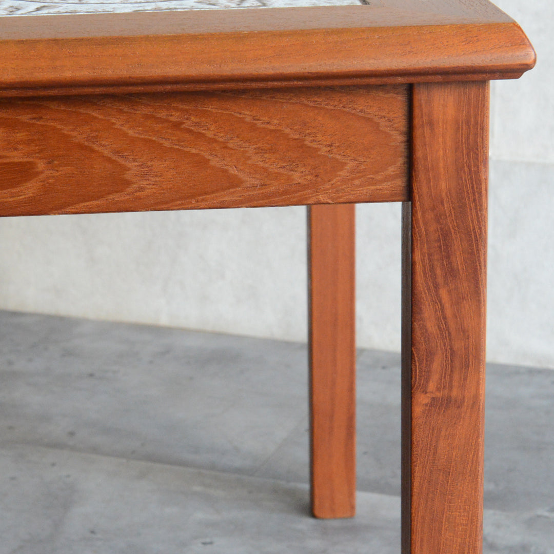 北欧らしいシンプルなタイルトップが印象的なデザイン。木部も経年のチークが美しく、凹凸ある肌触りのタイルは落ち着いた佇まいです。