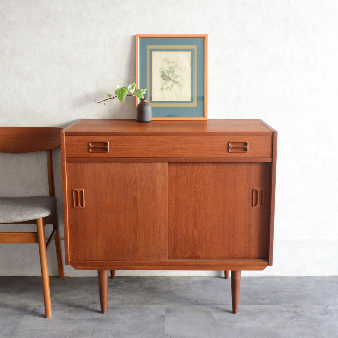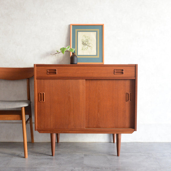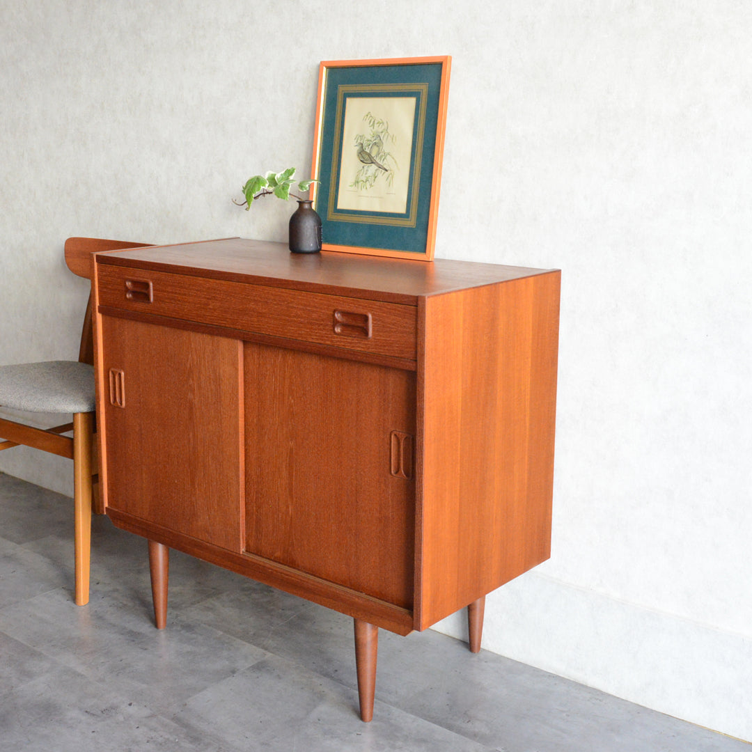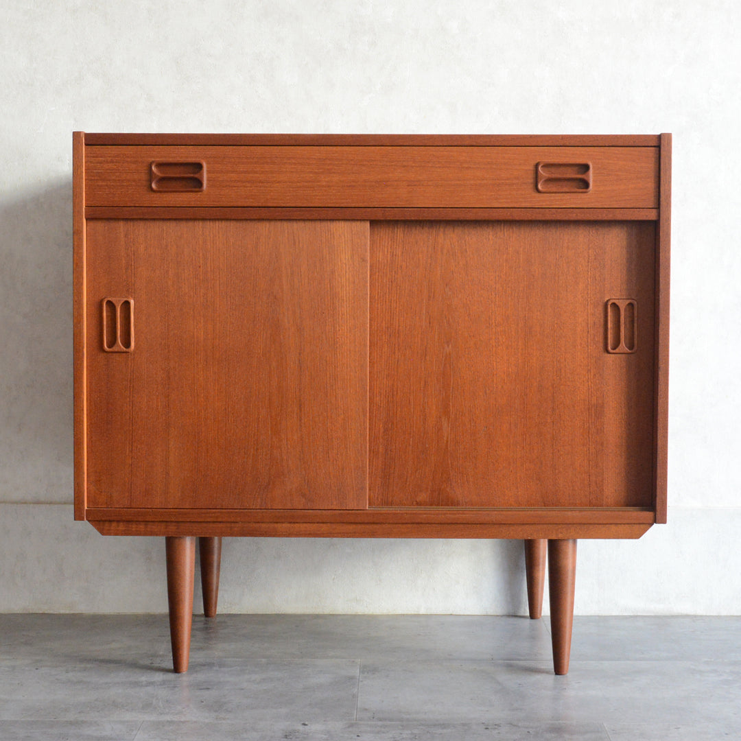 北欧らしい温かみあるスクエアの把手が印象的なキャビネット。