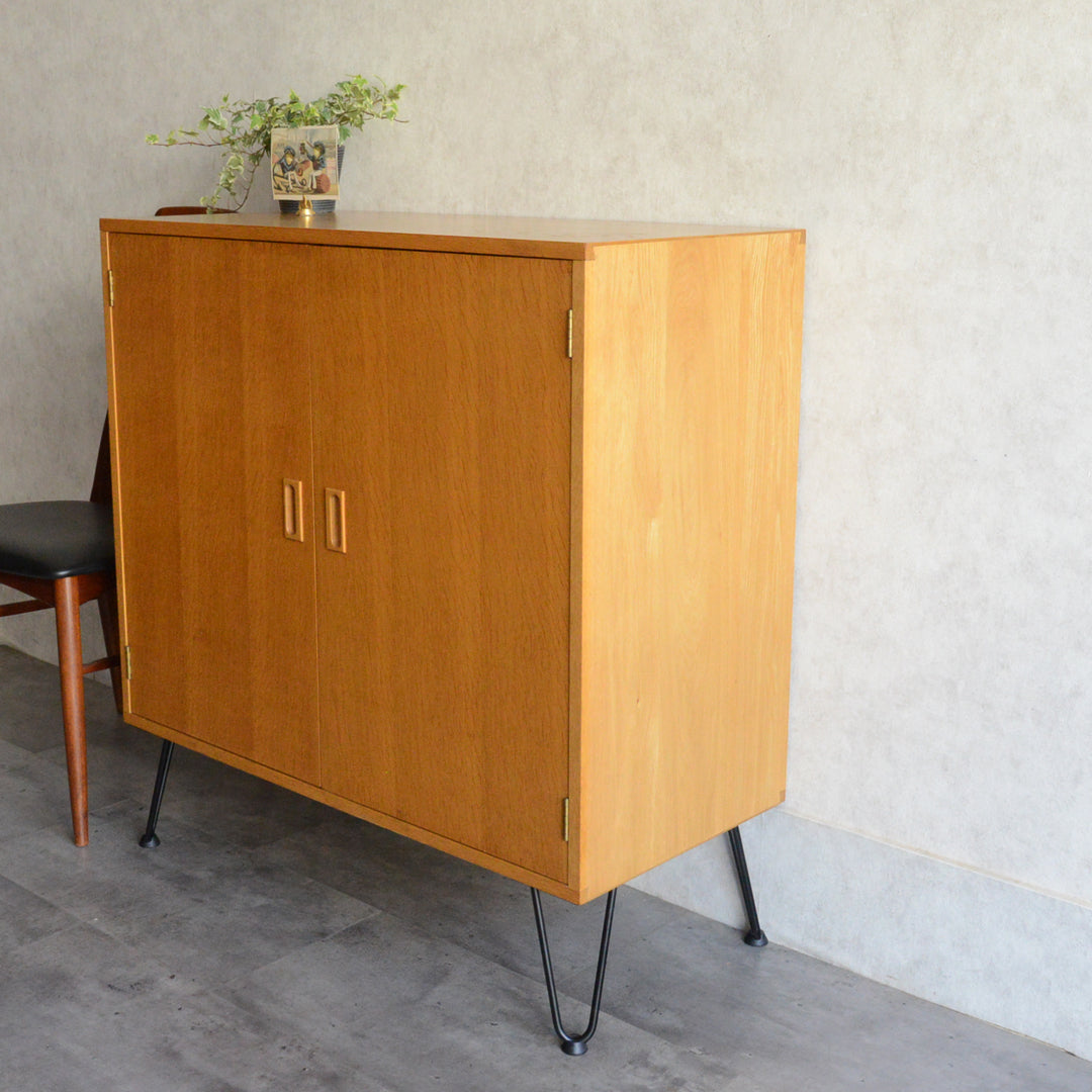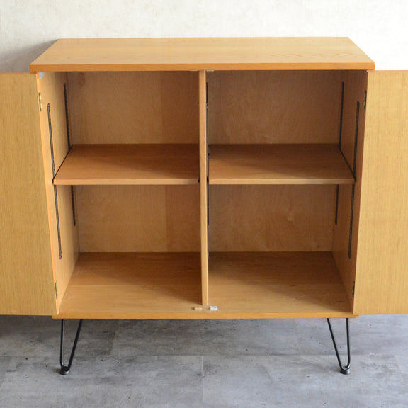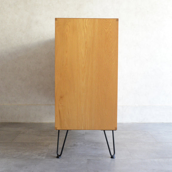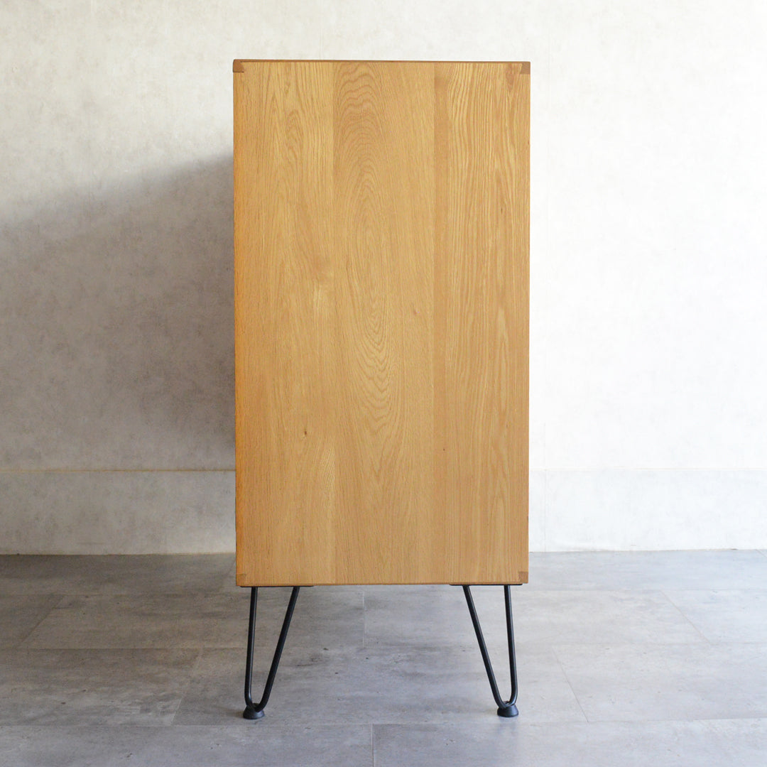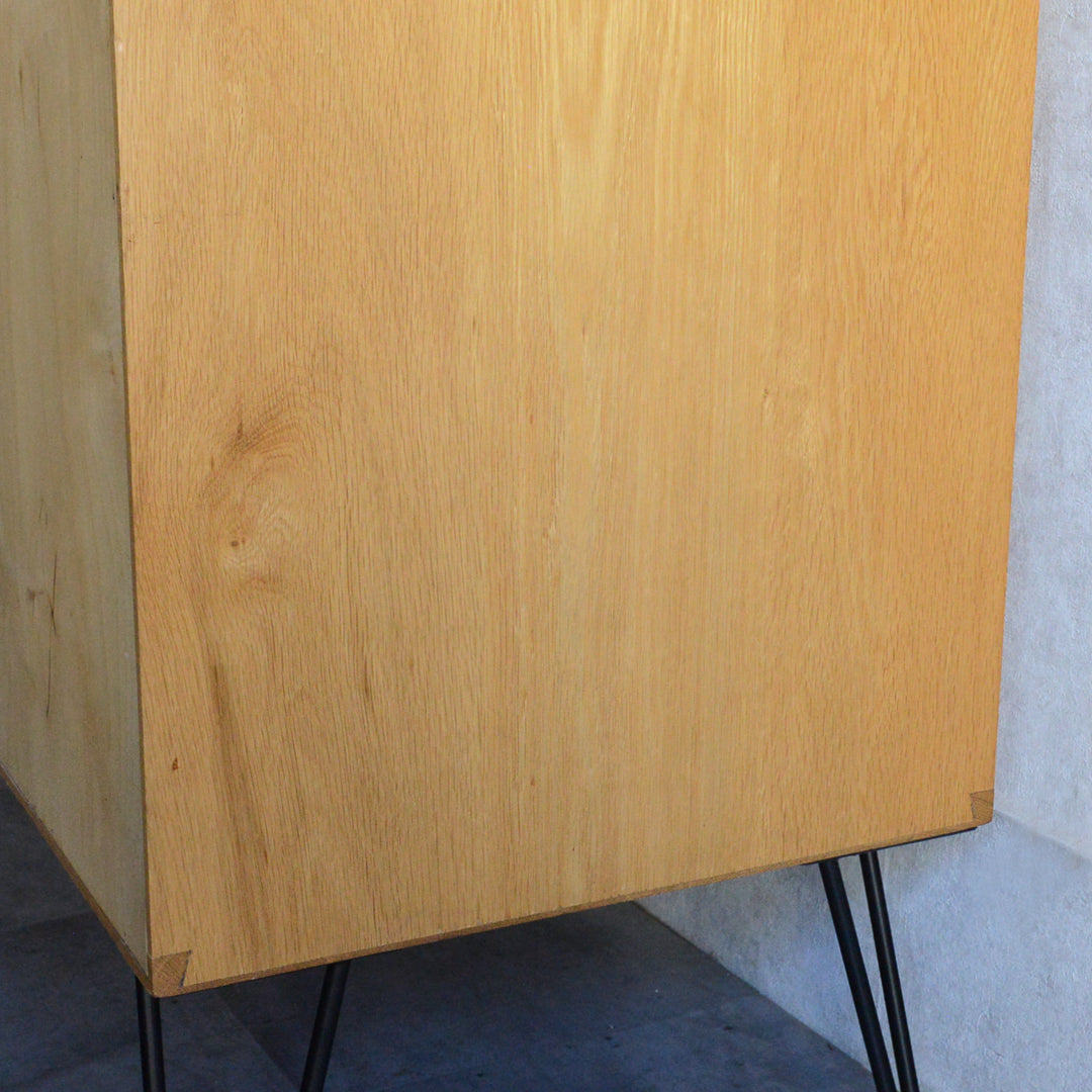オーク材のシンプルな本体にアイアンのヘアピンレッグで脚部をカスタムし、モダンなテイストがプラスされたキャビネット。