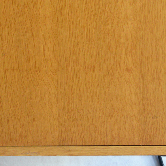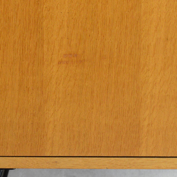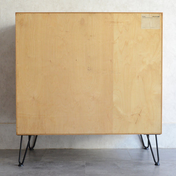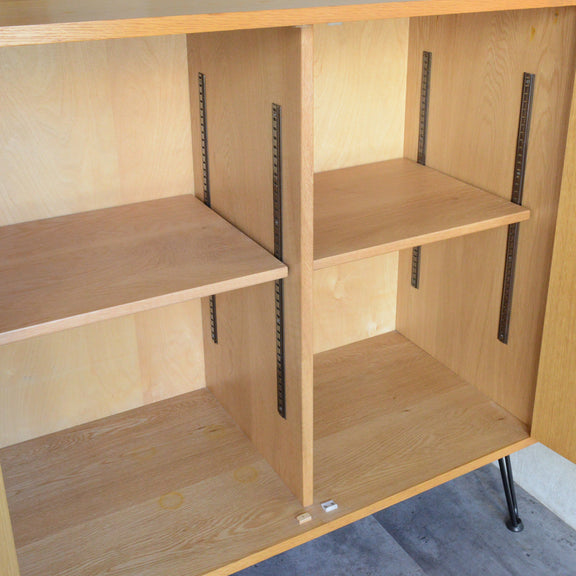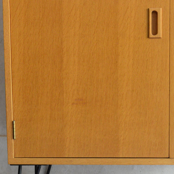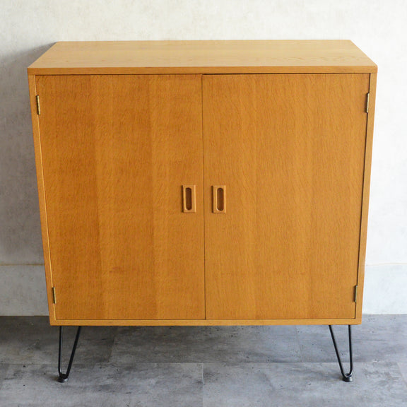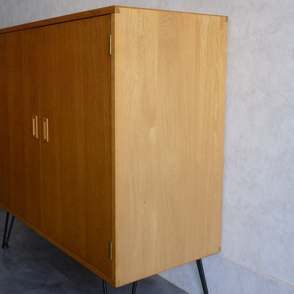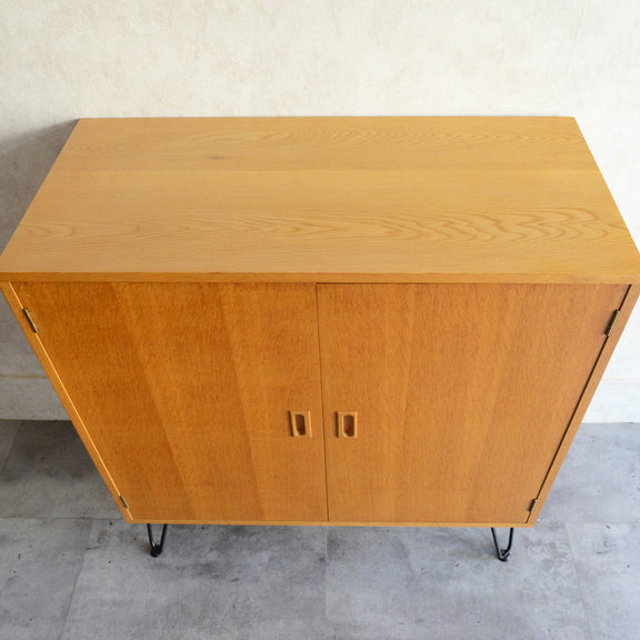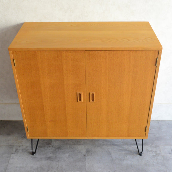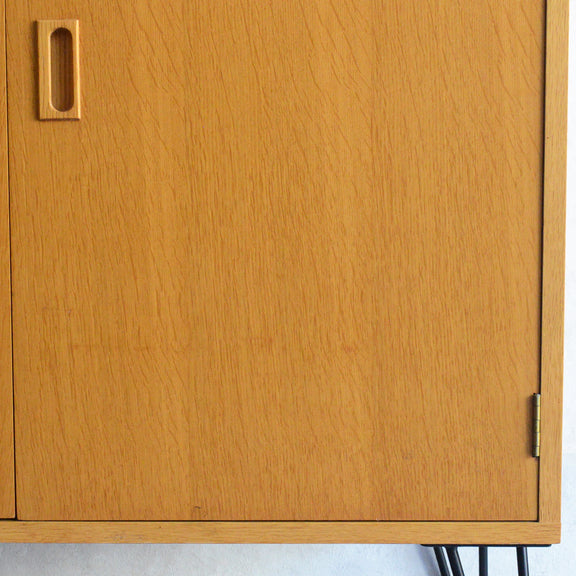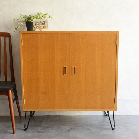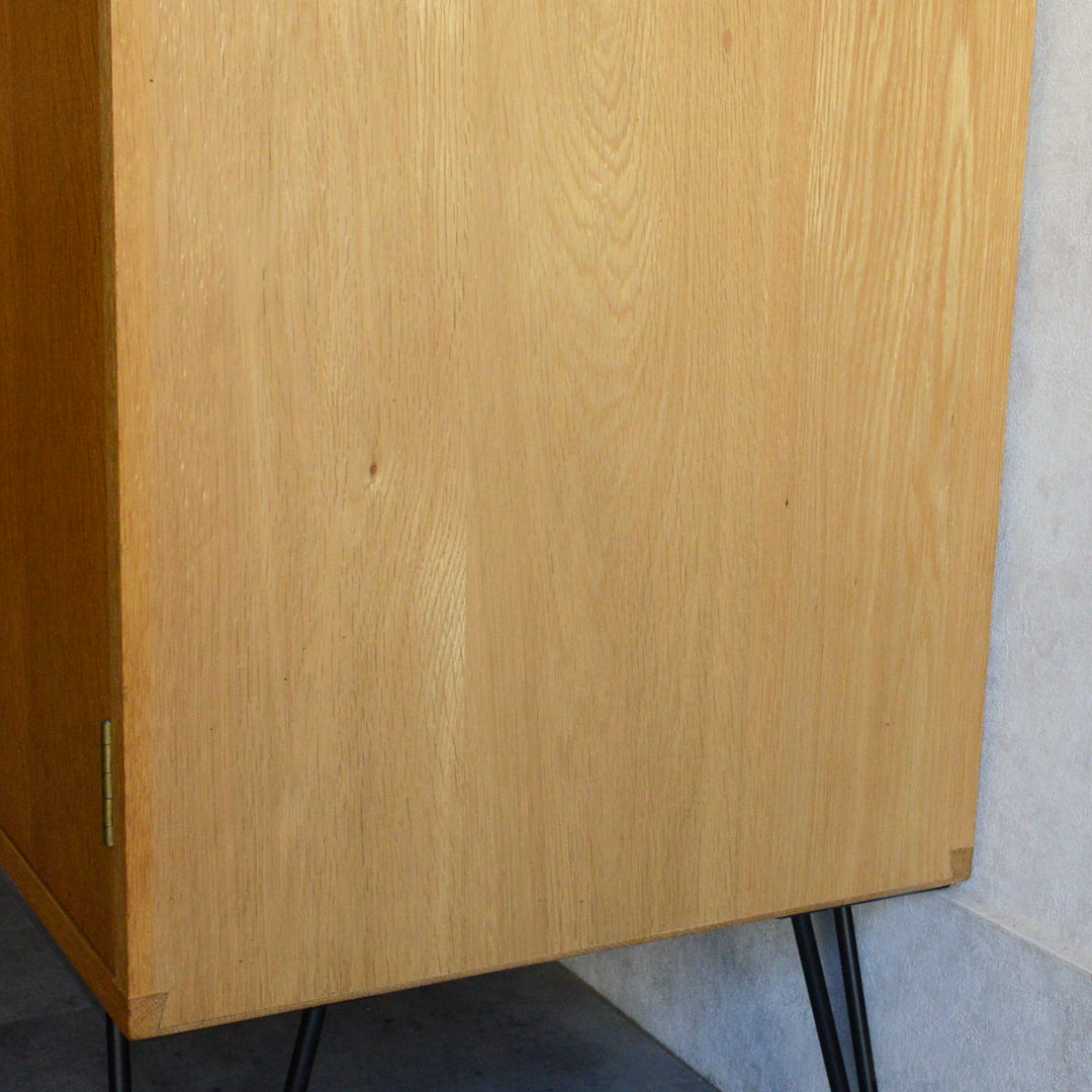 オーク材のシンプルな本体にアイアンのヘアピンレッグで脚部をカスタムし、モダンなテイストがプラスされたキャビネット。