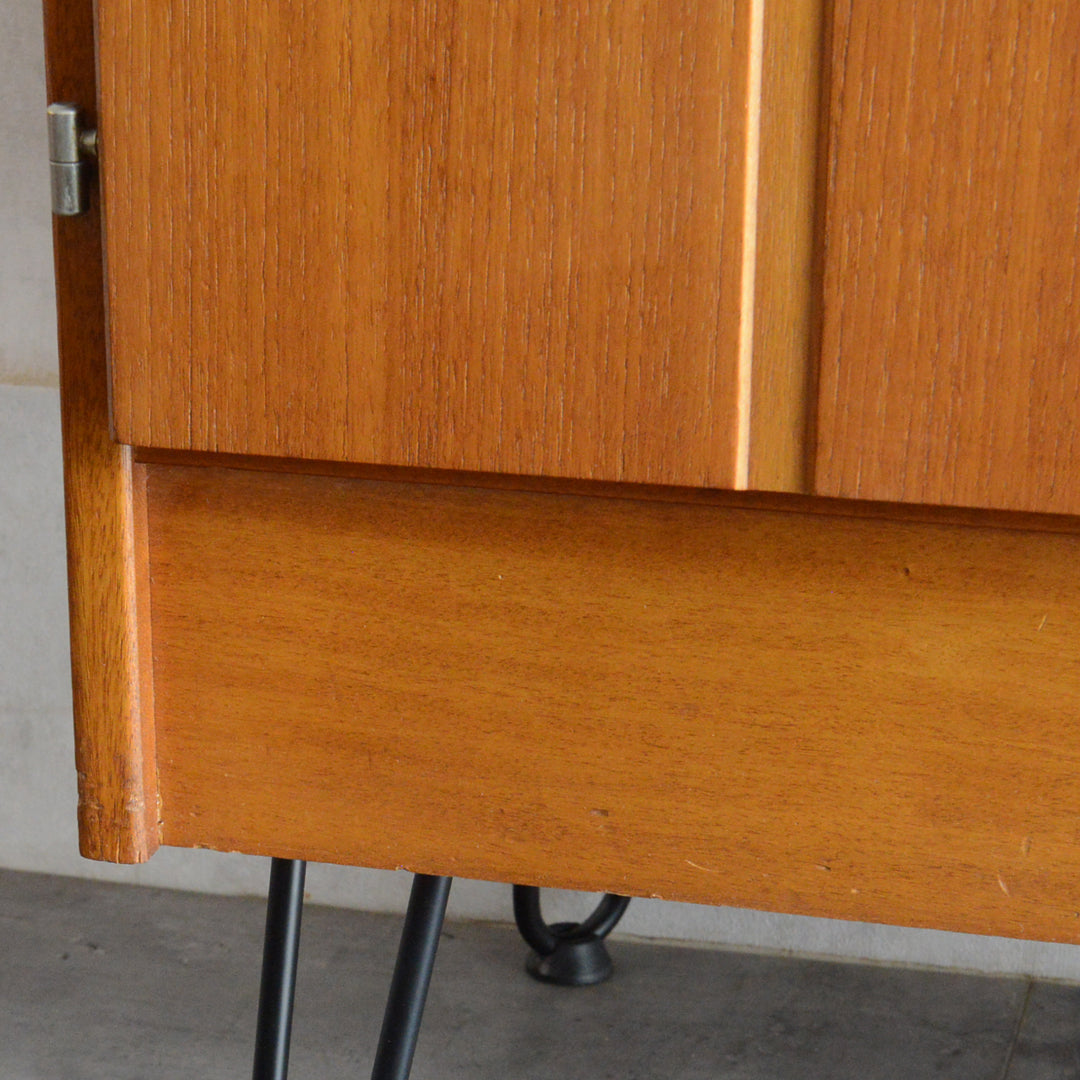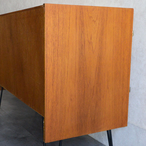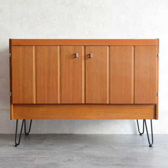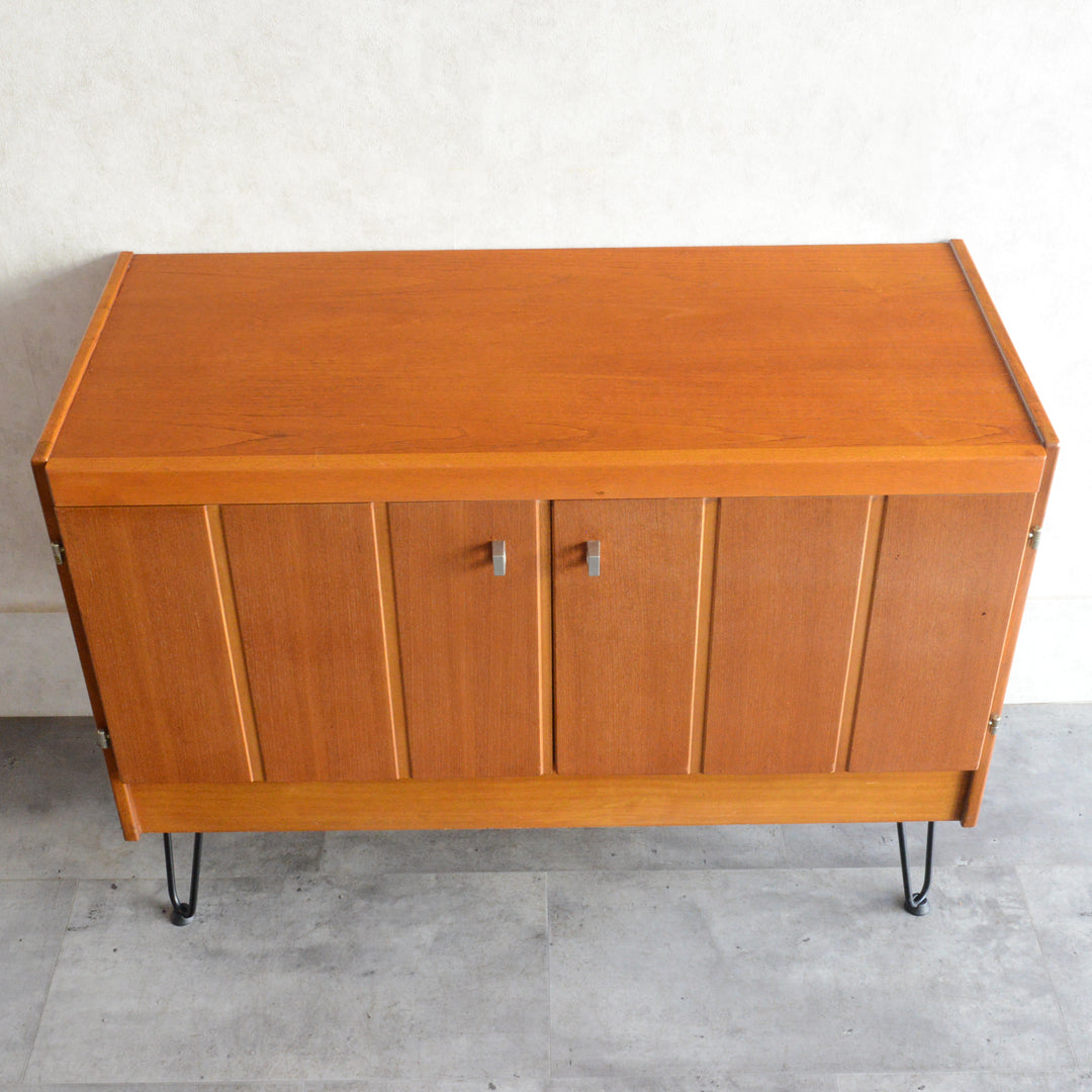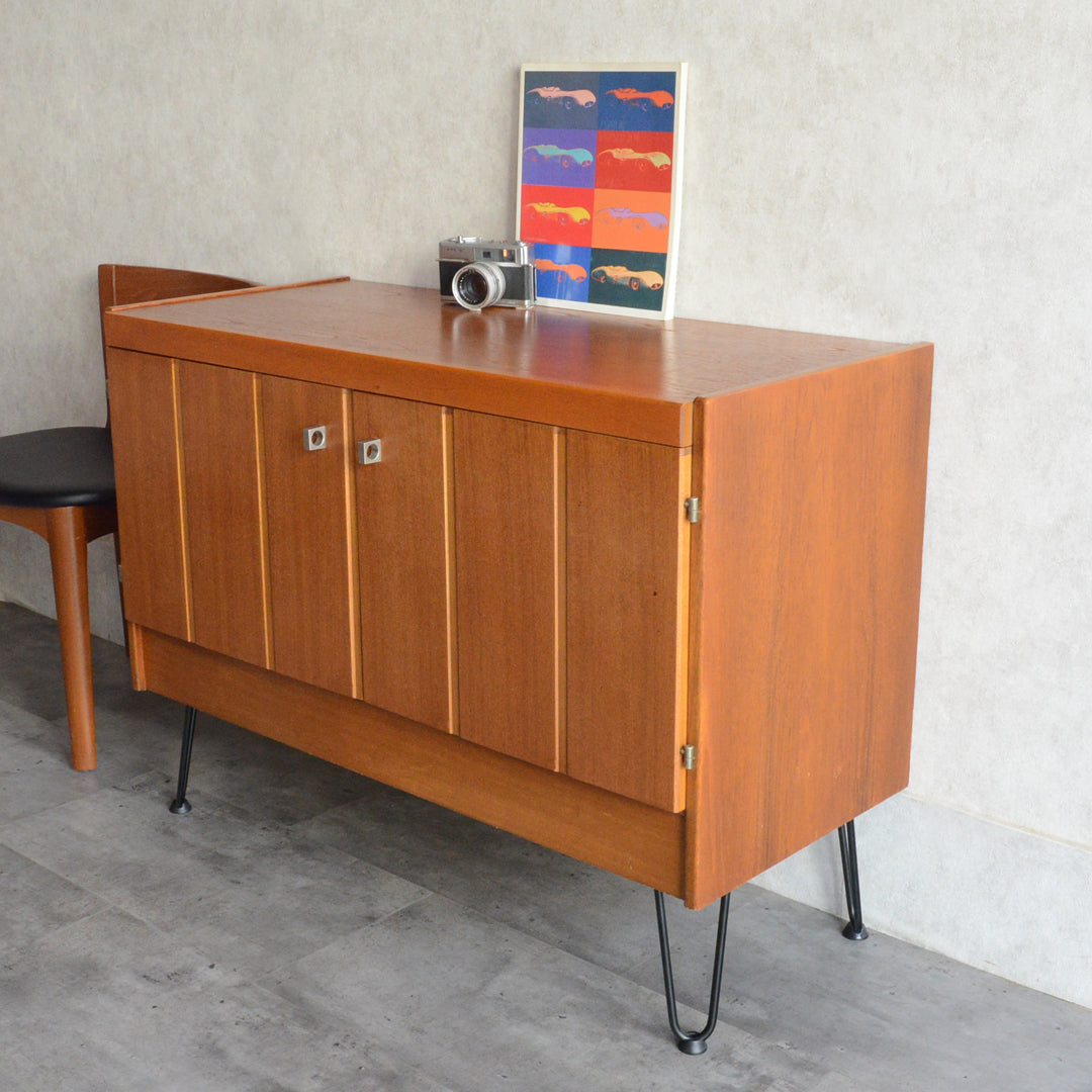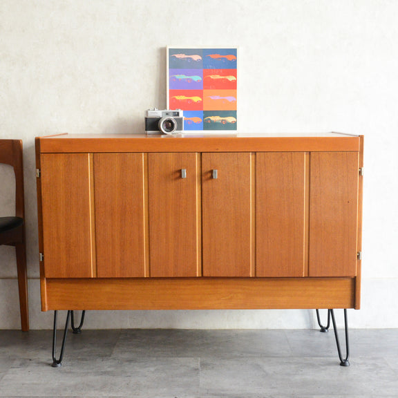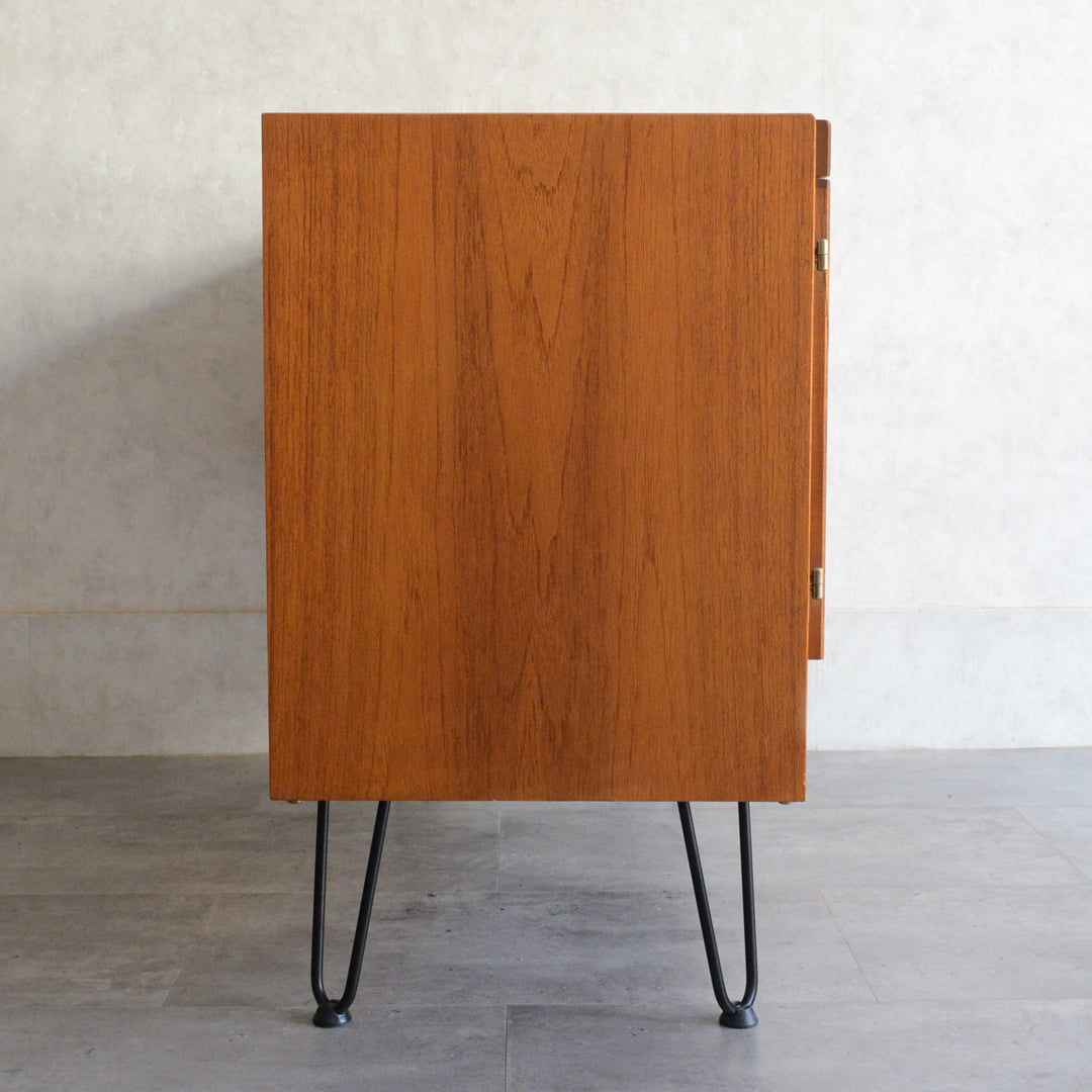 扉のスリットデザインとシルバーカラーのメタルの把手がスタイリッシュなキャビネット。アイアンのヘアピンレッグで脚部をカスタムし、モダンなテイストが加えられています。