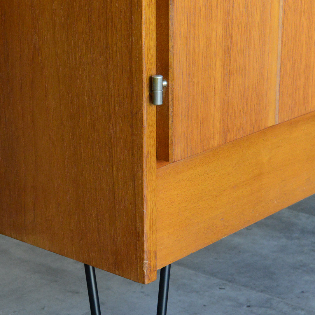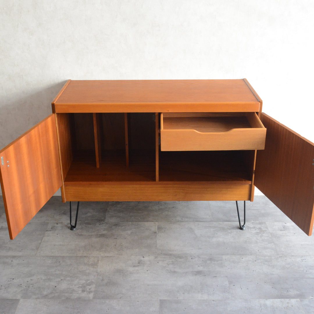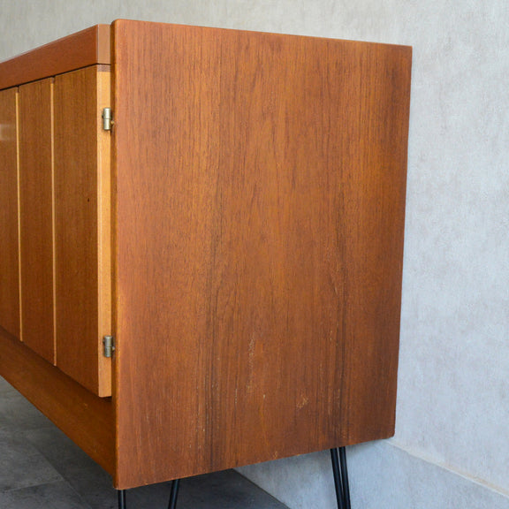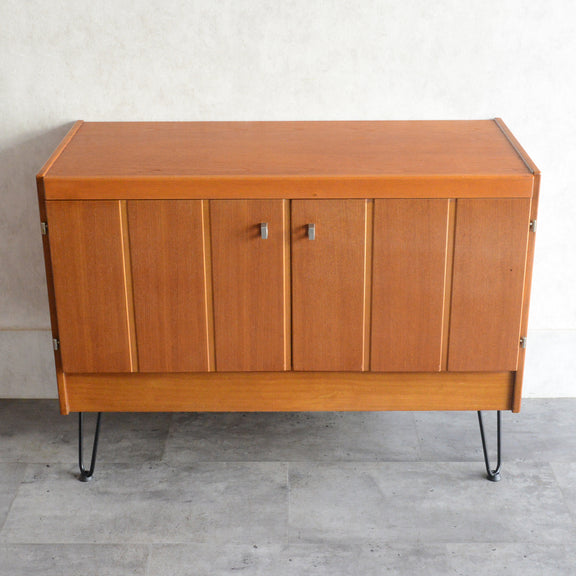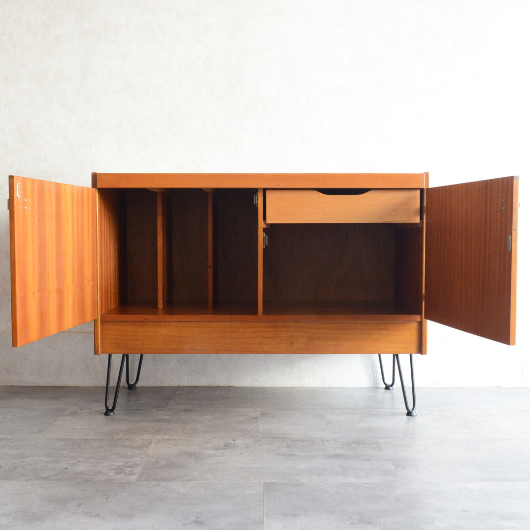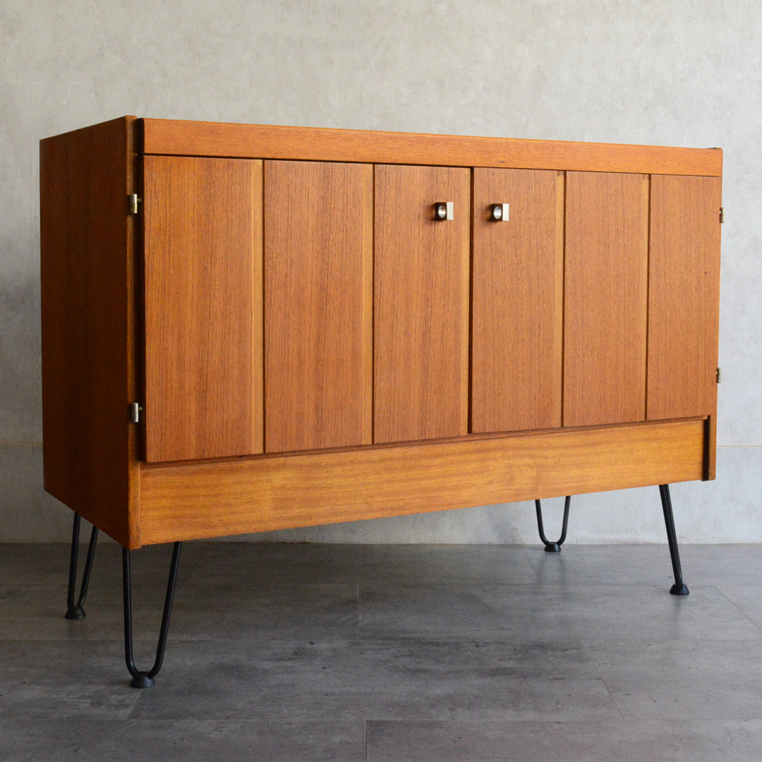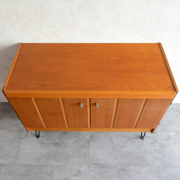 扉のスリットデザインとシルバーカラーのメタルの把手がスタイリッシュなキャビネット。アイアンのヘアピンレッグで脚部をカスタムし、モダンなテイストが加えられています。