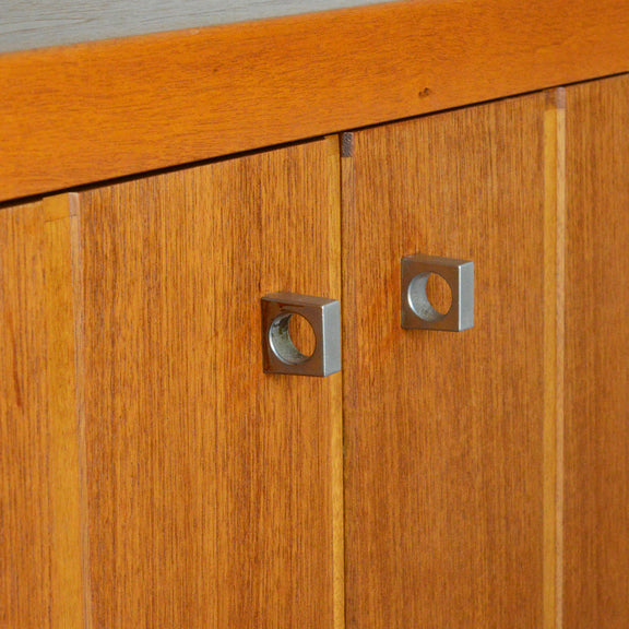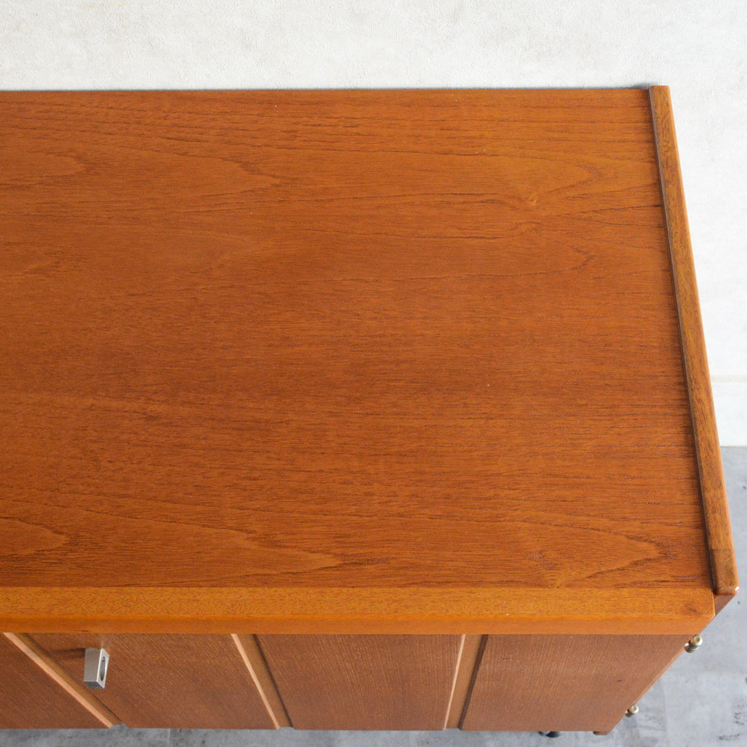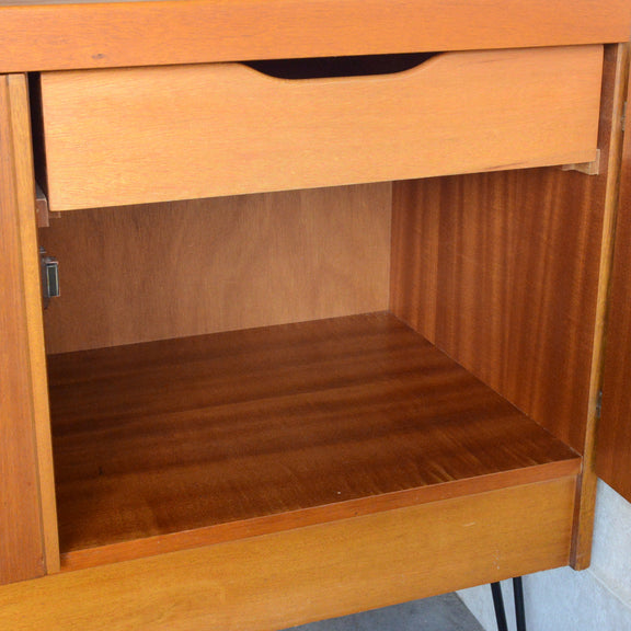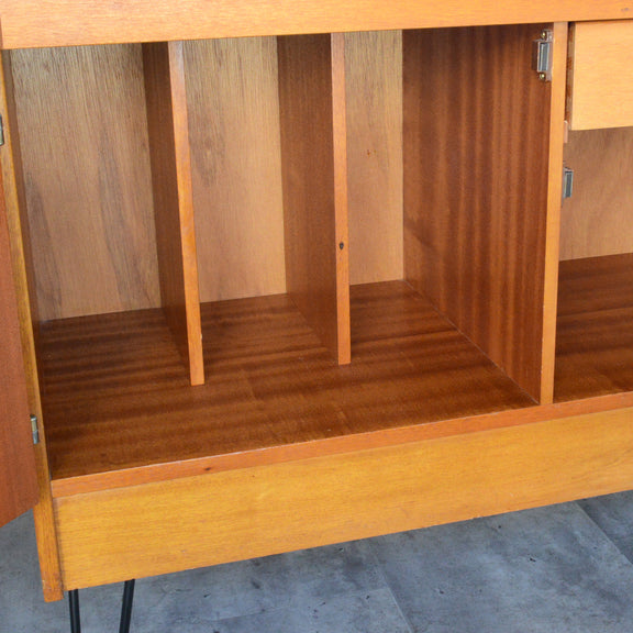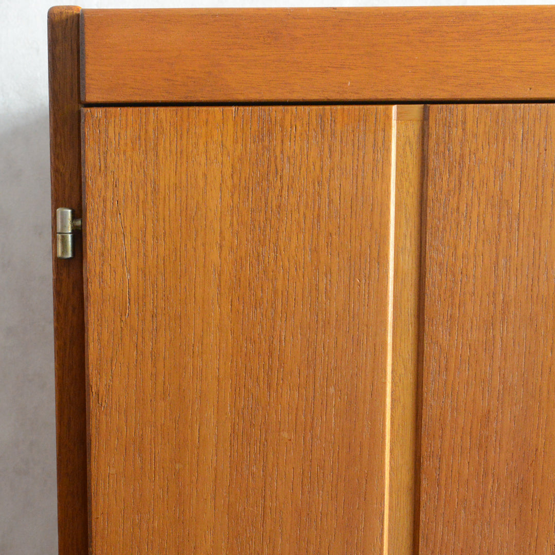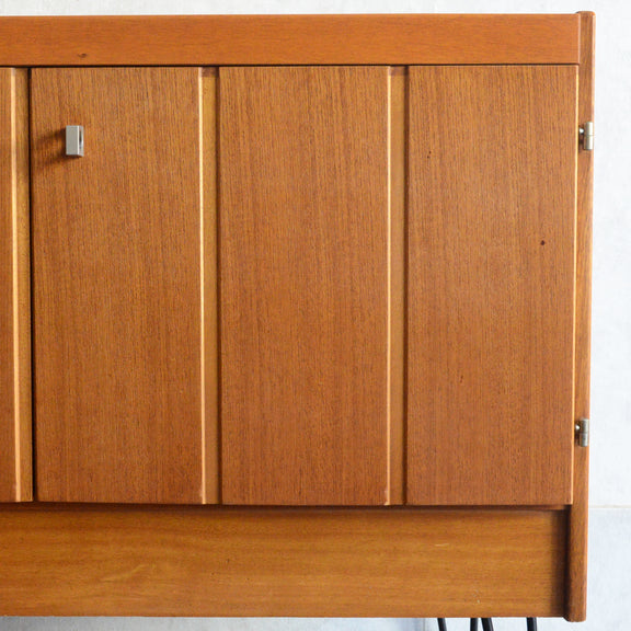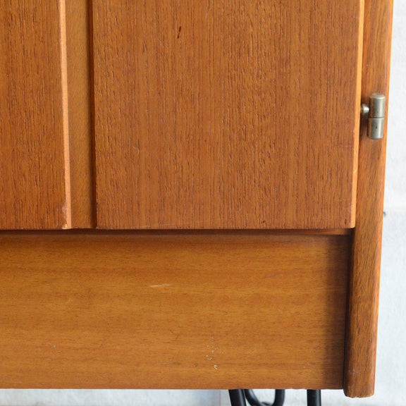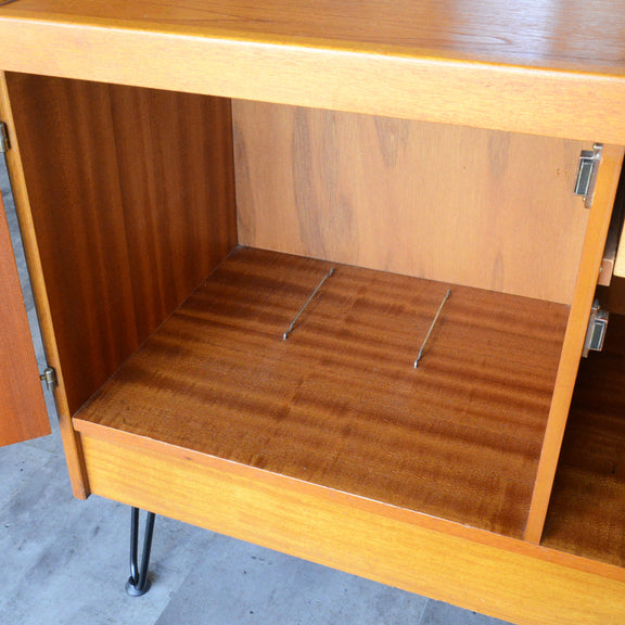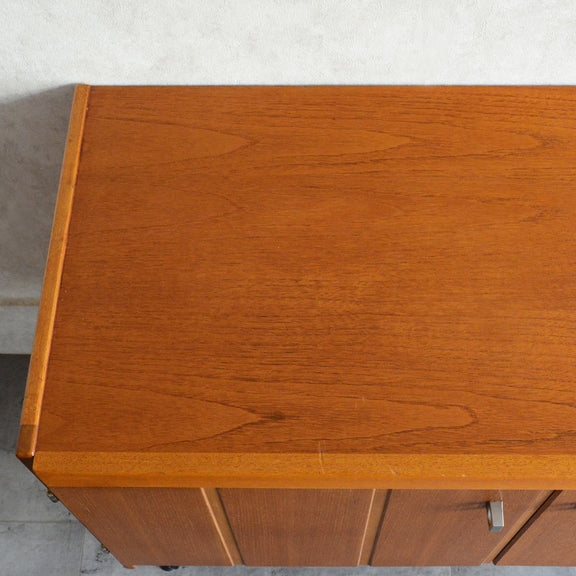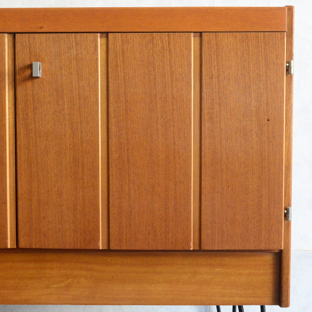 扉のスリットデザインとシルバーカラーのメタルの把手がスタイリッシュなキャビネット。アイアンのヘアピンレッグで脚部をカスタムし、モダンなテイストが加えられています。