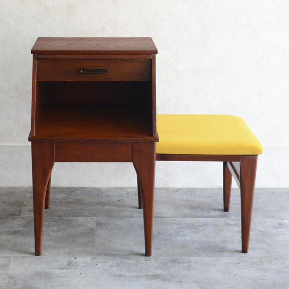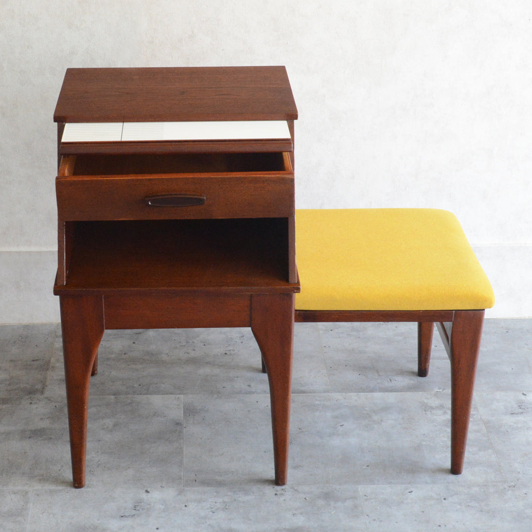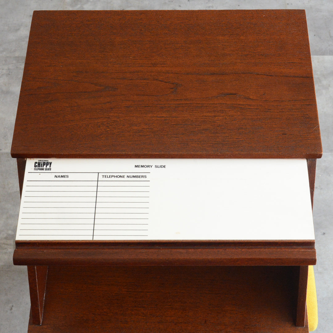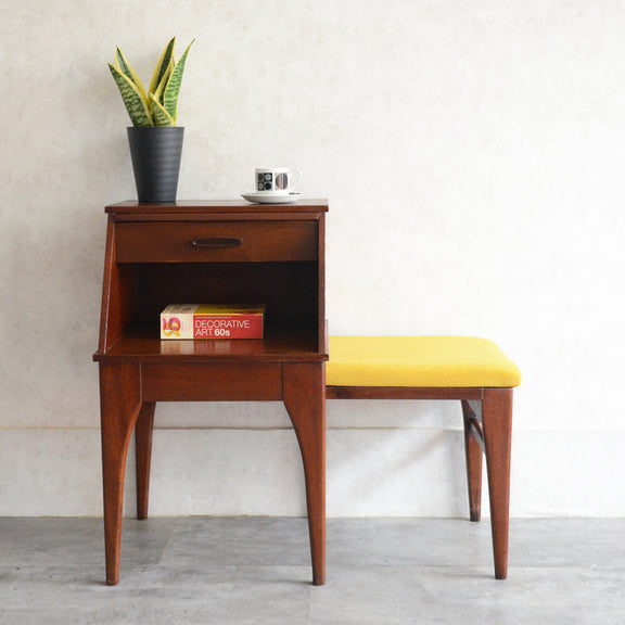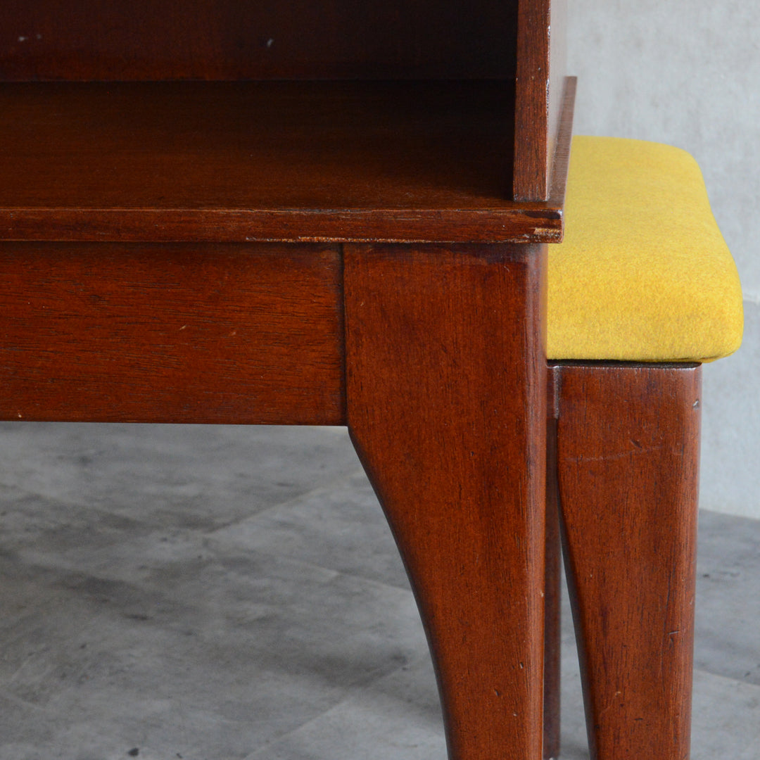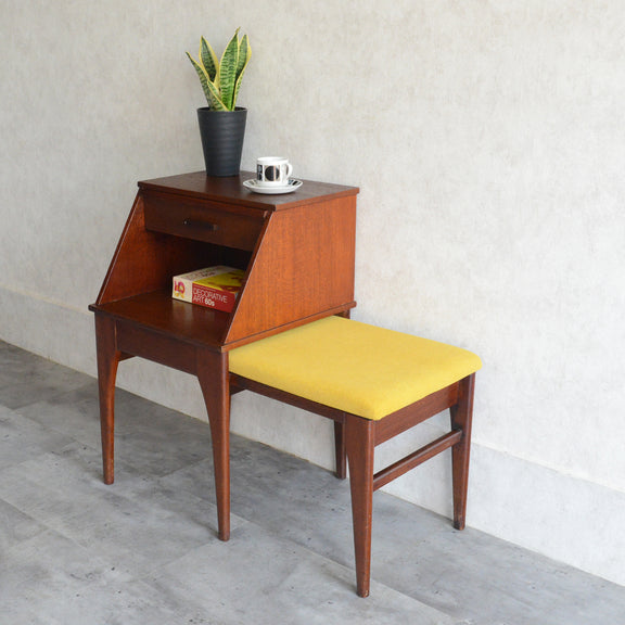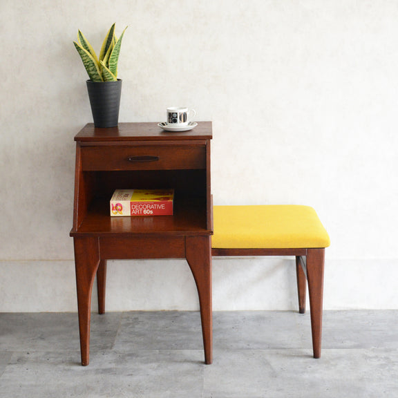ミッドセンチュリーに流行した、天板に固定電話を置いてベンチに座りながら電話をする為のレトロな家具です。座面部分は押し込むだけで本体に収納可能です。