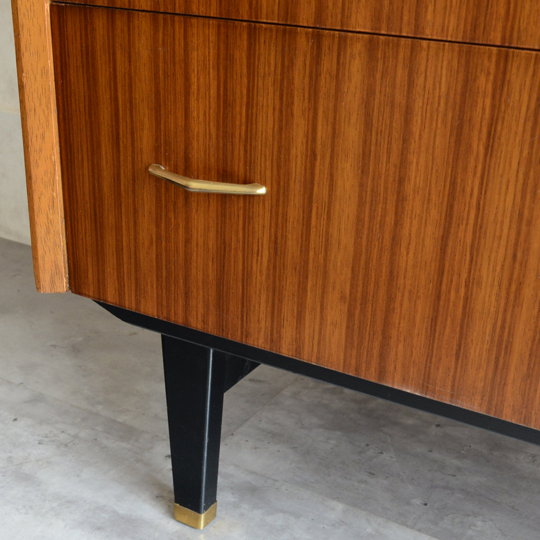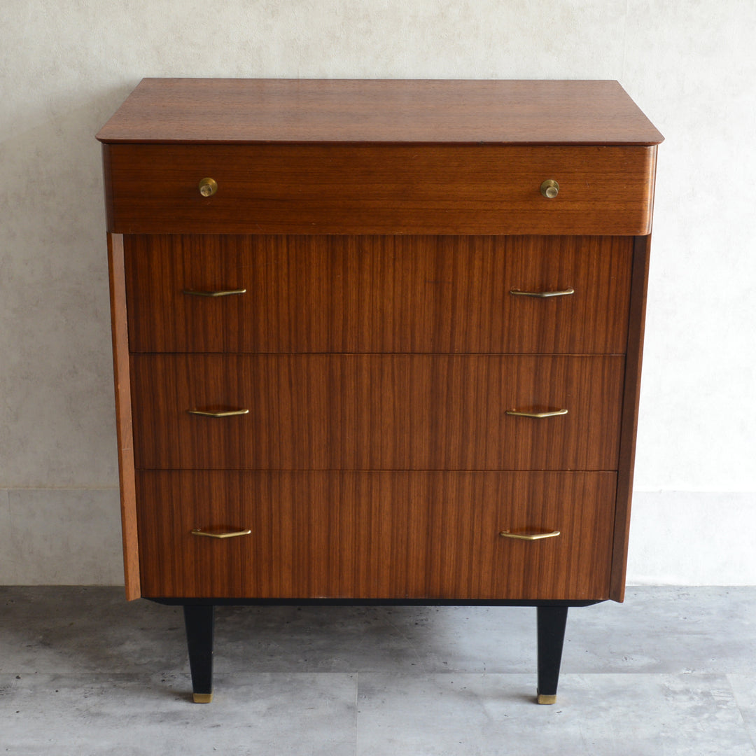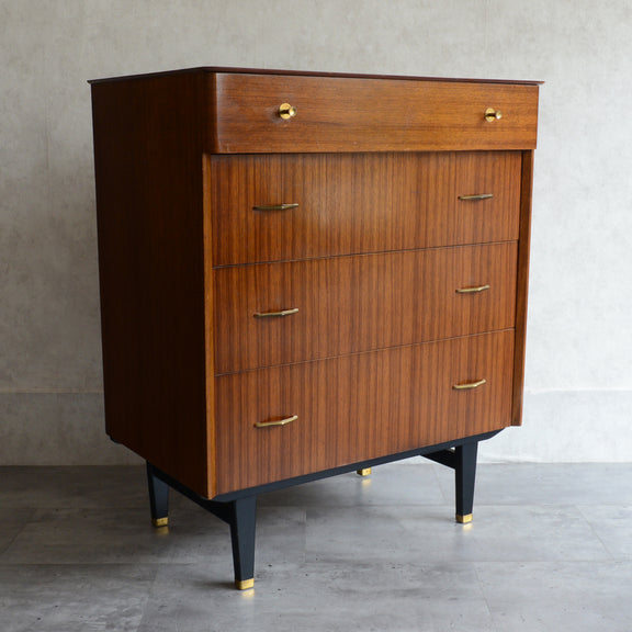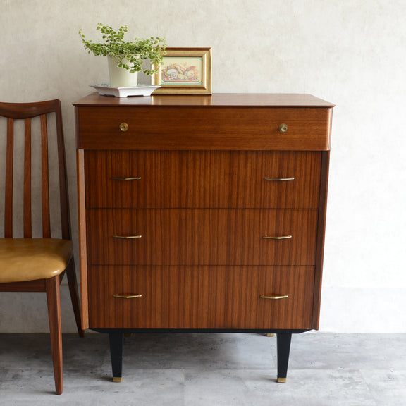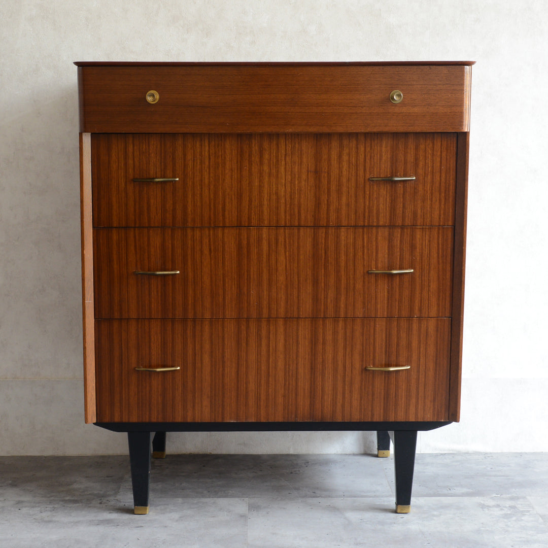 ブラックの脚部、金属の取っ手と脚先が特徴的な4段チェスト