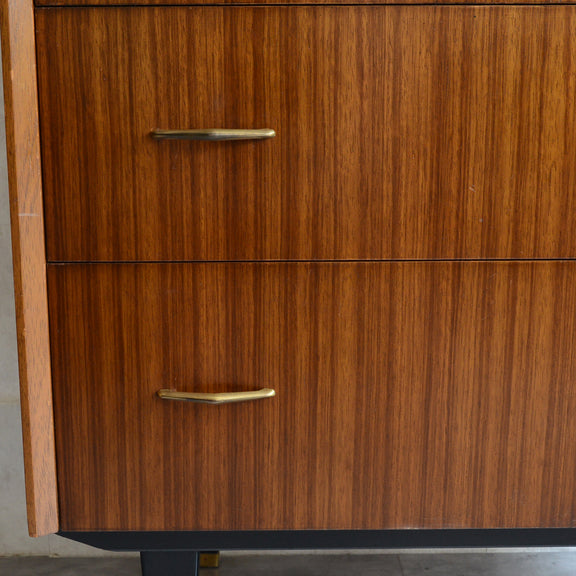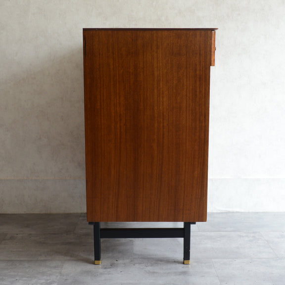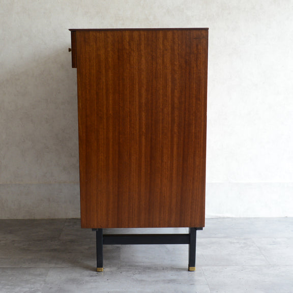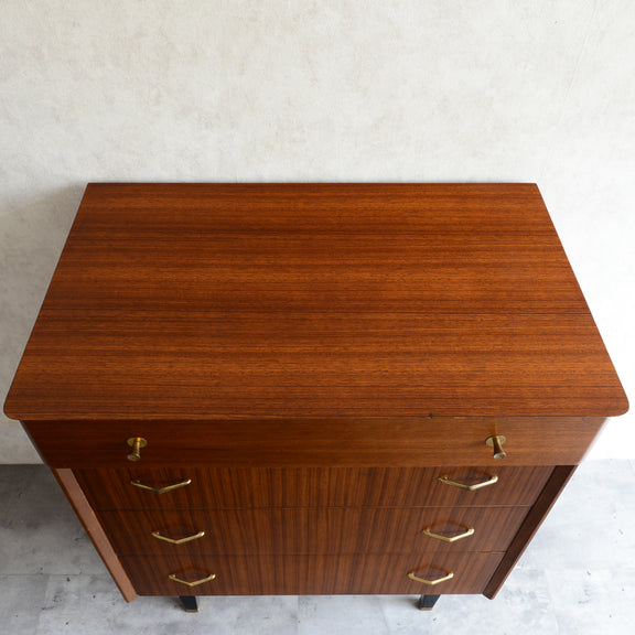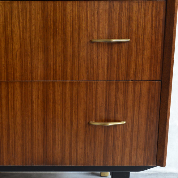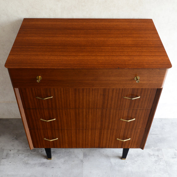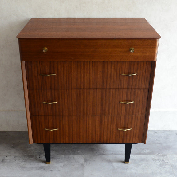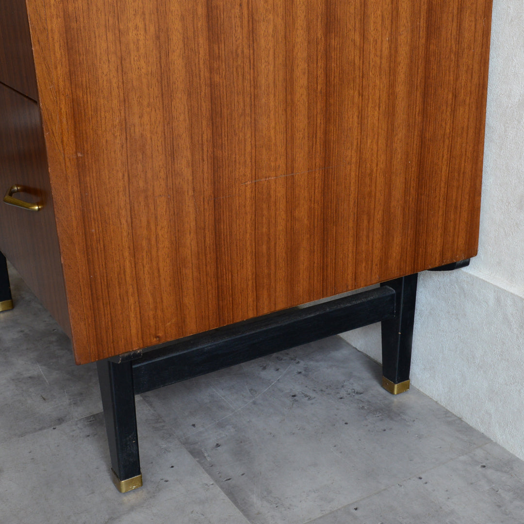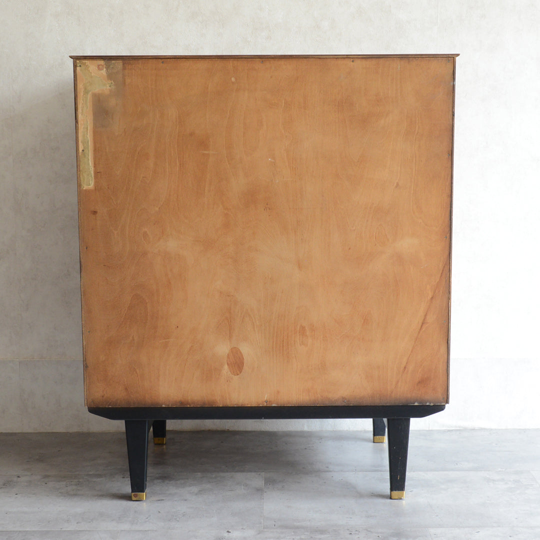 ブラックの脚部、金属の取っ手と脚先が特徴的な4段チェスト