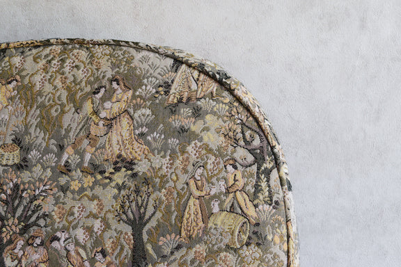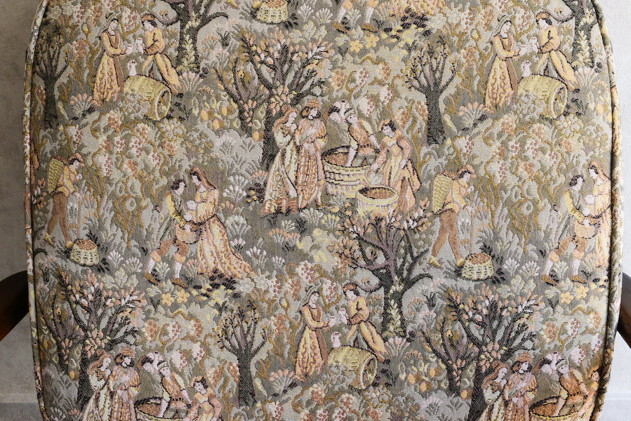 クッションは葡萄?の収穫作業の柄のヴィンテージファブリックです。