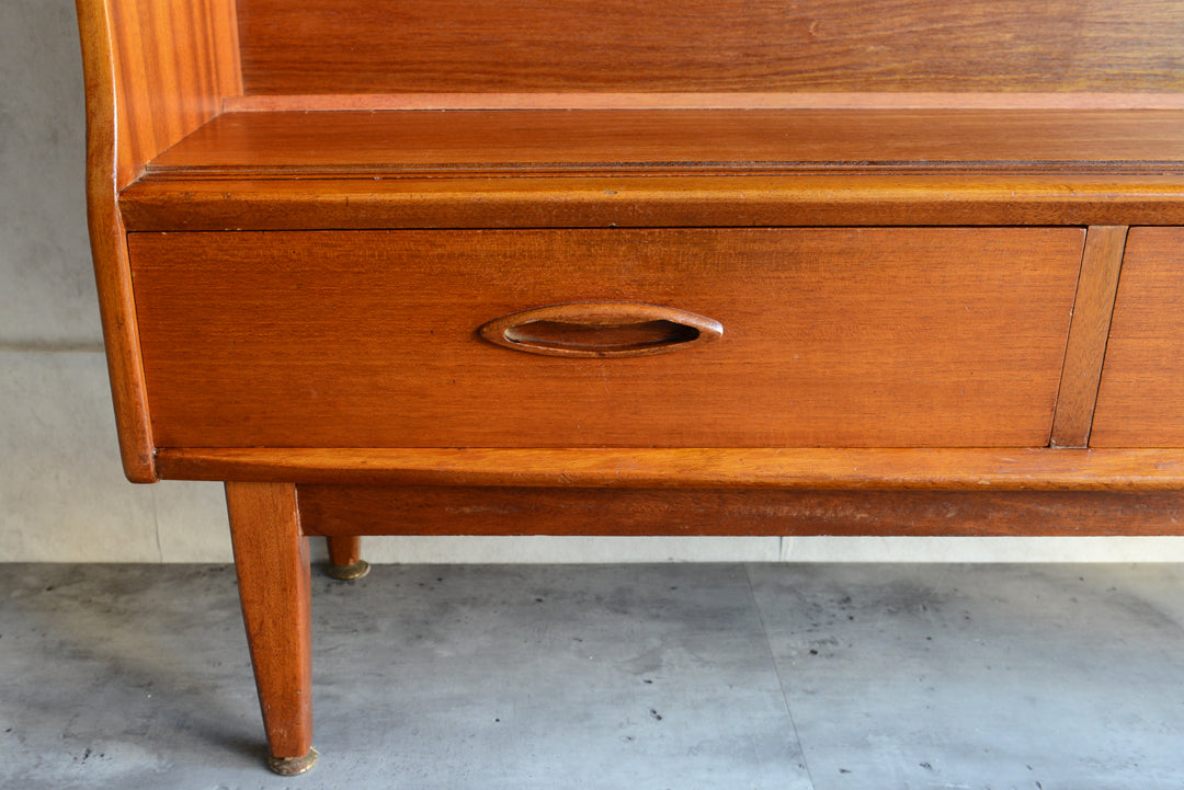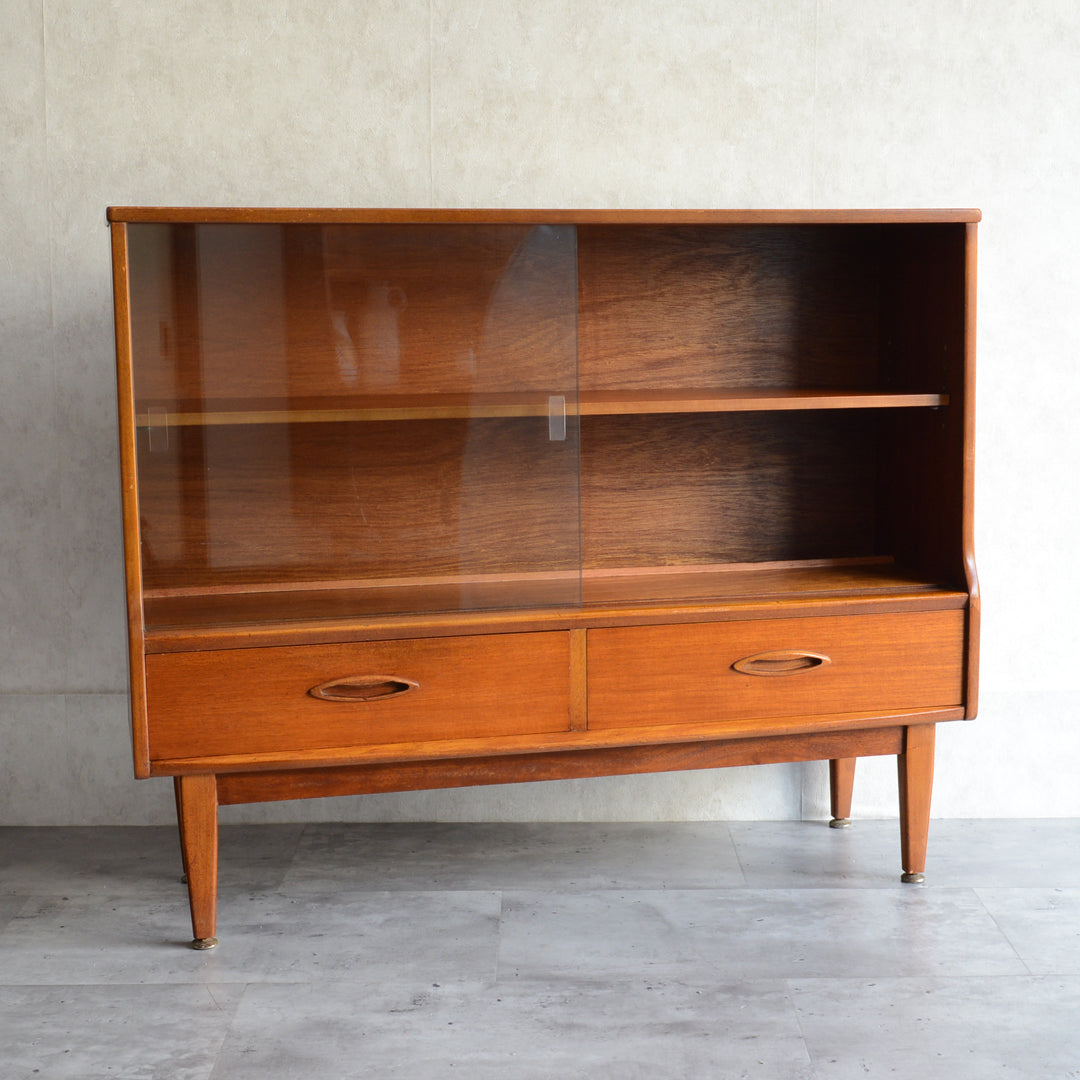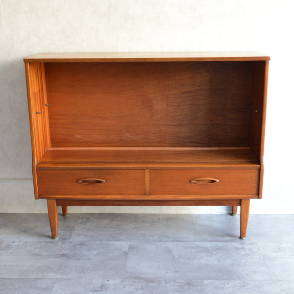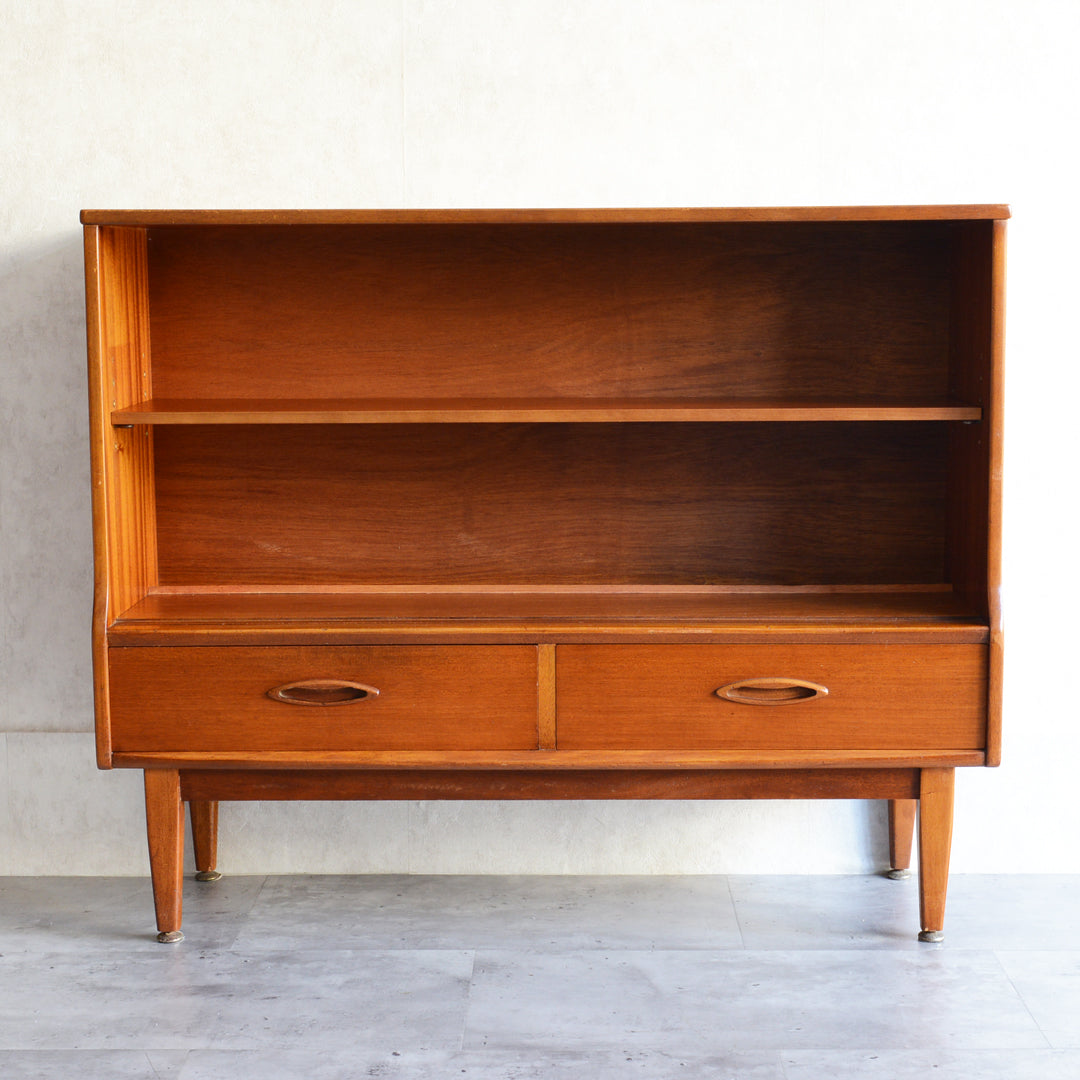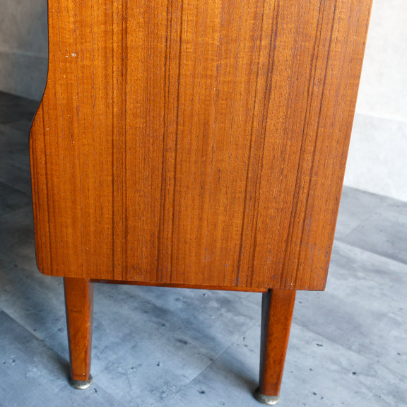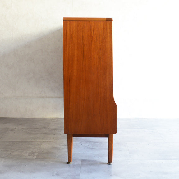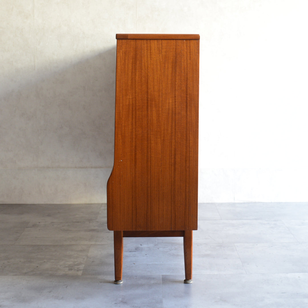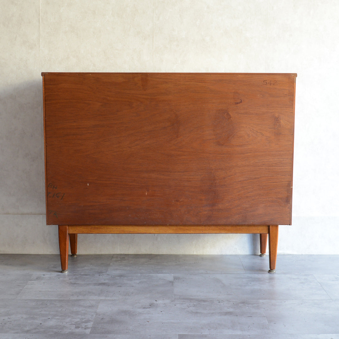 ジェンティーク独特の葉っぱの様な引き出しの取手と、金属が付いた脚部がミッドセンチュリーらしいコンパクトなキャビネット