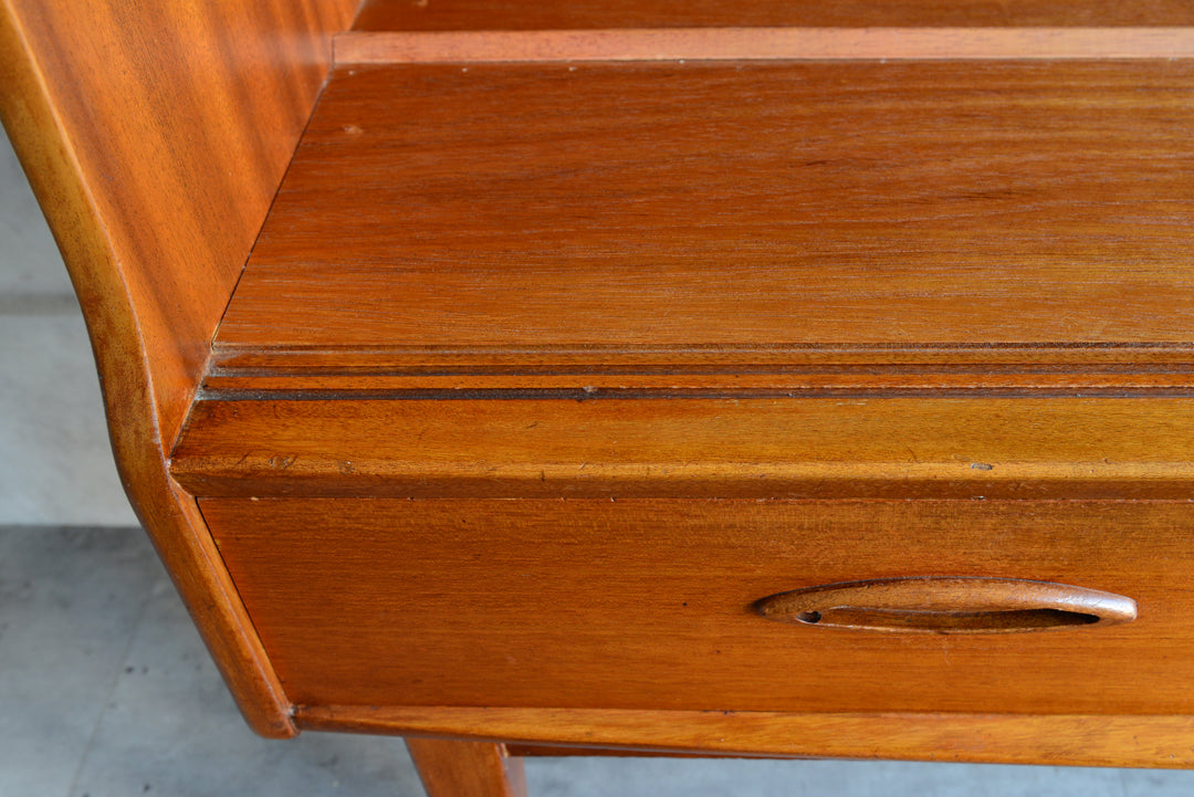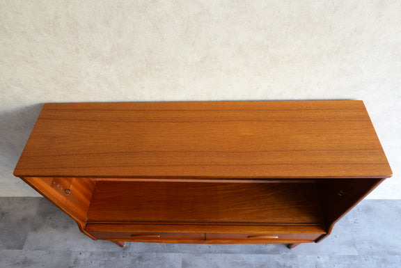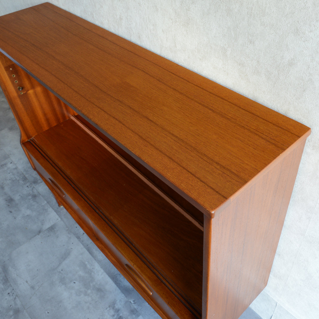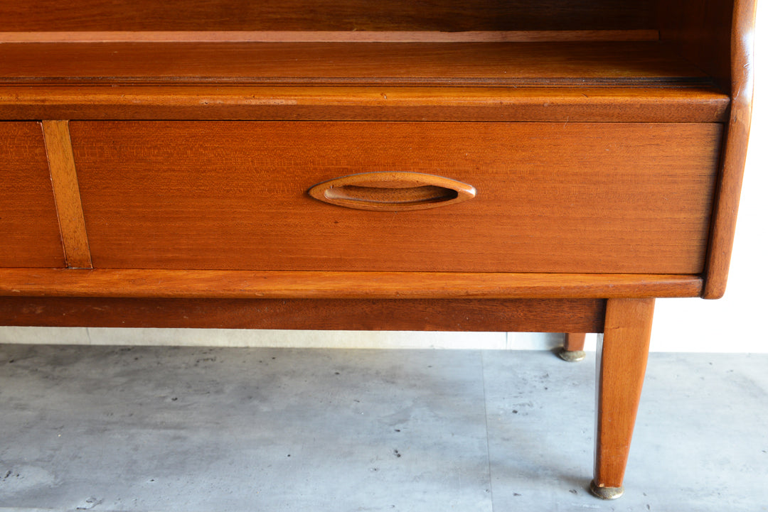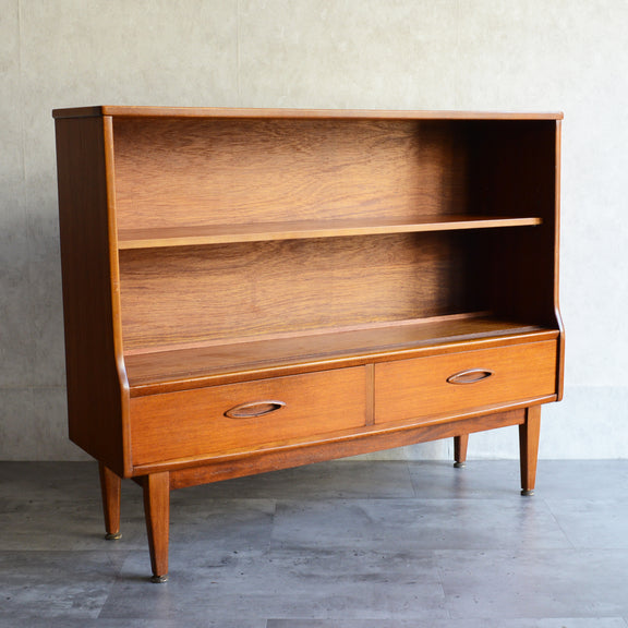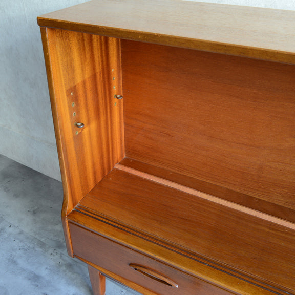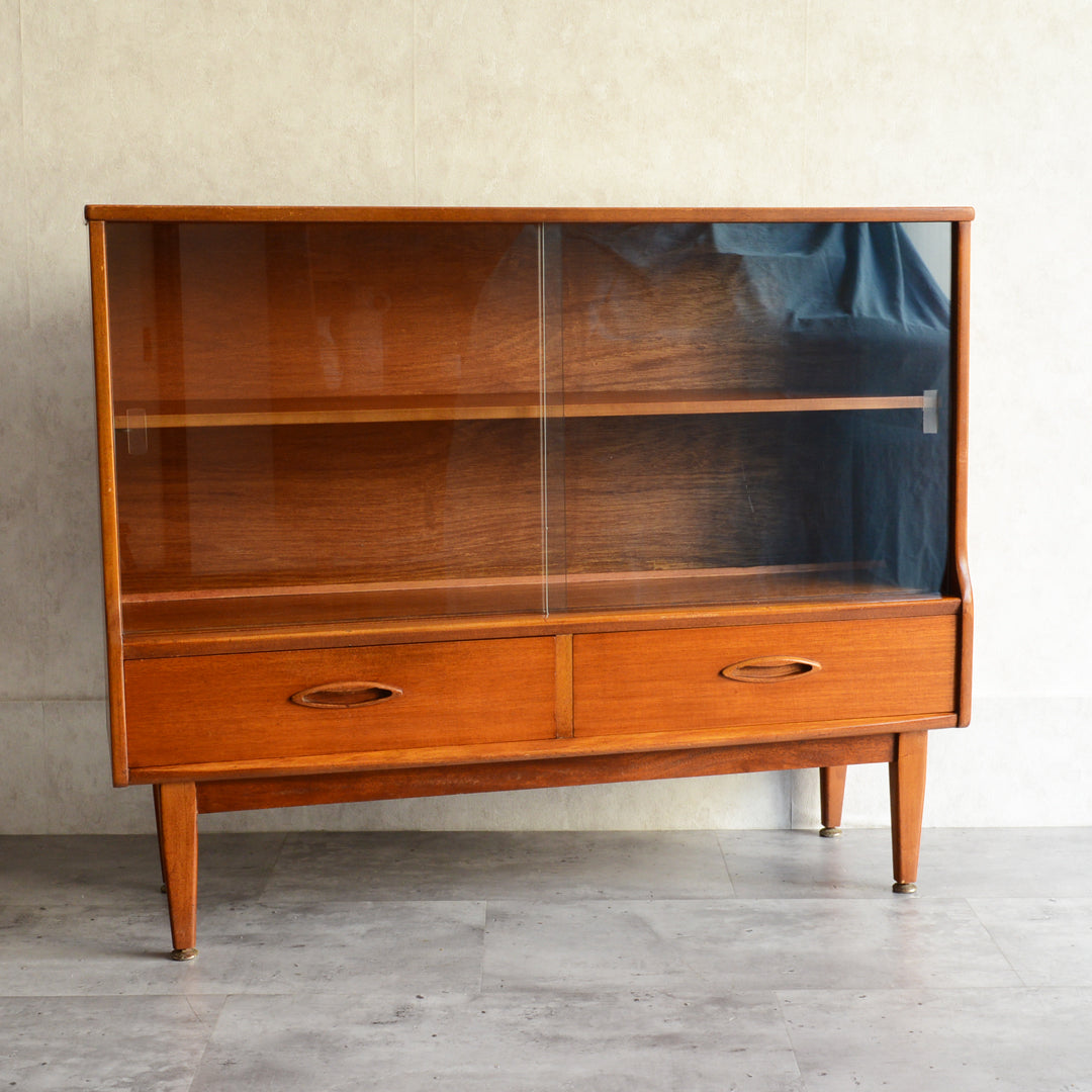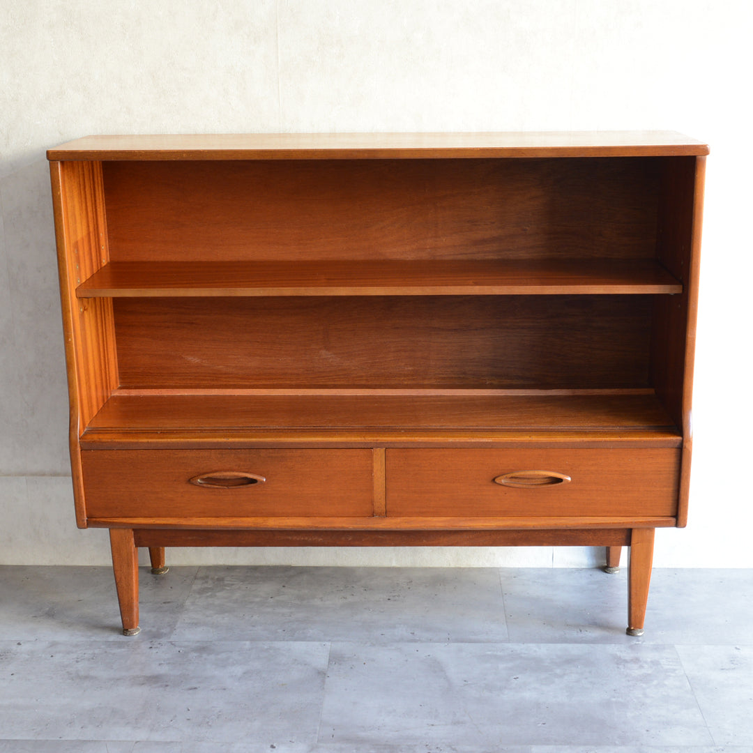 ジェンティーク独特の葉っぱの様な引き出しの取手と、金属が付いた脚部がミッドセンチュリーらしいコンパクトなキャビネット