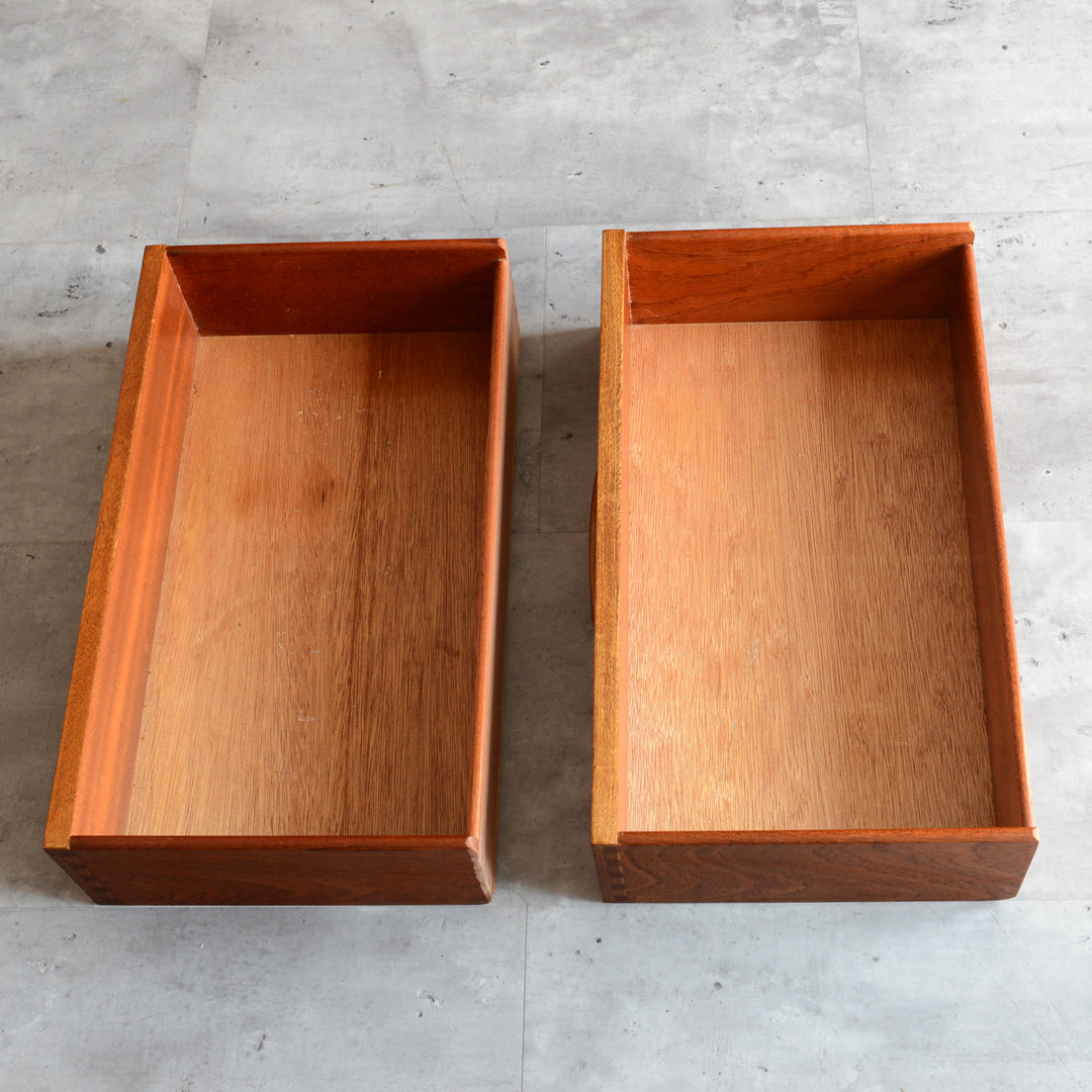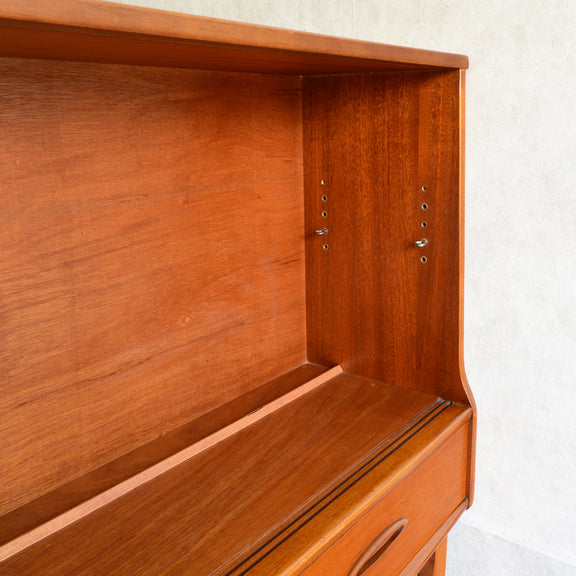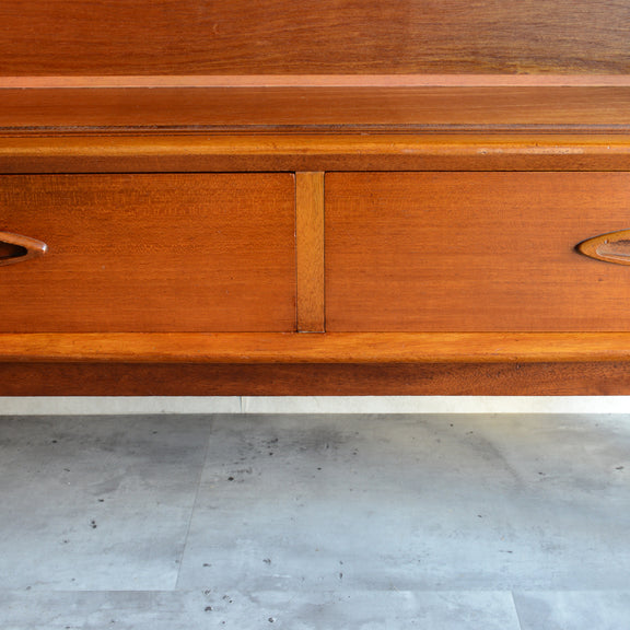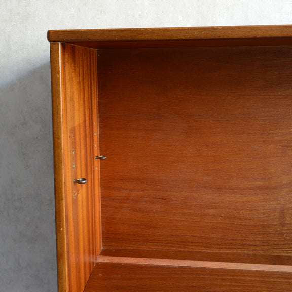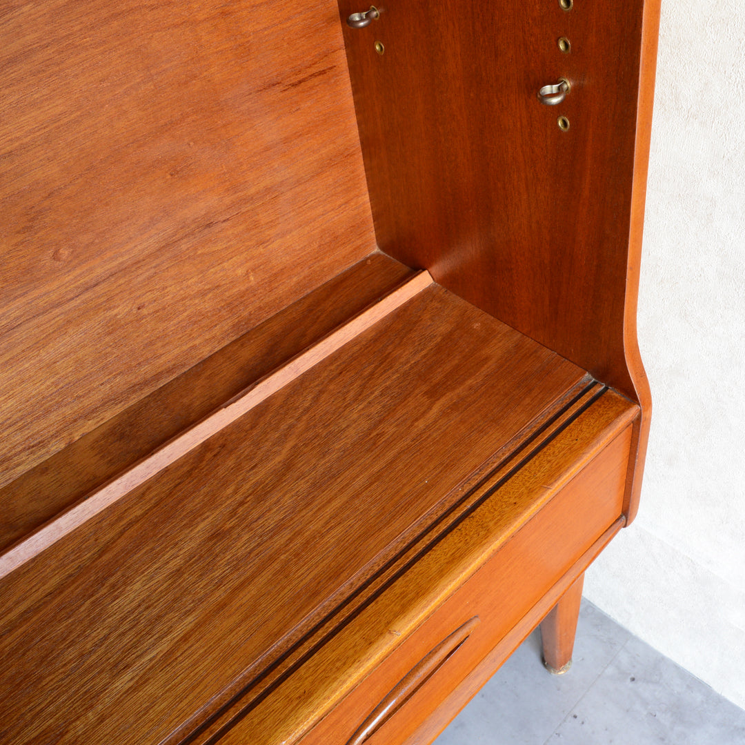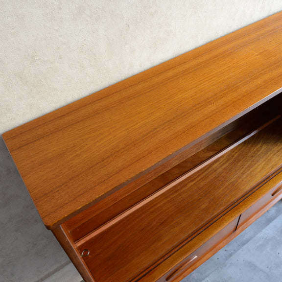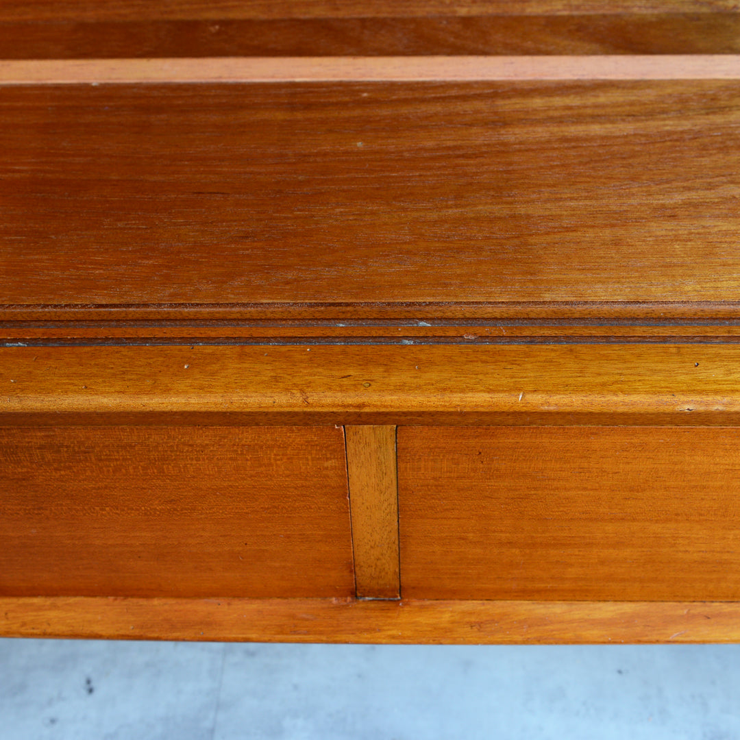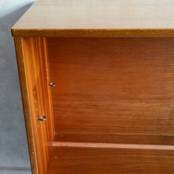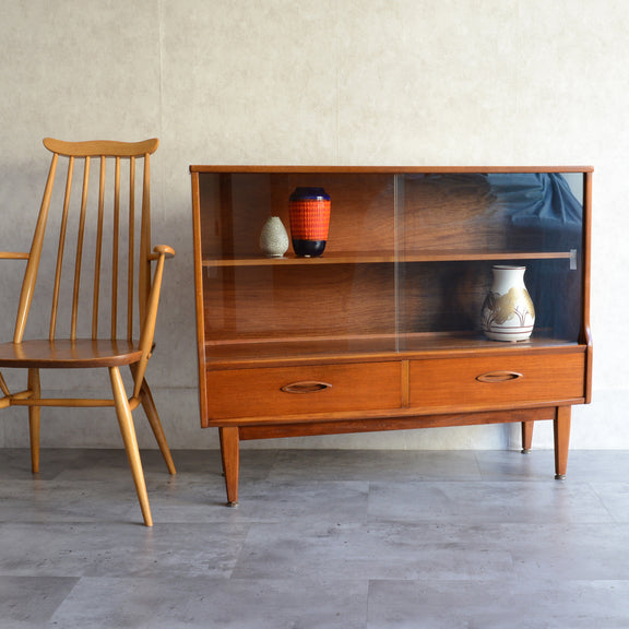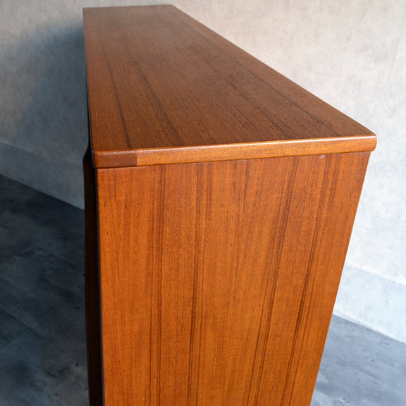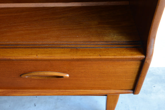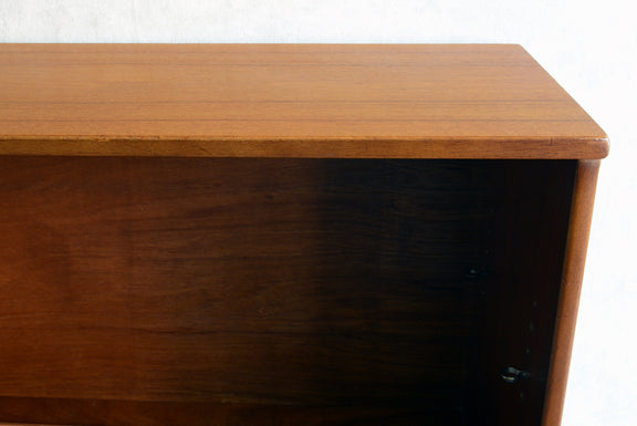 ジェンティーク独特の葉っぱの様な引き出しの取手と、金属が付いた脚部がミッドセンチュリーらしいコンパクトなキャビネット