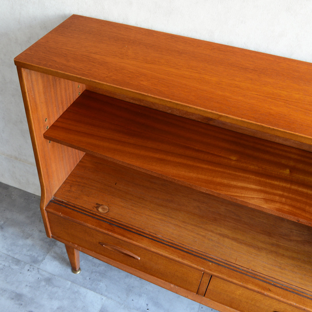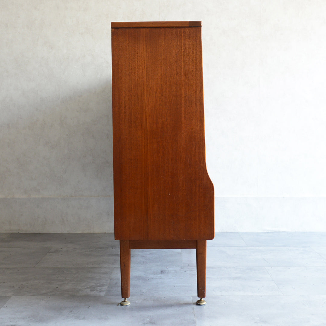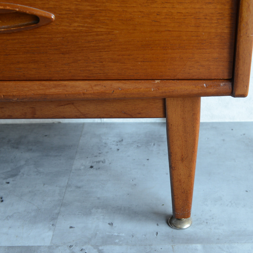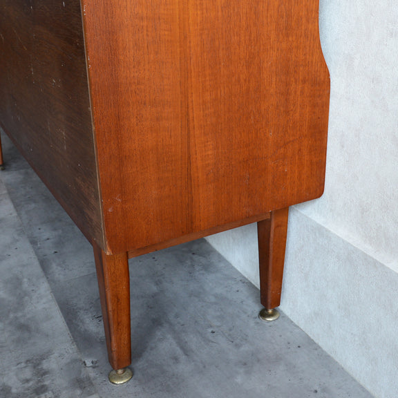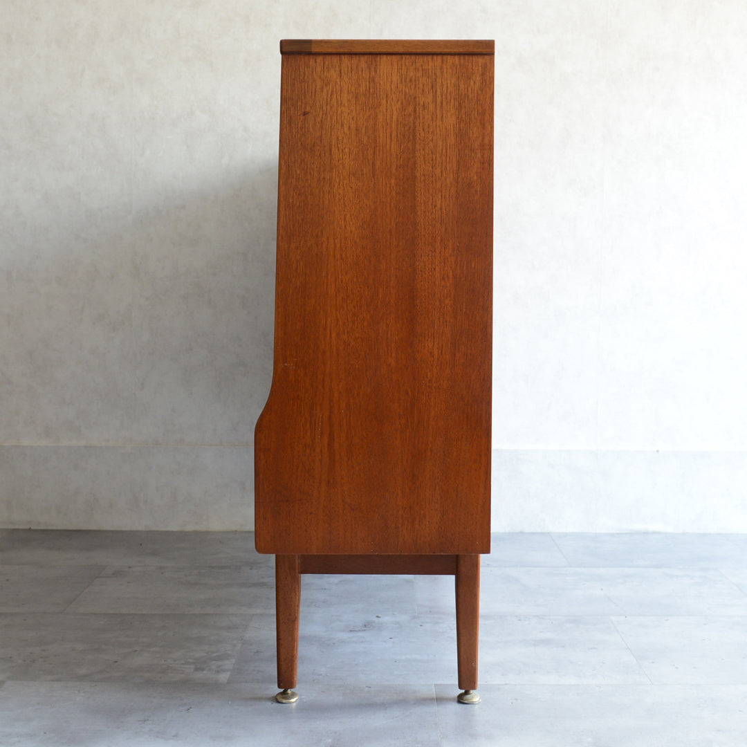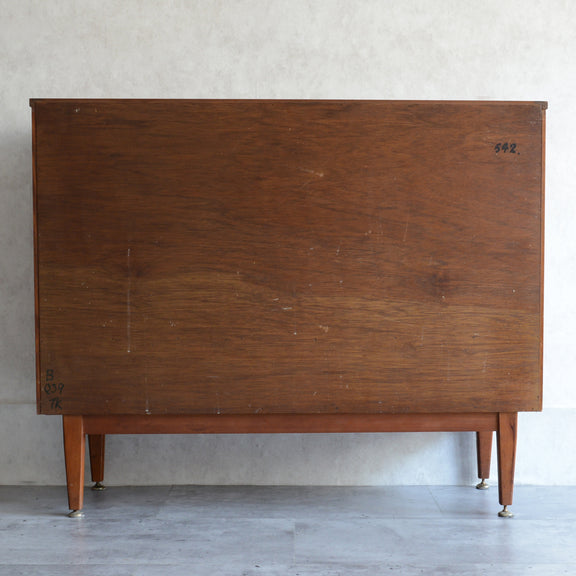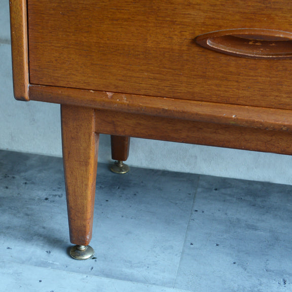ジェンティーク独特の葉っぱの様な抽斗の把手と、金属が付いた脚部がミッドセンチュリーらしいコンパクトなキャビネット