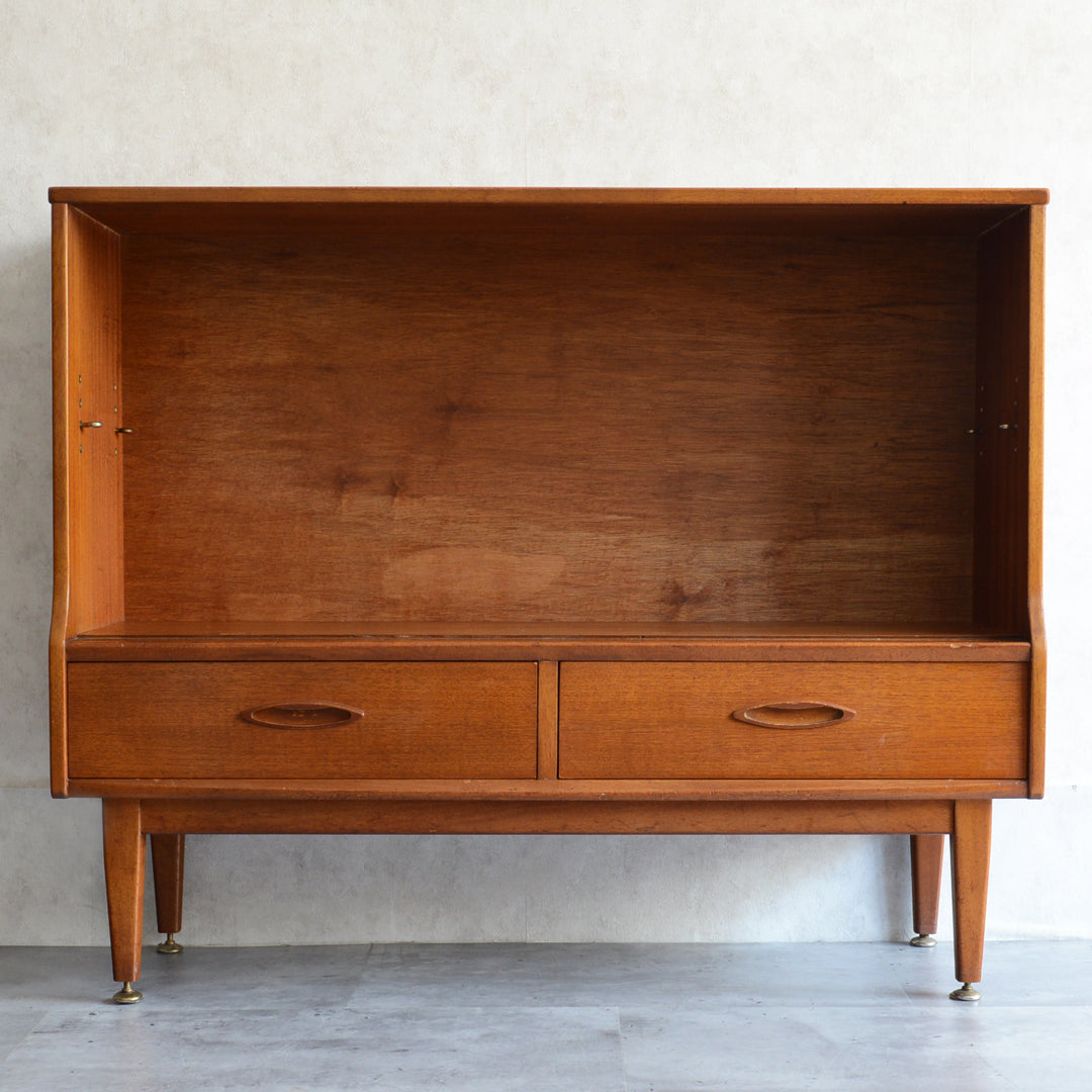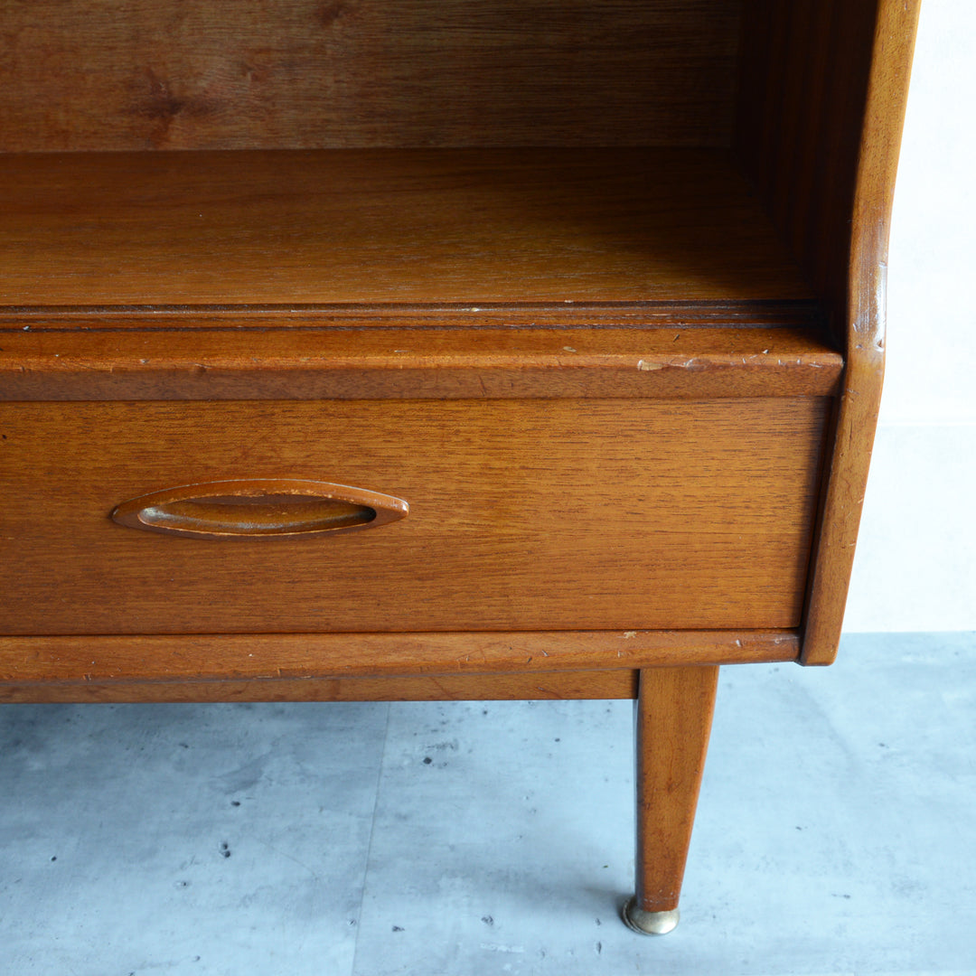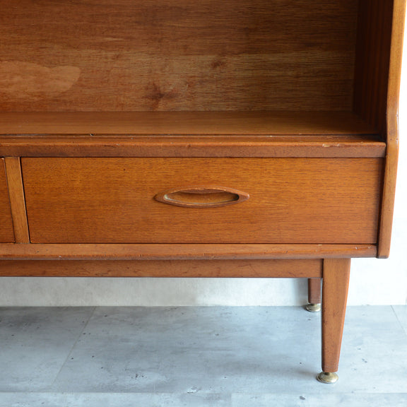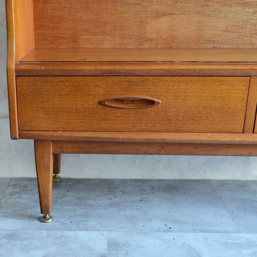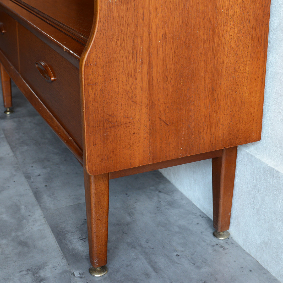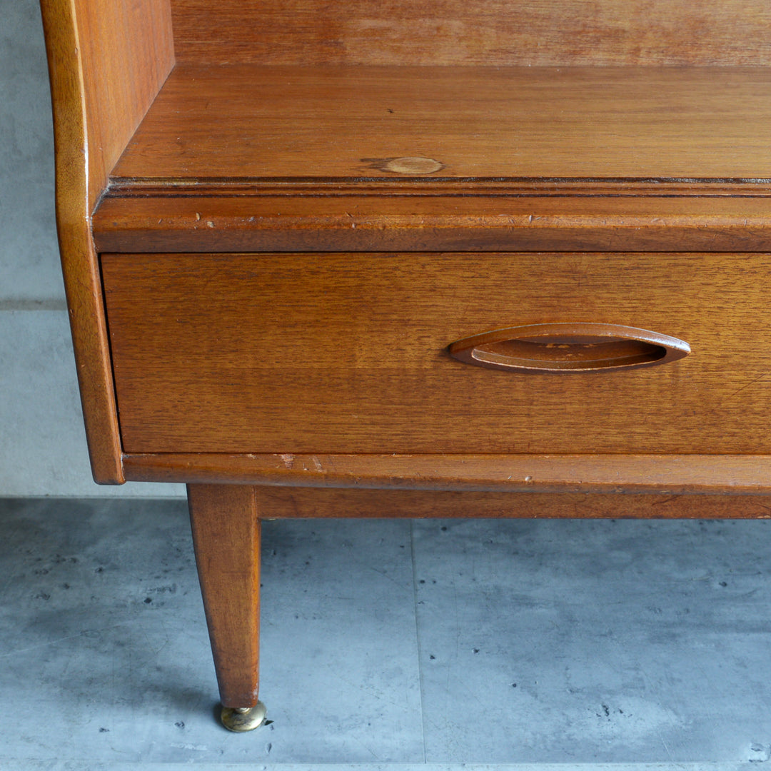 ジェンティーク独特の葉っぱの様な抽斗の把手と、金属が付いた脚部がミッドセンチュリーらしいコンパクトなキャビネット