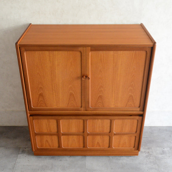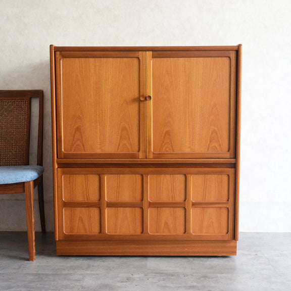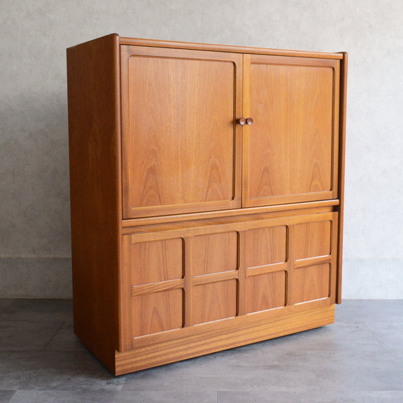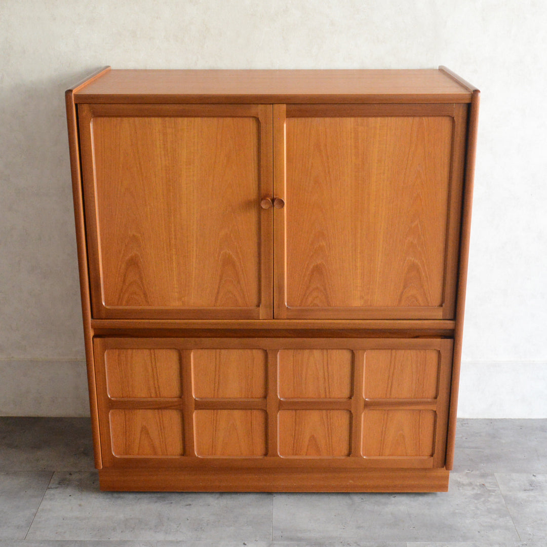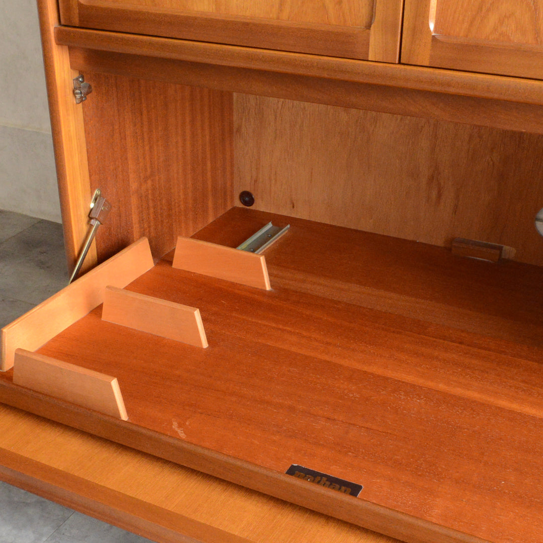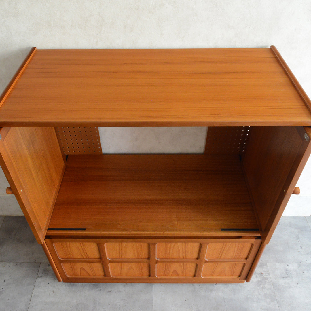 英国製キャビネットの傑作として知られるNathanが、美しく仕上げたミッドセンチュリーのテレビキャビネットです。上段はインセットスライドドア機構を備え、下段のAV機器用の収納もスムーズで省スペースな出し入れが可能です。