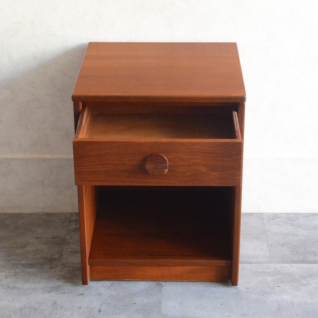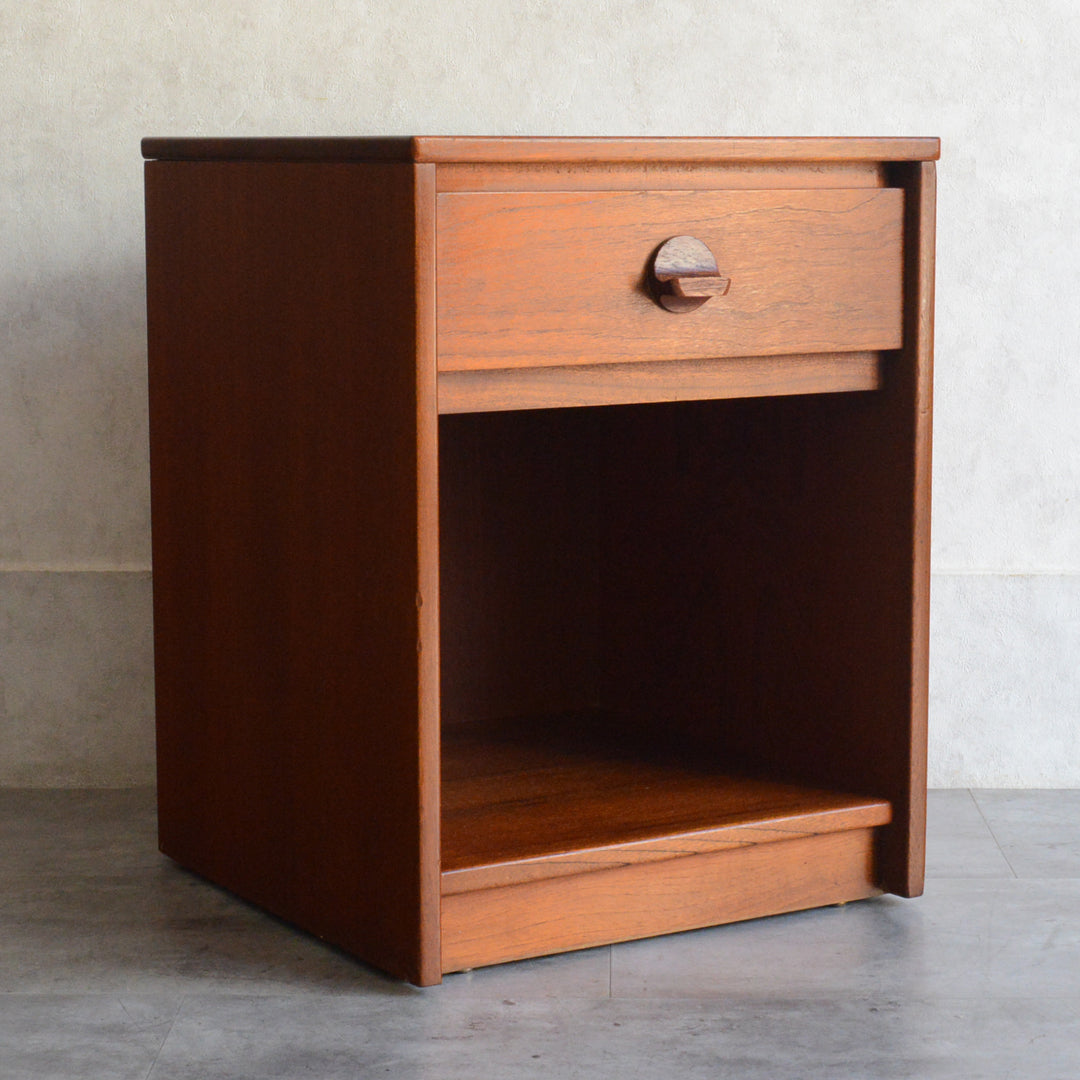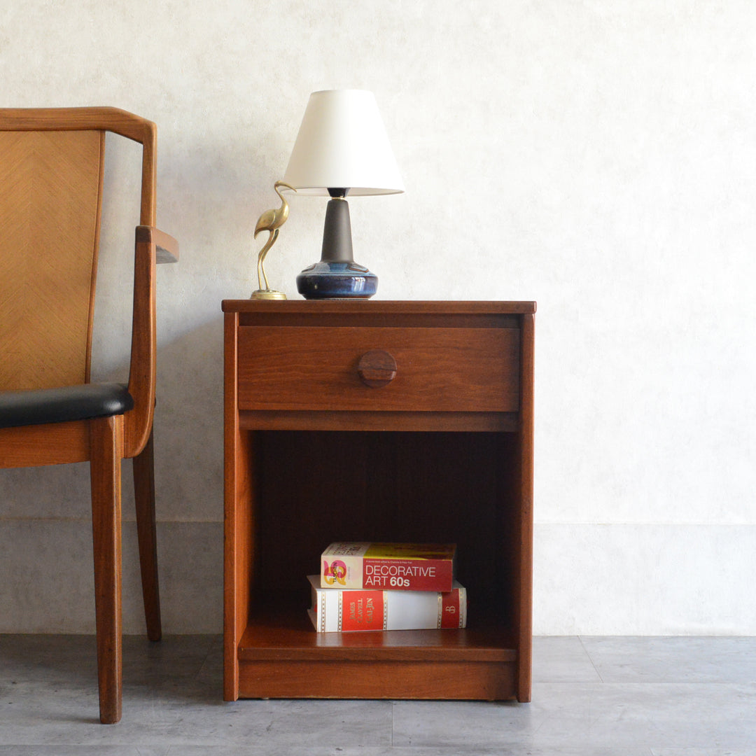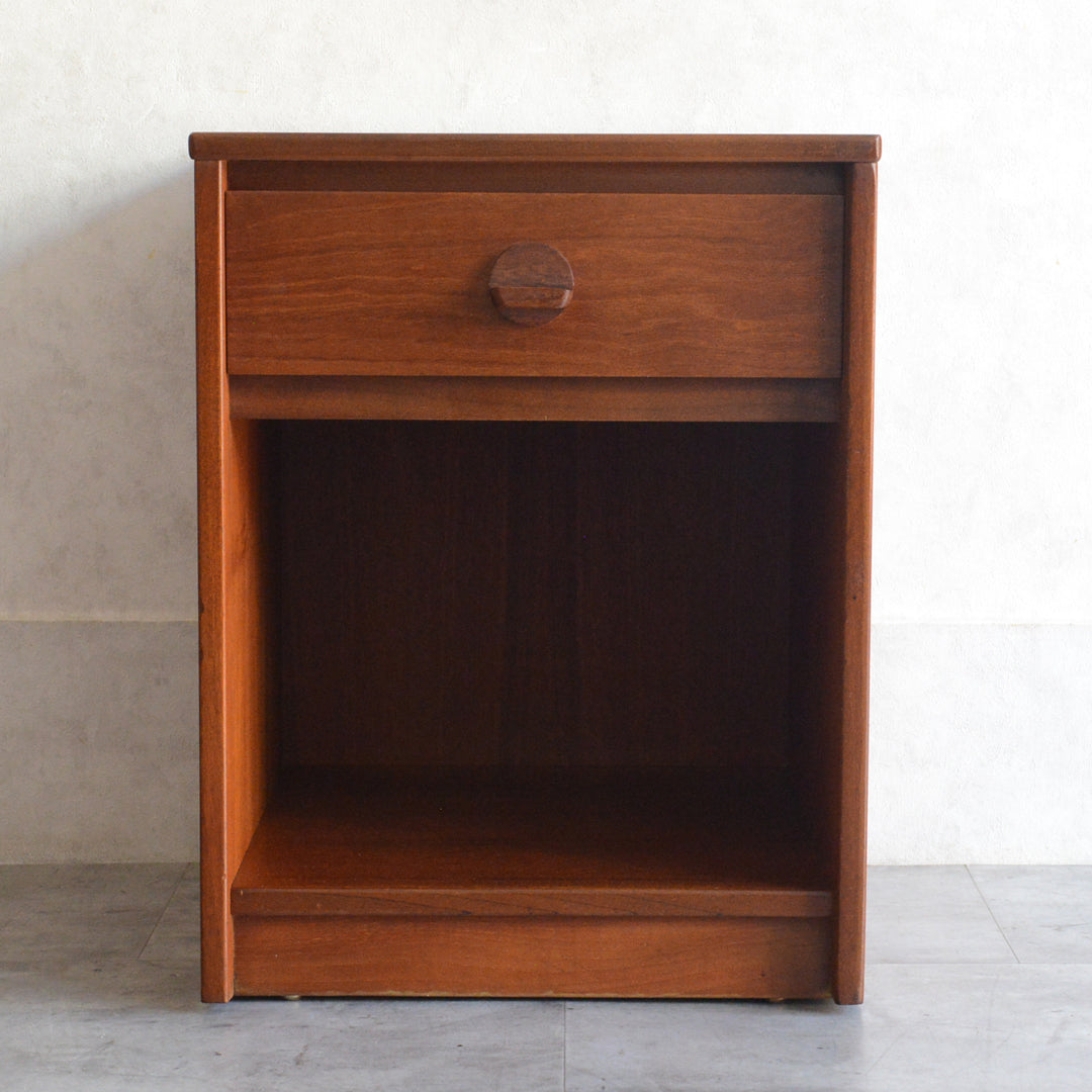 イギリスヴィンテージ シンプルなデザインですが、引き出しの取っ手がチークを彫り出したSTAGらしい形をしています。 リビングでもベッドサイドでも使い勝手の良いサイズです。